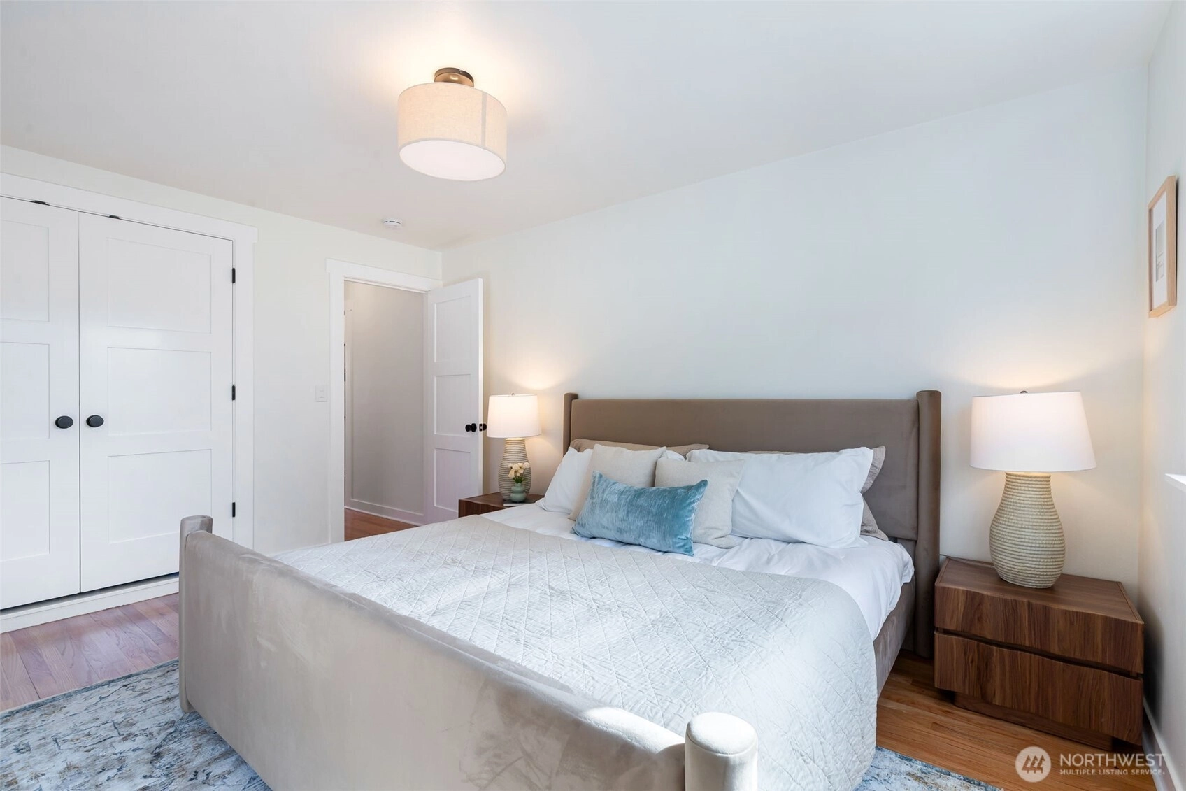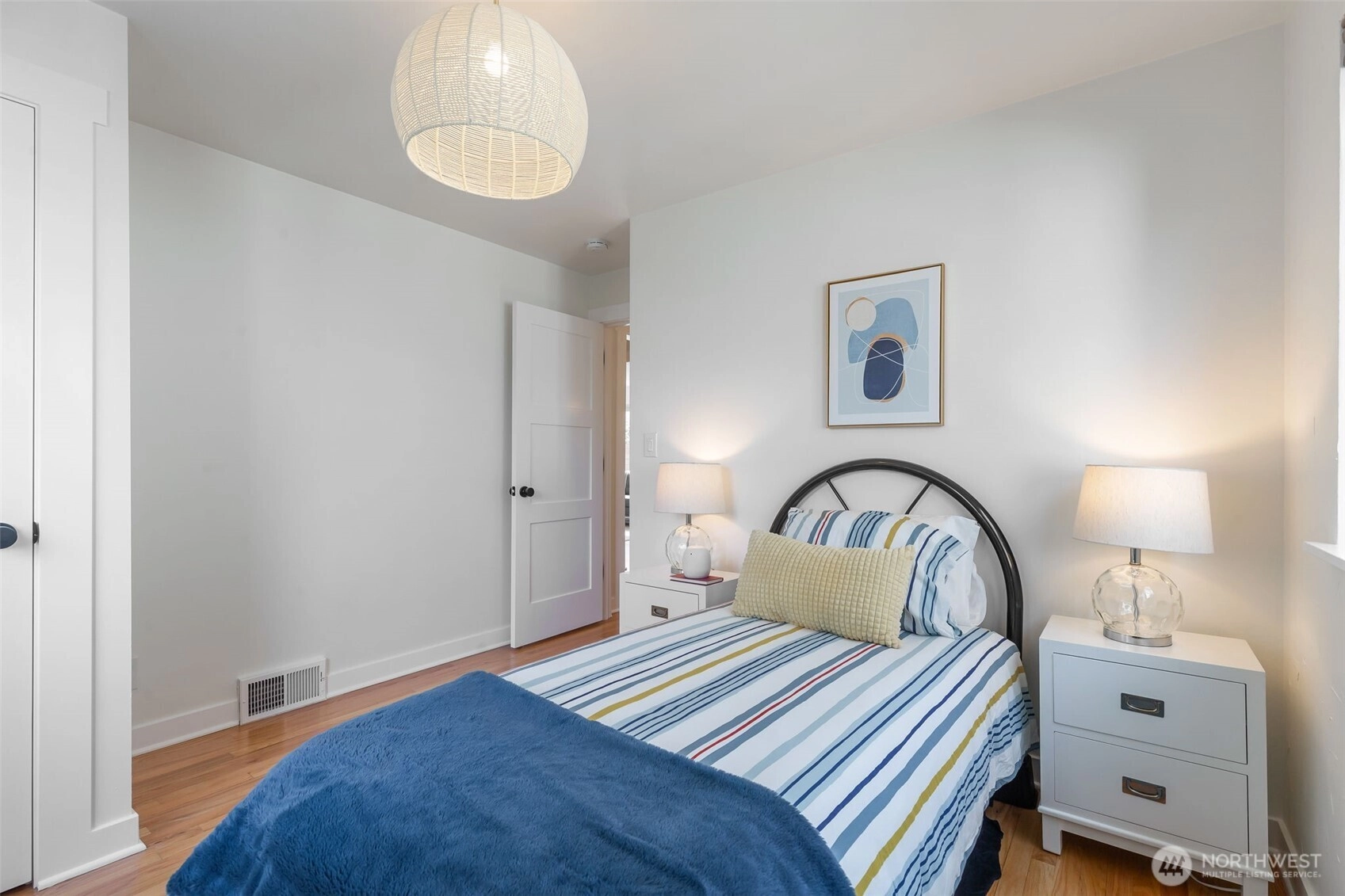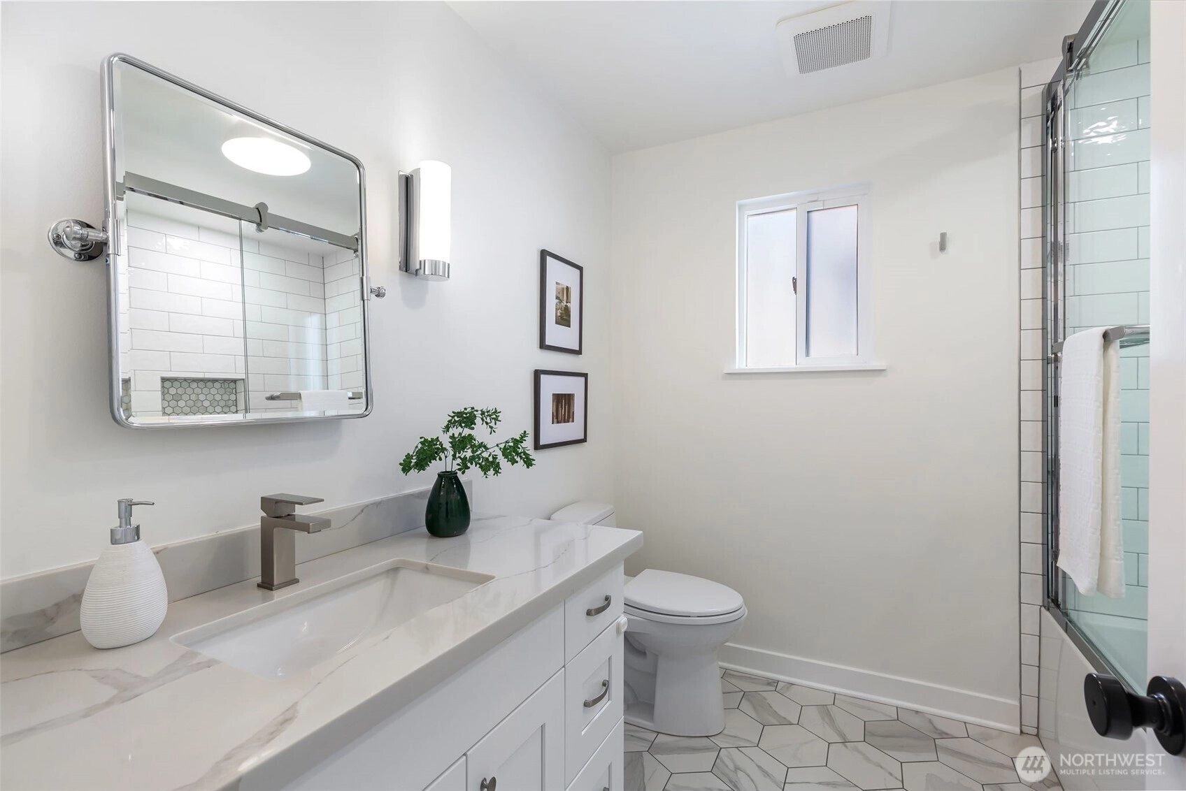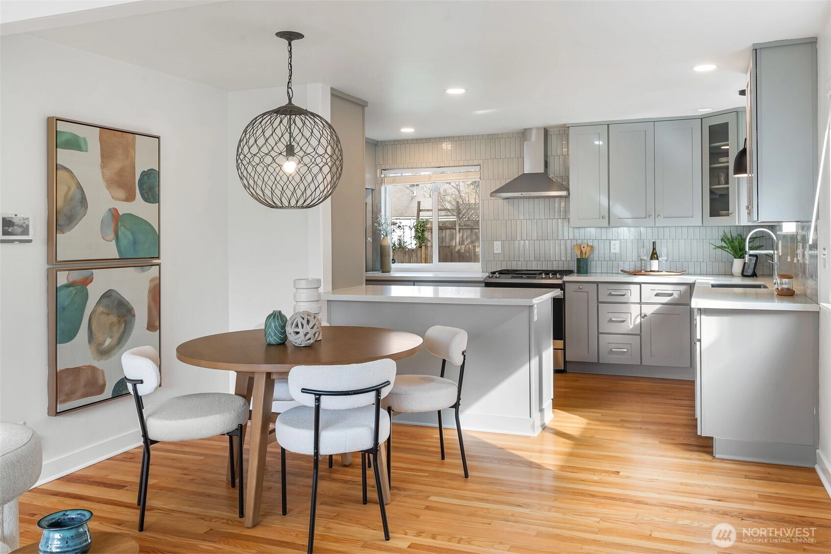 This 1949 classic has been updated with a comprehensive main-level remodel that balances original character with modern functionality. The renovation features a completely updated kitchen and bathroom with contemporary finishes, refinished hardwood floors, and a new fireplace surround that serves as the living room’s focal point.The thoughtful circular floor plan is filled with natural light from large picture windows. The layout offers excellent flexibility: two bedrooms and a full bath occupy the upper level, while the lower level—with its own separate entrance—features a primary suite with an expansive bathroom. This lower level is also well-suited for a guest suite or potential mother-in-law unit.Outside, the nearly 4,000-square-foot lot includes a large patio for entertaining and established landscaping. Located on a quiet, tree-lined street, you are minutes from the shops and dining of Ballard and Fremont, as well as Woodland Park, Green Lake, and Phinney Ridge. A one-car attached garage provides additional storage and convenience.