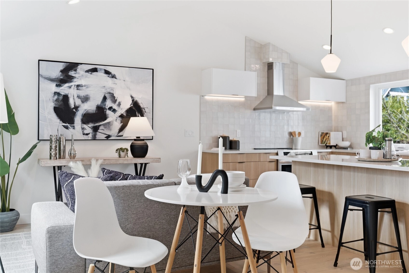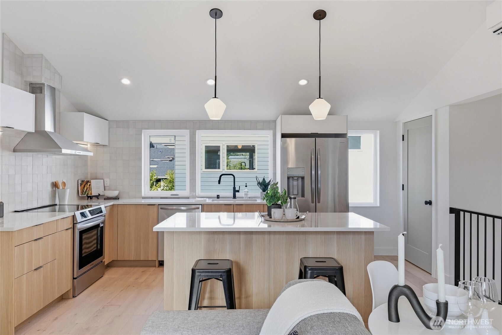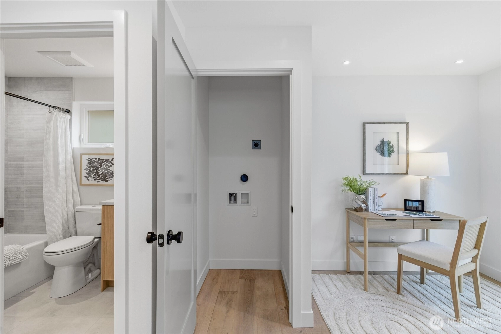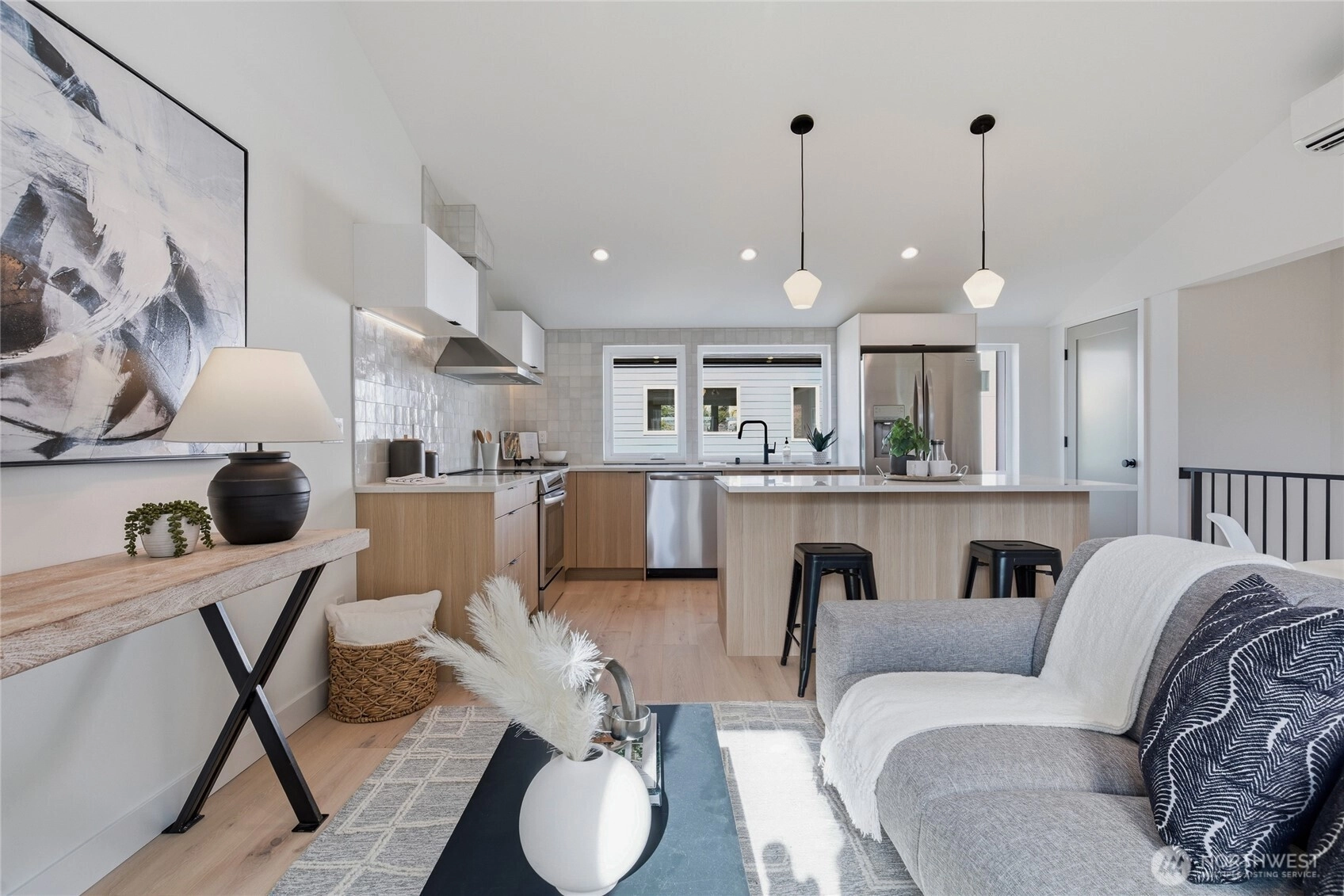 Sophisticated Ballard detached cottage offering 1,057sf of thoughtfully designed living space plus a heated 208sf garage/flex room. This 2-bedroom, 2-bath home features a dedicated office—ideal for remote work or creative pursuits. Soaring ceilings and generous windows flood the interior with natural light, while premium finishes elevate everyday living. Enjoy Bellmont cabinets, engineered hardwood throughout (no carpet), and heated floors in both bathrooms. Mini-split A/C in every room provides year-round comfort. The primary bathroom includes motion sensor lights and a dedicated bidet outlet for modern convenience. The heated garage offers flexible space for parking, storage, or a hobby room. Private backyard retreat with easy access to NW 65th dining and Downtown Ballard—88 Walk Score and 95 Bike Score. Quick routes to Golden Gardens and 15th/99 for SLU/Downtown commutes. Top-ranked schools!