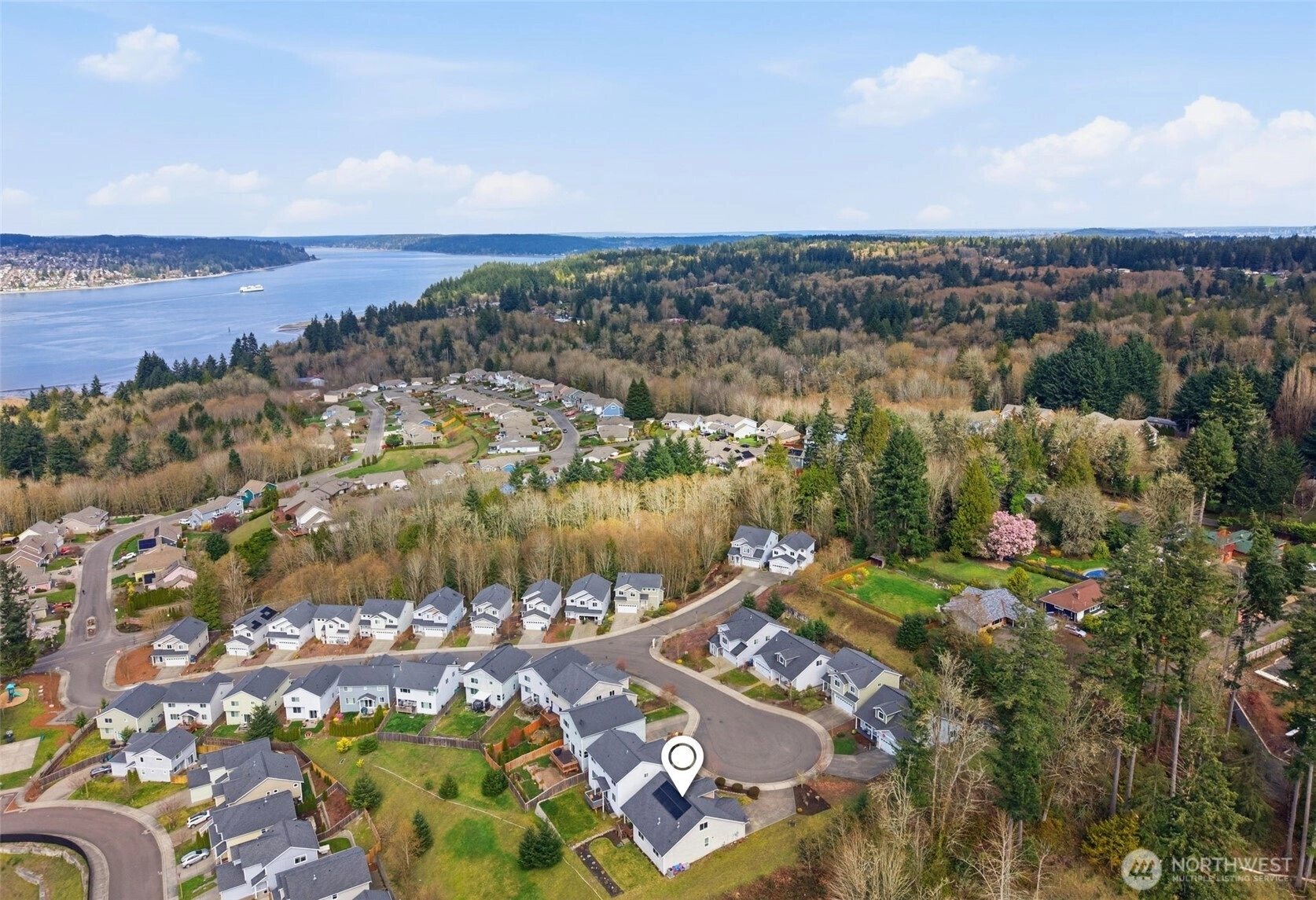 Set in an elevated position with sweeping Olympic Mountain views, this light-filled residence captures the essence of refined Northwest living. Designed for everyday ease, the home features a highly sought-after main-level primary suite, while vaulted ceilings and 9-foot ceilings throughout the main level create a sense of volume and openness. Expansive windows bring in natural light, and seamless flow connects the kitchen, living, and outdoor spaces, with a private greenbelt backdrop enhancing the sense of calm and retreat. The kitchen offers granite countertops, gas cooking, and a generous island, opening to both a dining area and breakfast nook with direct access to the covered deck; creating an effortless indoor-outdoor connection. Upstairs, additional bedrooms and flexible loft space provide room for guests, work, or evolving needs. Thoughtfully designed with no-step access from both the garage and front entry, the home supports long-term comfort and livability. Additional features include a gas fireplace, energy-efficient heat pump, and solar panel system designed to help reduce utility costs with potential for energy credits. Located just 2.4 miles to Port Orchard’s waterfront, shops, and restaurants, and approximately 12 minutes to the Southworth Ferry for access to Seattle. A rare combination of views, main-level living, and privacy in a setting that feels both connected and removed.
