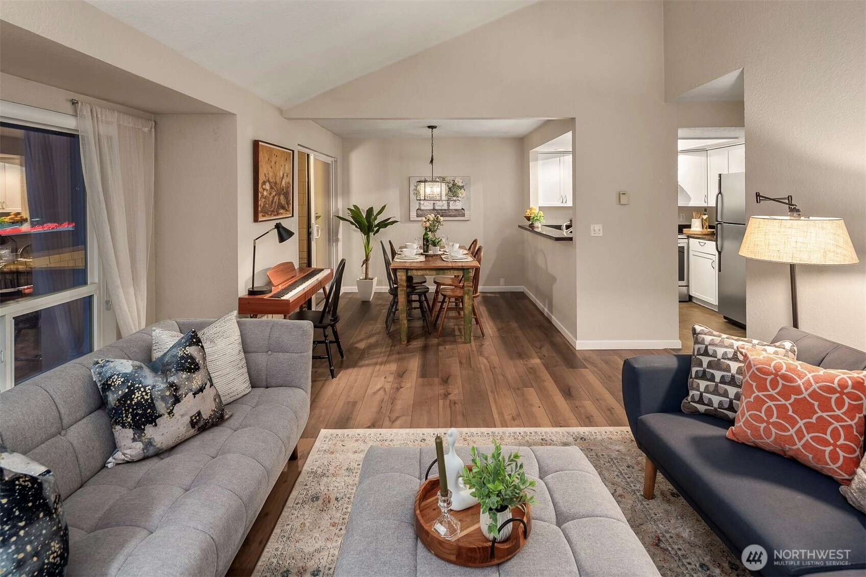 Come and get it! Beautifully maintained 2-bedroom, 2-bath condo in desirable Compton Court, in Bellevue. This light-filled, south-facing home features vaulted ceilings and a bright, open living space. The kitchen is beautifully updated with granite tile counters, new stainless steel sink and appliances. New wide plank laminate flooring throughout. Sharp! The Primary Suite is complete with a lovely 3/4 bath and a large walk-in closet! Situated on a quiet cul-de-sac less than a block from Odle Middle School and within one of the most highly rated school districts in our region - Bellevue Schools. This home includes two covered parking spaces (rare) #7 and #8, that are closely situated to the home - right out front, in fact. The parking lot was just newly paved and fully fenced and is beautifully refreshed. All the windows are updated with vinyl sash, offering the highest level of insulation available. This home boasts solid, quality construction with timeless materials. Exceptionally well cared for and move-in ready. East facing front door! Convenient location close to Lake Hills Native Growth Protected area with secluded forested trails around Larsen Lake. Right next to the Bellevue Aquatic Center and includes access to the tennis courts, baseball/football fields and running track. Excellent proximity to the Kelsey Creek Park and Glendale Country Club! Plenty of shopping, dining, and everyday amenities quite nearby!