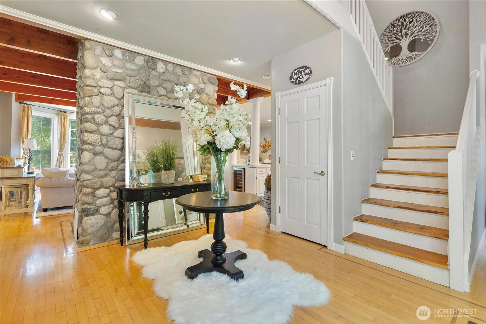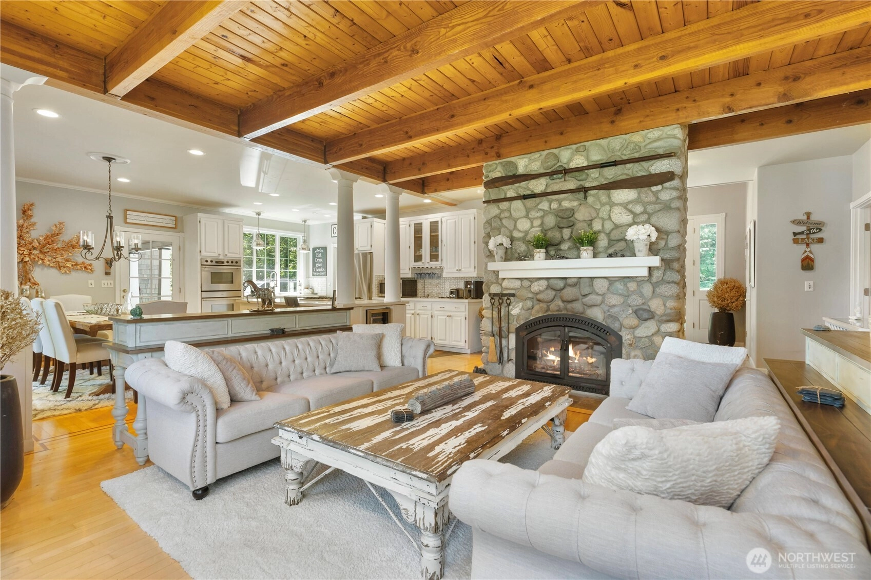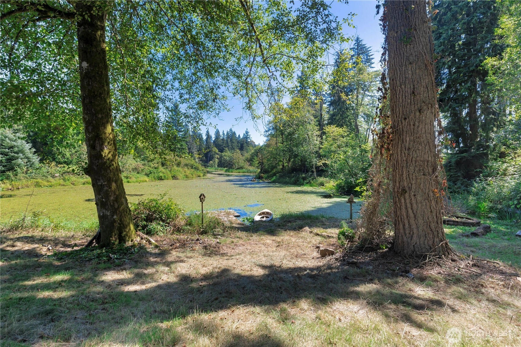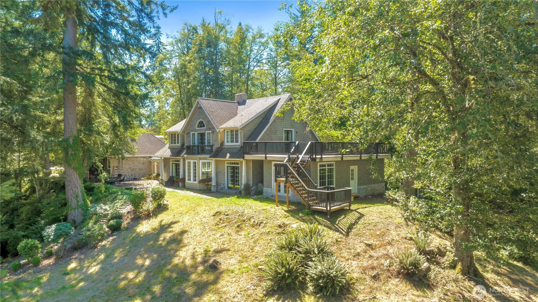 Tucked into a private, wooded setting overlooking a tranquil pond, this 4-bed, 3.5-bath home offers a unique combination of privacy and accessibility just minutes from town. Vaulted ceilings and a floor-to-ceiling stone fireplace anchor the main living area, with large windows providing abundant natural light. The layout includes multiple living areas for flexible use. The primary suite features a spacious layout with an updated bath, including a walk-in glass shower and soaking tub. Additional bathrooms have been updated with modern finishes. The kitchen includes granite countertops, stainless steel appliances, and ample storage, flowing into adjacent dining and living spaces. An expansive deck extends the living space outdoors, ideal for year-round use and overlooking the surrounding trees and pond. A detached cottage provides additional finished space suitable for guests, office, or studio use. The property offers a balance of indoor and outdoor living with a functional layout and versatile spaces.
