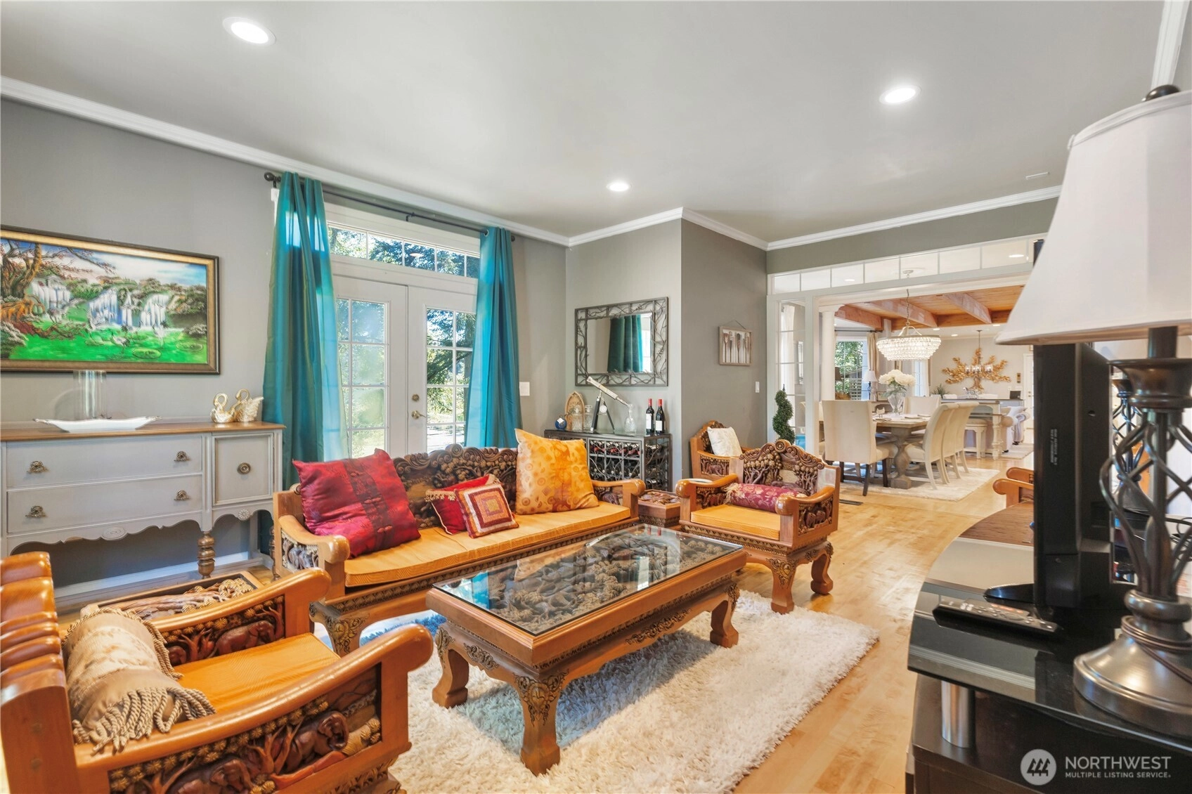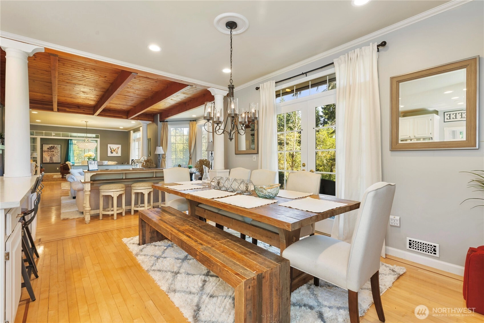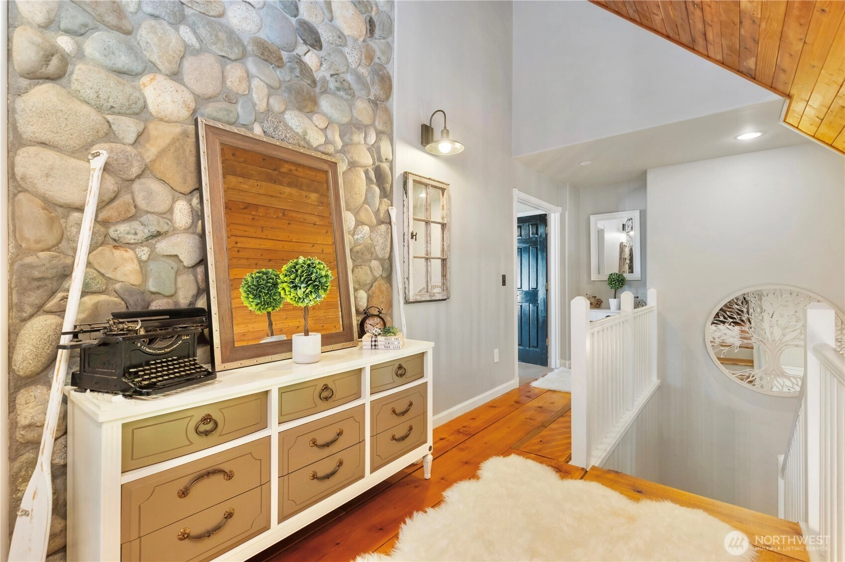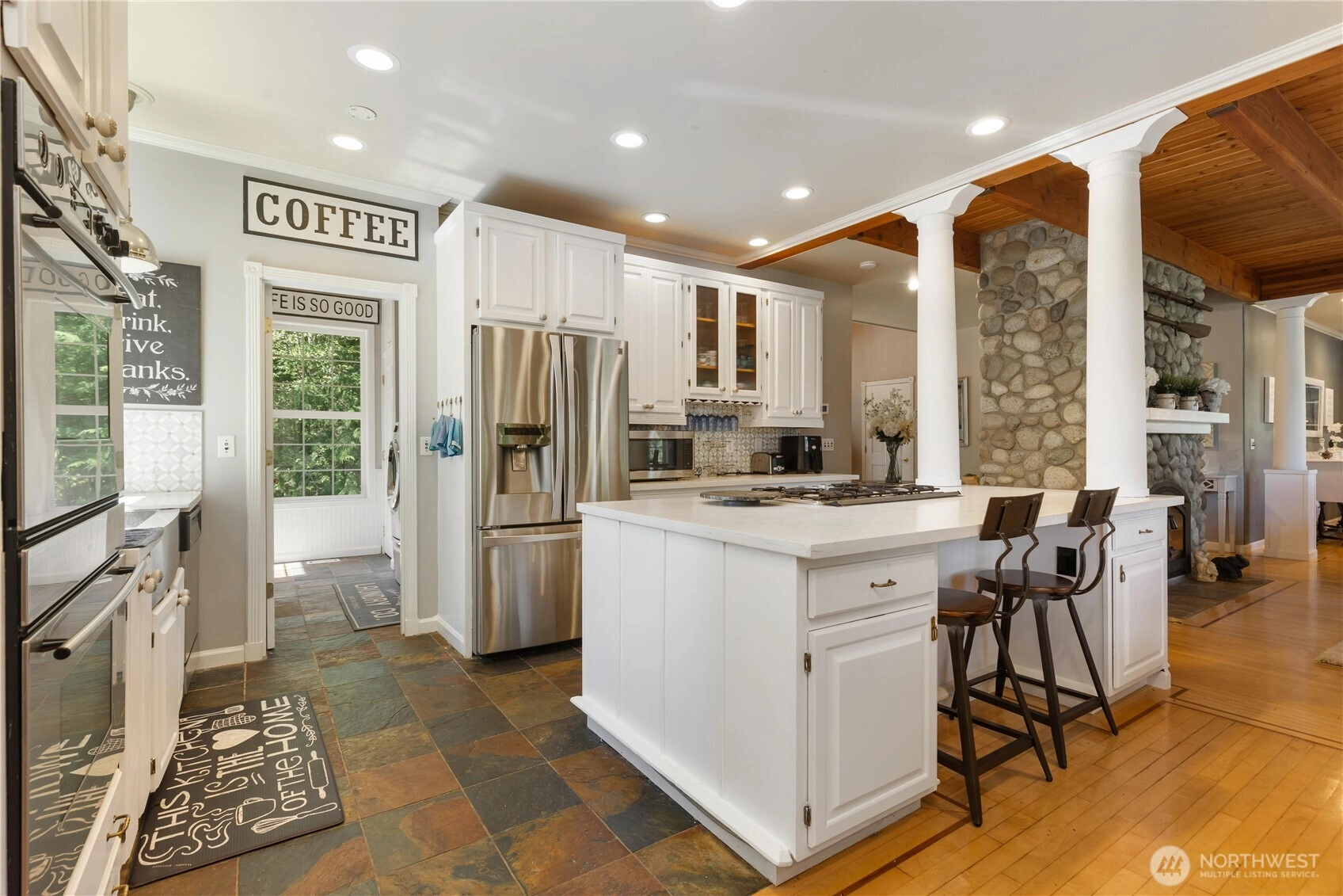 Tucked into a private, wooded setting overlooking a tranquil pond, this 4-bed, 3.5-bath home offers a unique combination of privacy and accessibility just minutes from town. Vaulted ceilings and a floor-to-ceiling stone fireplace anchor the main living area, with large windows providing abundant natural light. The layout includes multiple living areas for flexible use. The primary suite features a spacious layout with an updated bath, including a walk-in glass shower and soaking tub. Additional bathrooms have been updated with modern finishes. The kitchen includes granite countertops, stainless steel appliances, and ample storage, flowing into adjacent dining and living spaces. An expansive deck extends the living space outdoors, ideal for year-round use and overlooking the surrounding trees and pond. A detached cottage provides additional finished space suitable for guests, office, or studio use. The property offers a balance of indoor and outdoor living with a functional layout and versatile spaces.