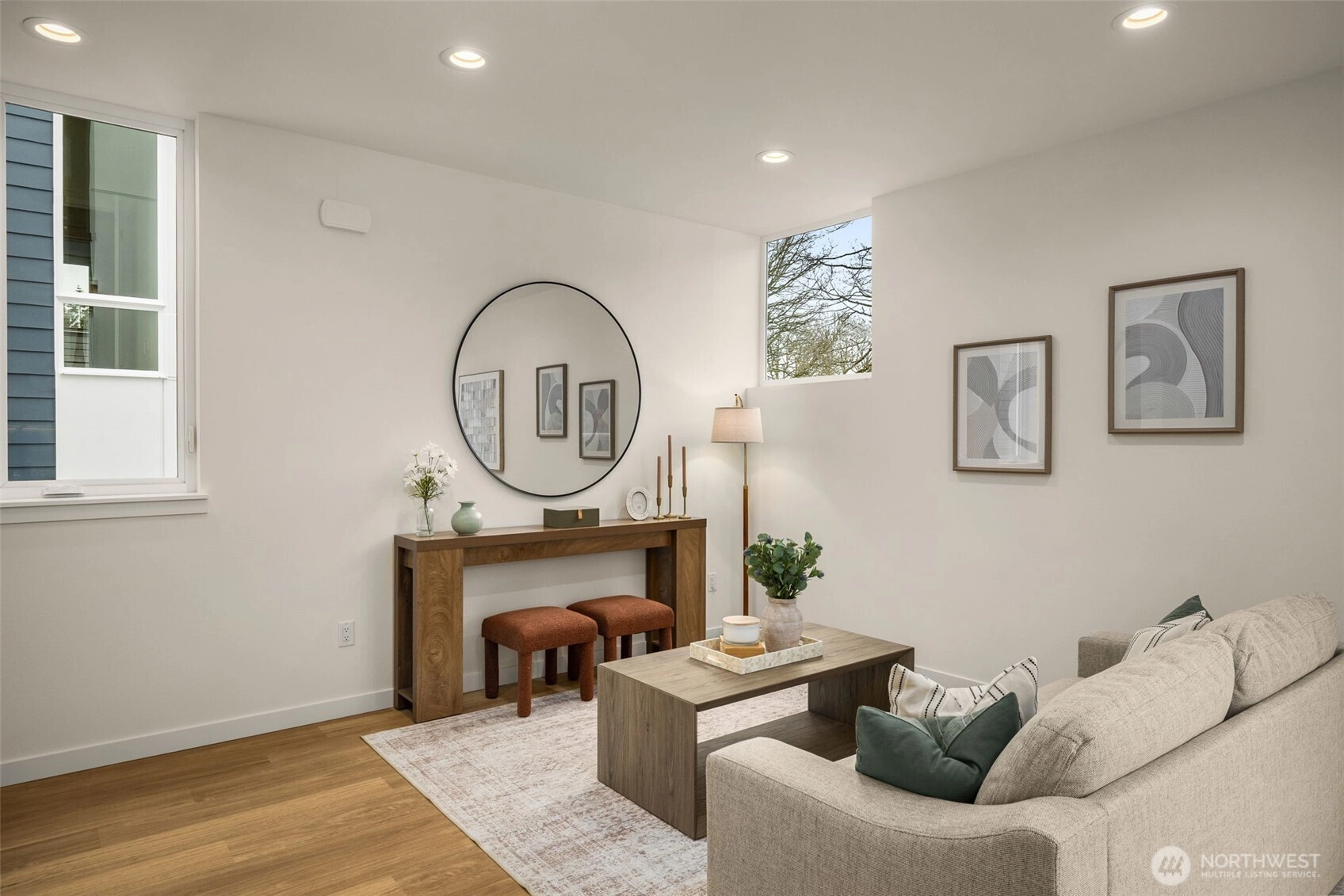 Exceptional new construction by Blackwood Homes at Dogwood Hollow, offering a thoughtfully designed multi-level home that balances modern comfort with functional, everyday living. This home offers intentional separation of living and sleeping spaces, providing flexibility for everyday routines, working from home, and hosting guests. The main living level features an open-concept kitchen, dining, and living area filled with natural light and designed for seamless flow and connection. The kitchen is centered around a spacious quartz island with generous prep space and seating, making it ideal for both casual dining and entertaining. The lower level includes two well-sized bedrooms and a full bath, offering versatile space for guests, office use, or additional living needs. The upper level is dedicated to a private primary suite complete with a walk-in closet and a thoughtfully designed ensuite bath, creating a comfortable and private retreat. A rooftop deck extends the living space outdoors, providing an inviting setting for relaxing, entertaining, or enjoying city and territorial views. EV-wired dedicated parking space, smart storage solutions, and quality finishes throughout. Conveniently located directly across from Brighton Playfield, and near Genesee Playfield, neighborhood cafes and restaurants, the Columbia City Farmers Market, light rail access, and quick access to I-5 and I-90.