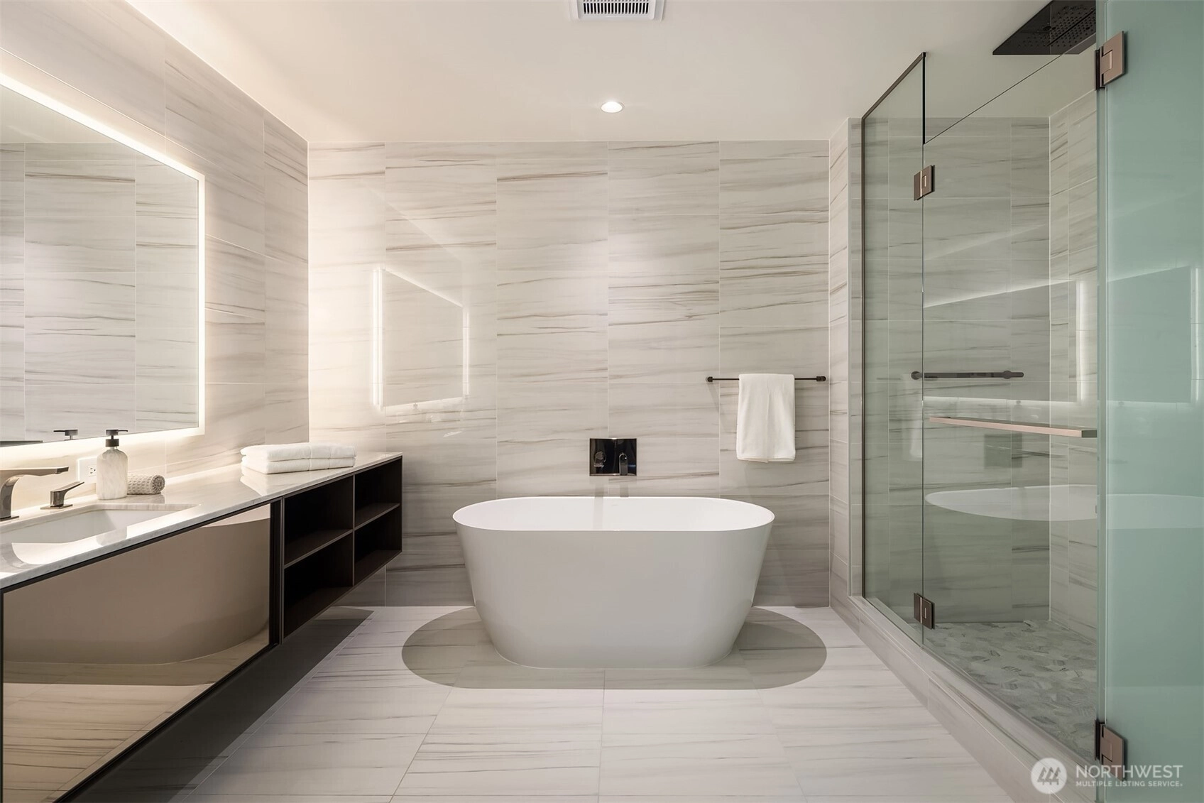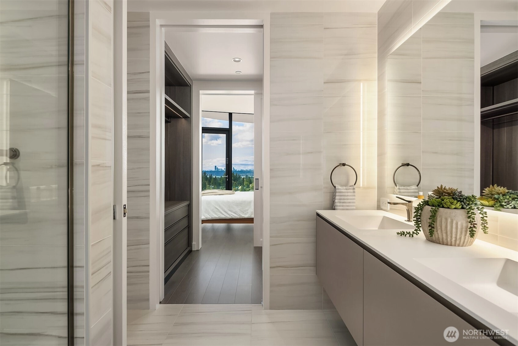 Luxury, light, location & iconic views in architecturally stunning Avenue Estates. Avenue is redefining urban sophistication in a dream location just steps to Bellevue’s world-class shopping & dining district. Unit 1701 is a contemporary vision with floor-to-ceiling windows framing spectacular southwestern views of Lake Washington, the Seattle city skyline and Olympic Mountains. The light-filled, 1,716 square foot open floor plan is centered around the view with an Ernestomeda-crafted gourmet kitchen providing ample storage and high-end appliances. Two view bedroom suites boast walk-in closets and spa-like baths with materials reflecting the beauty of the Pacific Northwest. The wrap-around deck provides a stellar perch for soaking in sunshine and sunsets. Gorgeous common areas with lounges, decks, kitchen, state-of-the-art fitness room, and dog area. Two parking spots in the secure garage (one with EV charger) plus a coveted storage unit. An exciting, comfortable lifestyle awaits at Avenue Belleuve.