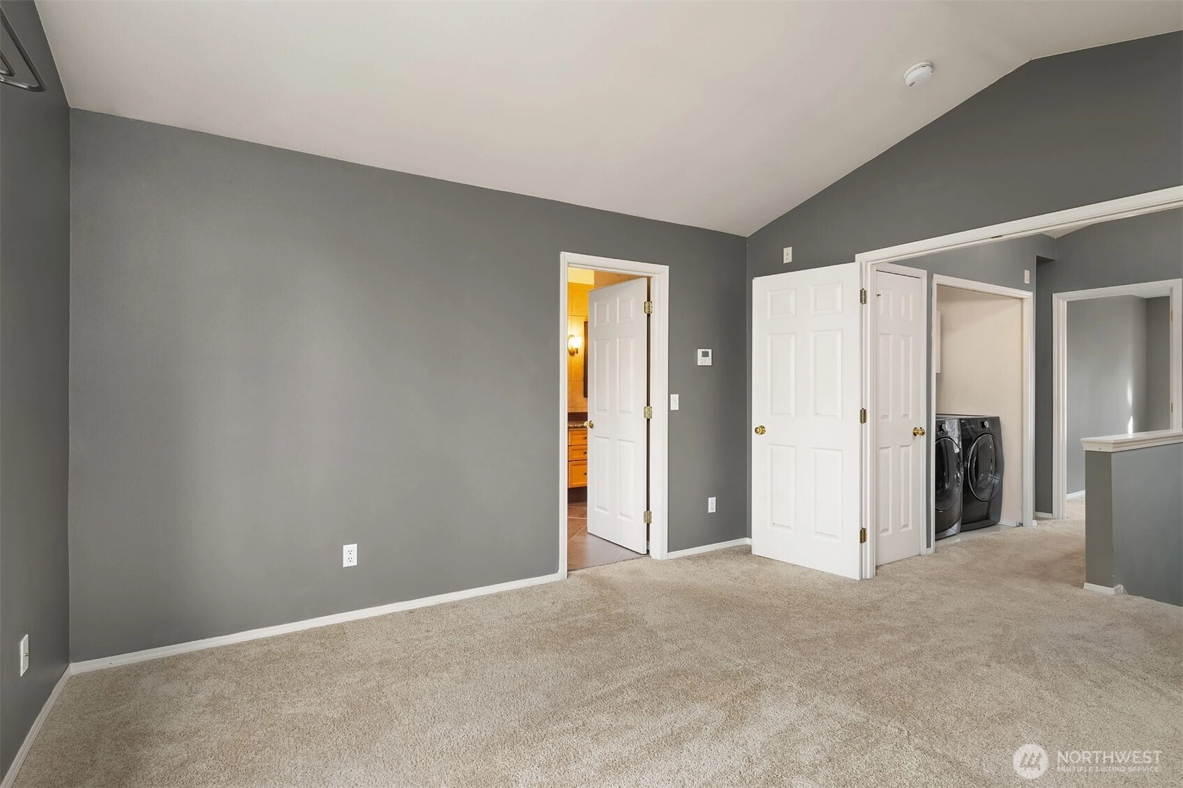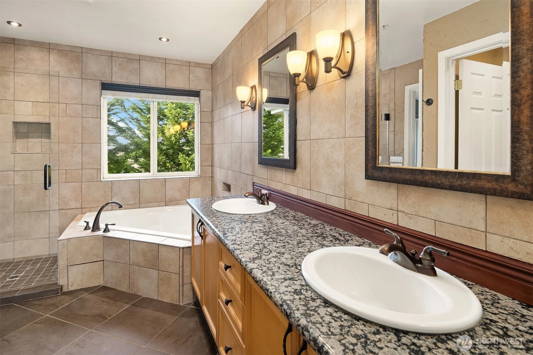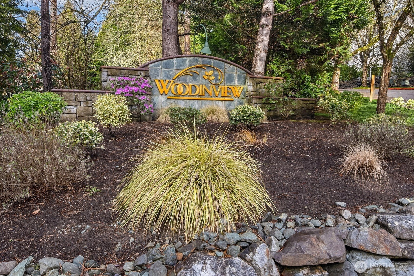 Tucked away townhome in sought-after Woodinview ~ Conveniently nestled between downtown Woodinville & downtown Bothell with rapid access to 405, this spacious 1,348sf two-story features 2 bedrooms, 2.5 baths, den/office & private garage with driveway parking. Spacious open floor plan backed to scenic evergreens with 9' tall ceilings, dramatic oversized windows & designer upgrades throughout. Covered porch opens to tiled foyer with walk-in entry closet. Updated kitchen with granite counters, full-height glass tile backsplash, large pantry & sprawling breakfast bar opens to formal dining, entertainment-sized balcony & grand living room with gas fireplace & cascading open staircase. Desirable double-door den & powder room on main make an ideal home office hideaway. Lofted upper hall with eclectic chandelier & well positioned laundry. Impressive double-door primary suite with cathedral ceilings, territorial views, walk-in closet with custom organizers & lavishly appointed 5-piece bath with corner soaking tub, frameless glass shower, 7' dual-sink maple vanity & extensive tiling throughout. Secondary suite with folding Murphy bed & attached bath with tiled surround & new LVP floors. Efficient gas furnace with heat pump & central A/C!