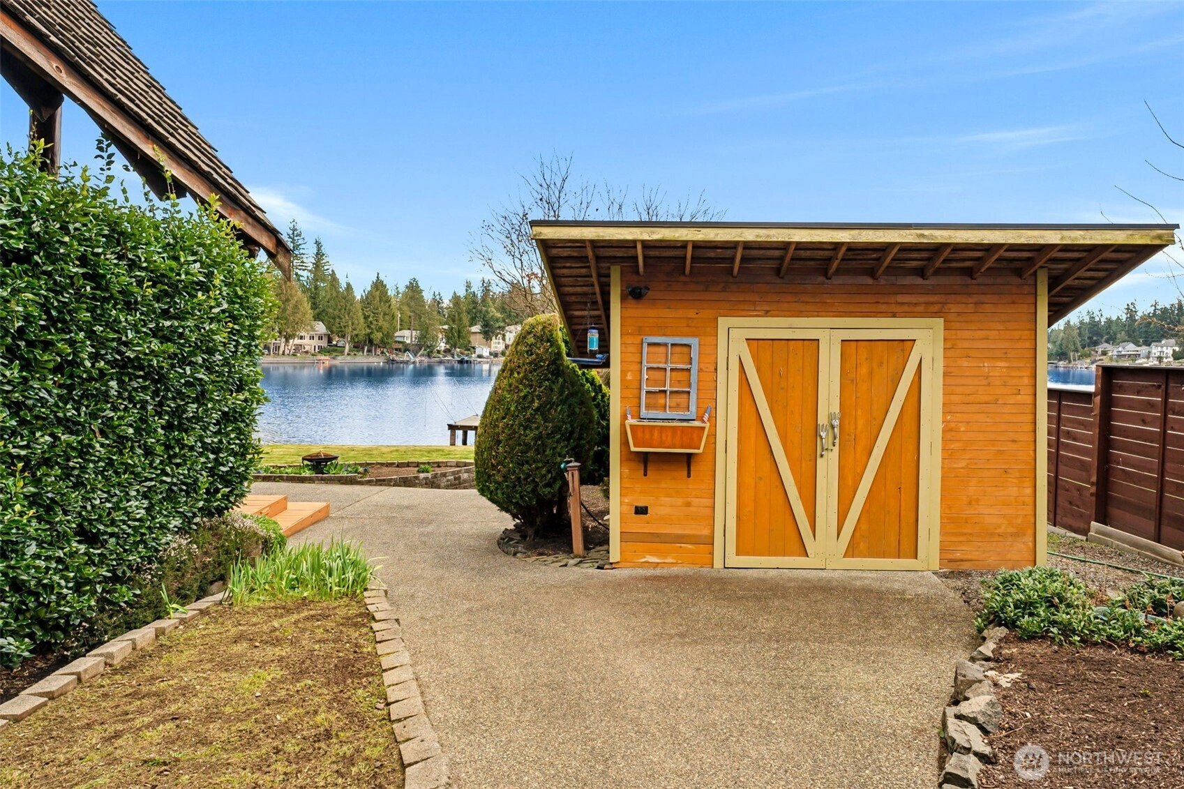 One of the most beautiful and rare waterfront properties available, the level shoreline creates effortless lake access and exceptional usability. The grandfathered boathouse provides private moorage and enduring waterfront value. Minimal wake preserves the peaceful, protected setting and enhances recreation. The stately presidential log home showcases soaring vaulted ceilings, dramatic wood detailing, and expansive windows that frame tranquil lake views while filling the home with natural light. Scandinavian-inspired design blends authentic Northwest character with refined modern elegance. The massive main-floor primary suite is a true retreat, featuring a private lakefront deck and a spa-inspired bath with elevated finishes. The expansive main deck is perfectly designed for large gatherings, sunset entertaining, and seamless indoor-outdoor living. The fully renovated kitchen is a chefs dream with double ovens and a five-burner gas range. Upstairs offers a spacious secondary primary suite, two additional bedrooms, and a generous loft with Mt. Rainer views. The expansive lower level provides versatile space for recreation, media, fitness, or additional living. An expansive flat lawn stretches to the water’s edge, creating sought-after level lakefront access. Three-car garage with additional storage, RV and boat parking, EV charging, green house, shed, and exceptional shoreline presence complete this extraordinary waterfront estate. Access to private park with boat launch.