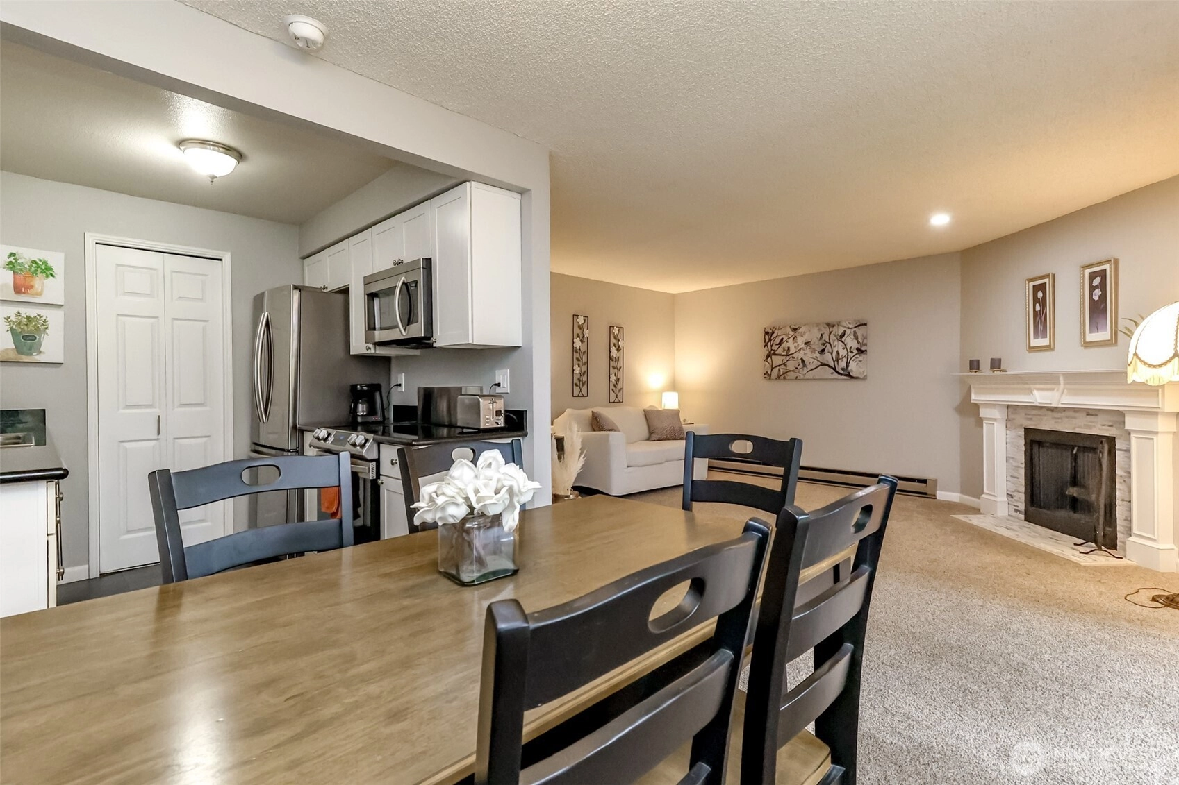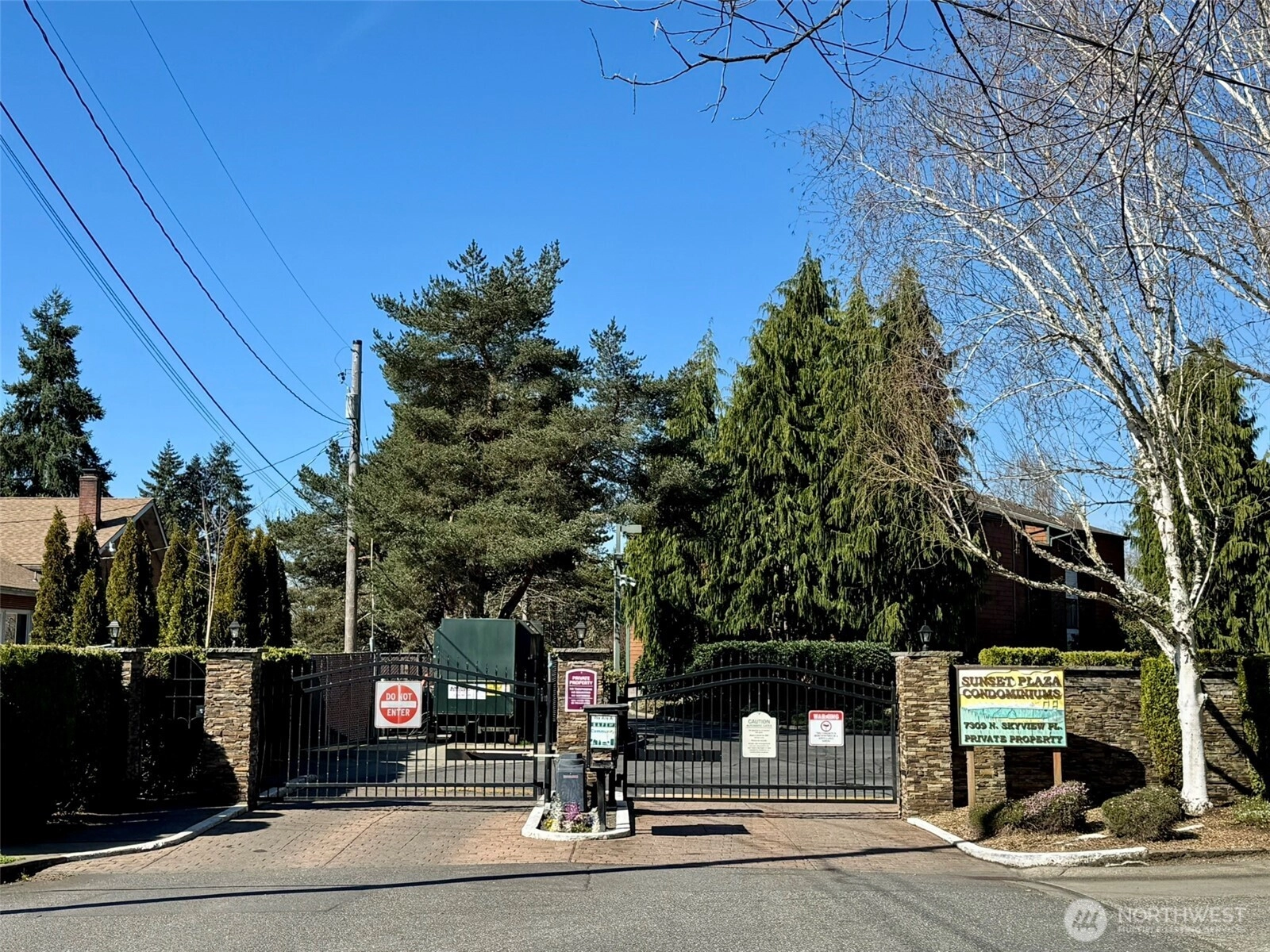 Well-maintained 2 bed, 1.5 bath condo with 1,026 sq ft in the gated Sunset Plaza community in desirable West Tacoma, ideally located between the vibrant 6th Ave District and scenic Titlow Beach & Park. This second-floor unit features a spacious open living and dining area centered around a cozy wood-burning fireplace, with sliding doors leading to a covered south-facing balcony with retractable sun shade overlooking a tranquil green space, perfect for relaxing outdoors year-round.The kitchen and bathrooms feature granite countertops, and the thoughtful layout includes two bedrooms and 1.5 baths. The primary suite offers a walk-in closet and a private bathroom with a shower/tub combination. The second bedroom also works well for guests, a home office, or hobbies.Additional highlights include a large laundry room with a washer & dryer and space for pantry storage, plus a generous storage room off the balcony.Residents enjoy a variety of amenities, including a clubhouse, exercise room, outdoor pool, hot tub, tennis court, fenced dog run, walking trails, and community garden.Convenient West Tacoma location near 6th Ave restaurants, local shops, grocery stores, parks, Tacoma Community College, and Titlow Beach. Easy access to Highway 16, the Narrows Bridge, and Narrows Park & Ride makes commuting simple. Includes reserved covered parking with additional guest parking nearby.