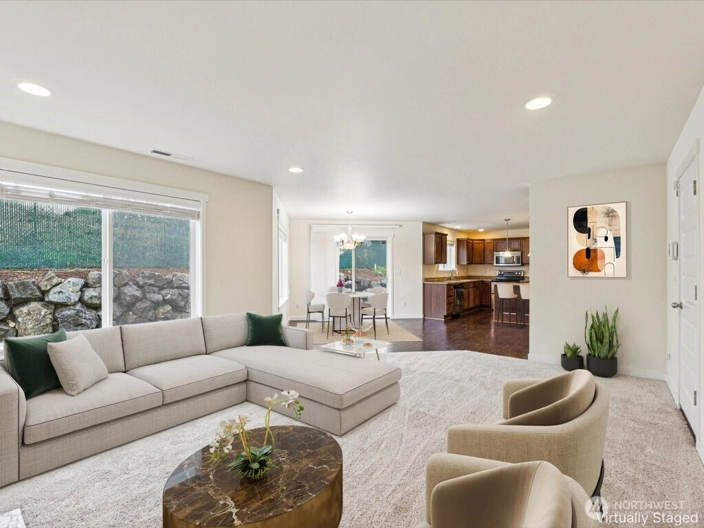 Welcome to Pasadera Heights, where thoughtful design and everyday comfort come together in the heart of Lake Stevens. This well-appointed 2,478-square-foot residence offers four spacious bedrooms and two-and-a-half bathrooms, providing a functional layout suited for both daily living and effortless entertaining. Inside, a bright and open floor plan creates a seamless flow between living spaces. The kitchen serves as the centerpiece with ample workspace and connectivity to the main living area, complemented by a cozy fireplace and clean architectural lines. An upper-level loft adds flexibility for a media space, office, or quiet retreat, while brand-new carpeting throughout enhances comfort and presentation. The backyard offers open outdoor space with room to personalize, whether for gatherings, gardening, or simply enjoying the surrounding setting. Located within the established Pasadera Heights community, this home delivers a practical balance of modern livability and convenient access to Lake Stevens amenities.