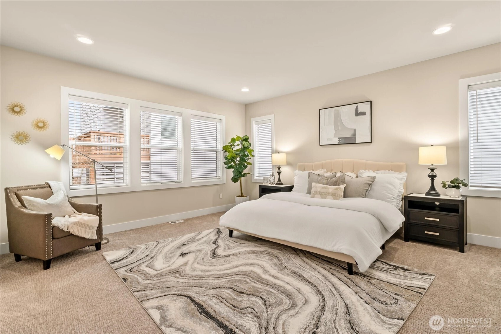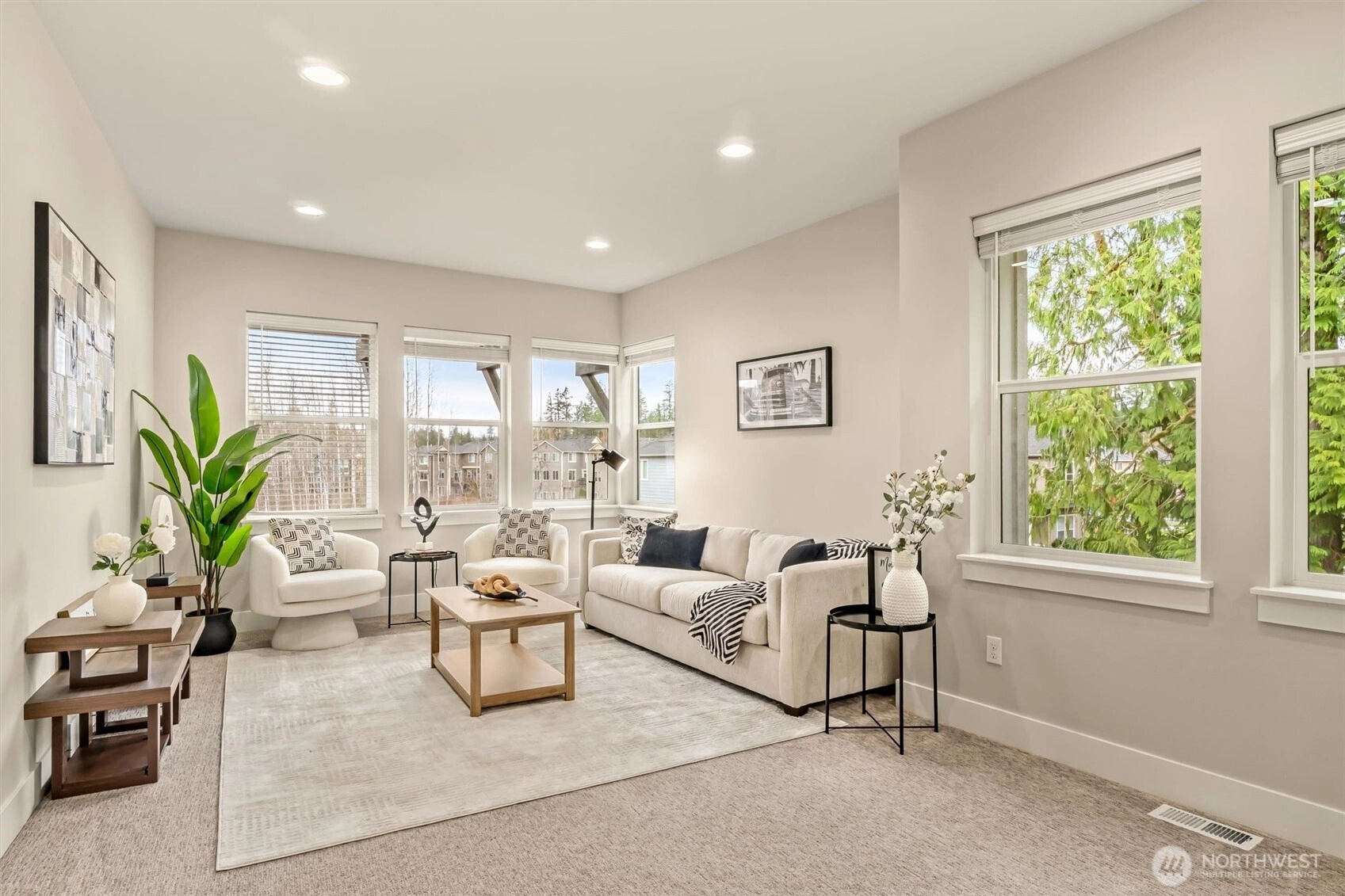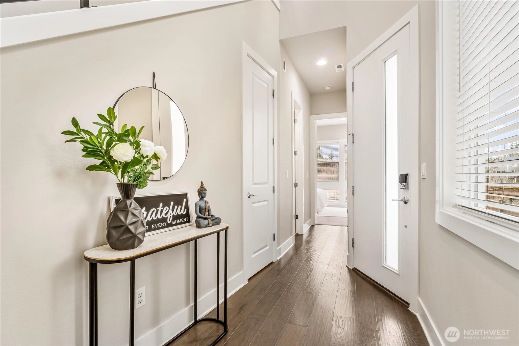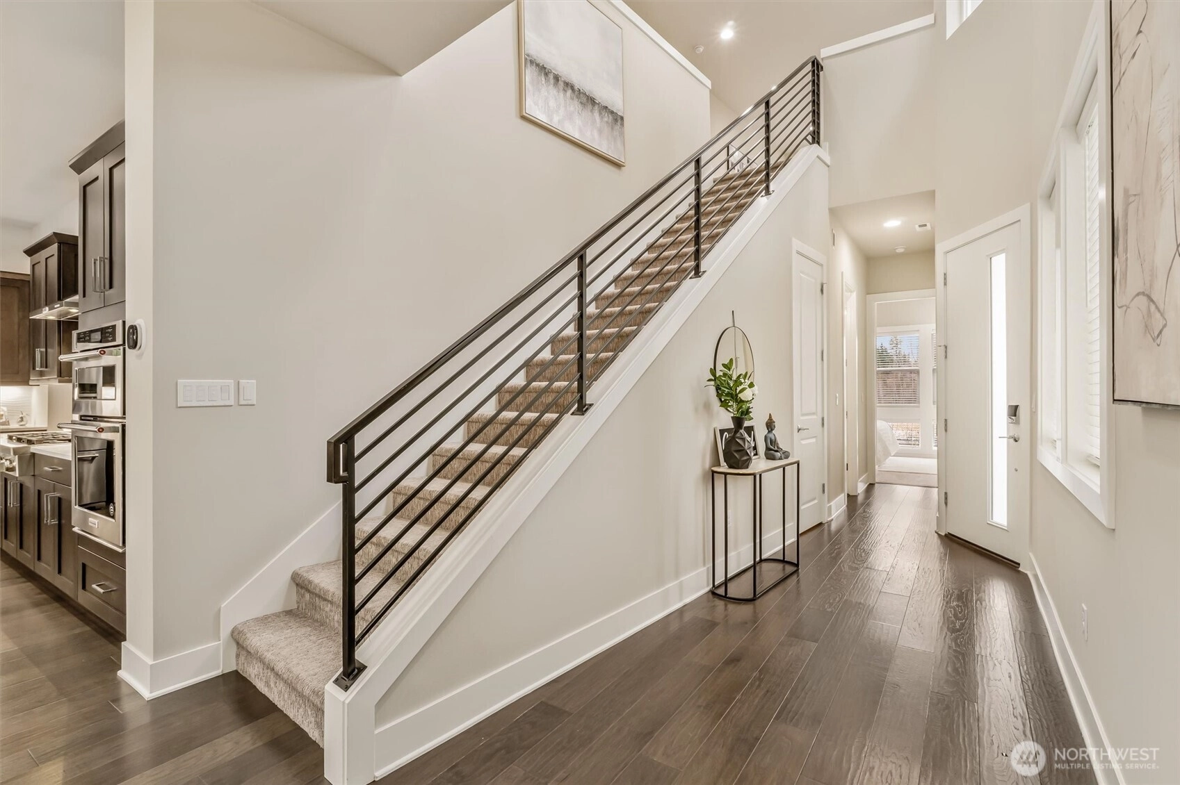Model-like, better-than-new smart home in the highly desirable Monarch Ridge neighborhood. Ideal Premium Corner lot, this 2020-built North-facing home with an East-facing main door entry— architecturally positioned to capture breathtaking natural light from every angle, where soaring ceilings, a dramatic wall of windows & absolute greenbelt privacy converge to create an unrivaled living experience that must be seen to be believed. A desirable wide-open layout w/ Main-level bedroom & full bath offers flexibility for guests, multi-gen living, or an office. Gourmet kitchen inspires with gleaming commercial-grade appliances, a walk-in pantry & coveted garage access — effortlessly presiding over the grand, light-saturated great room & dining area. Upstairs, retreat to an expansive primary suite featuring a spa-inspired 5-pc bath plus a large walk-in closet. Two additional well-proportioned bedrooms, a full bath, large laundry room w sink, & bright Loft space complete the upper level. Advanced smart-home features with high-speed cabling, smart switches, TV mount, Central A/C, Tankless water heater, Energy-efficient appliances, blinds throughout. Two-car garage w/ EV charging & storage racks + lots of street parking. A master-planned community offering multiple parks, play areas & open community spaces. Steps to Top-Rated Rachel Carson Elementary, Inglewood Middle + Eastlake High in LWSD. Minutes to major eastside tech campuses, easy access to SR-520, shopping, dining, & light rail.