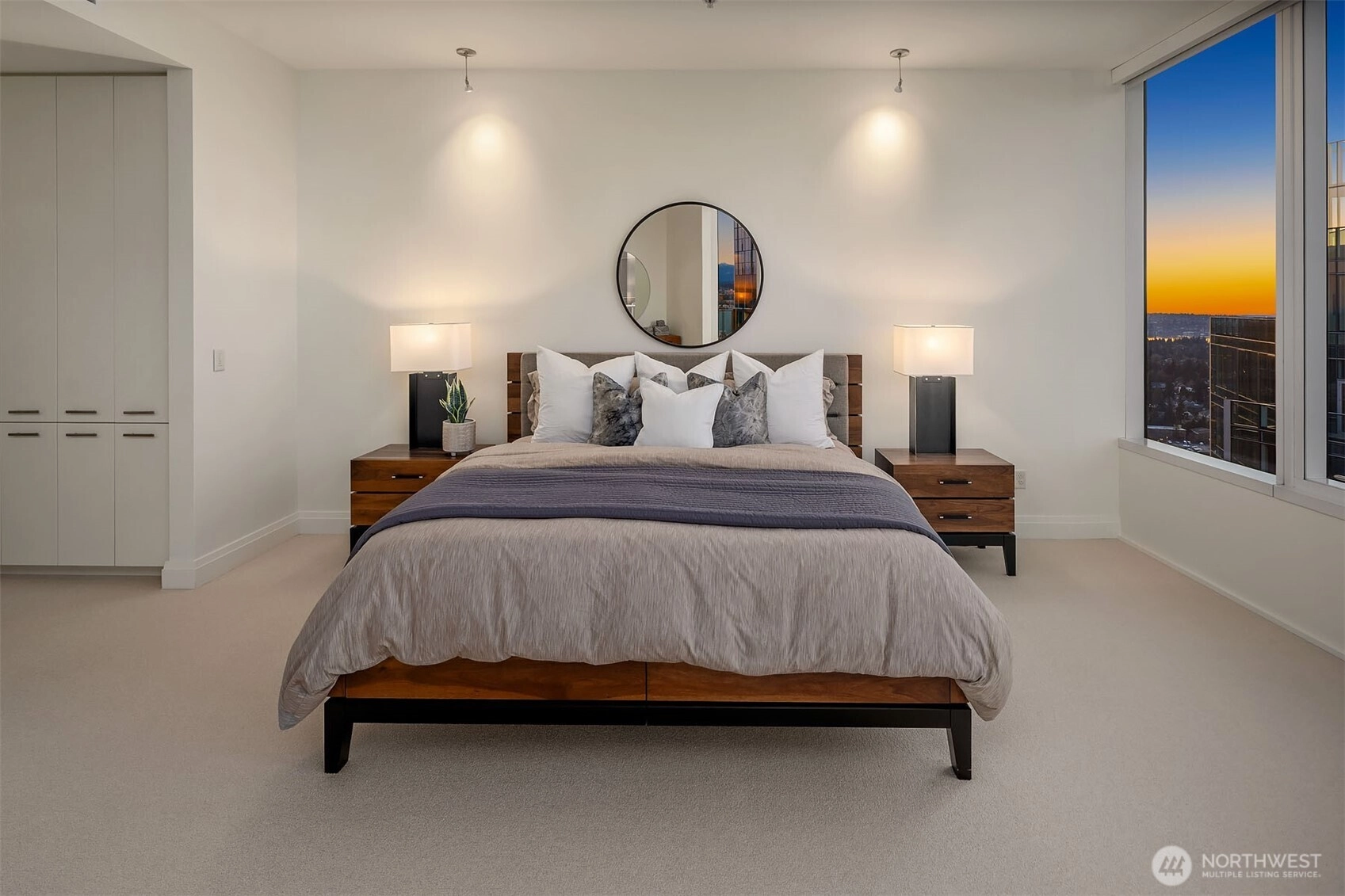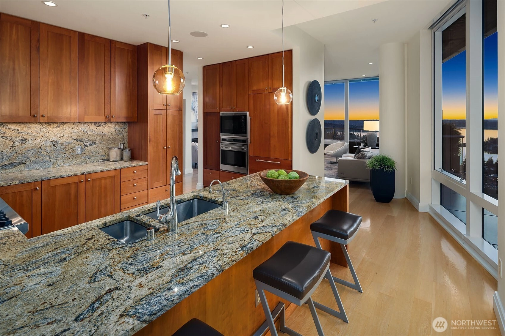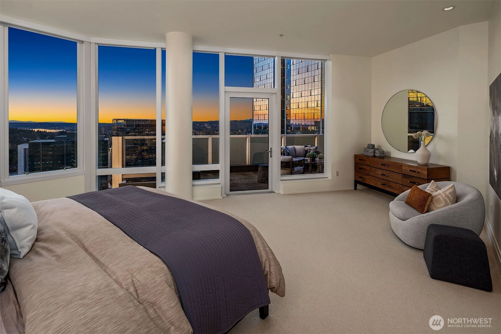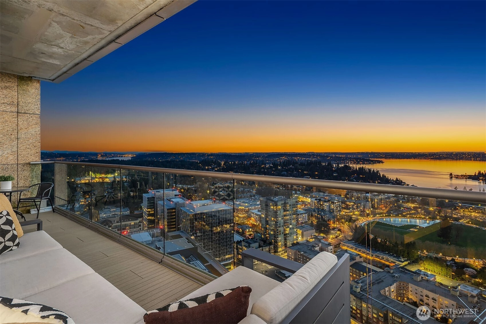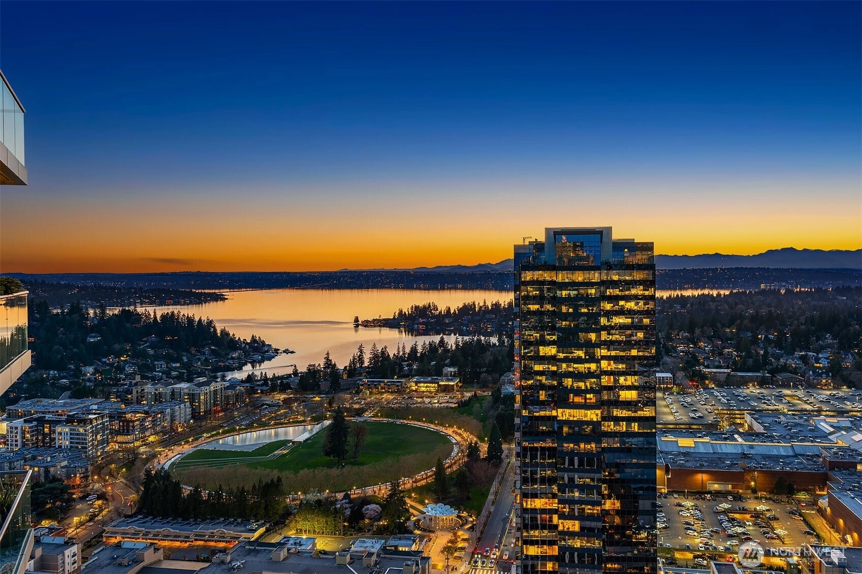 Live large atop Bellevue Towers in this rare 3 bed, 3.5 bath penthouse designed for effortless highrise living. Take in sweeping views of Lake Washington, the Olympics, downtown Seattle and Bellevue while enjoying spaces thoughtfully created for gathering, unwinding and experiencing the best of downtown life. Entertain with ease in the chef’s kitchen featuring cherry cabinetry, slab granite counters and Sub-Zero/Wolf appliances, or host memorable evenings in the dramatic great room with fireplace, wet bar and oversized view balcony. A formal dining room with butler’s pantry sets the stage for celebrations, while flexible guest spaces offer comfort for visitors or the perfect work-from-home setting. Retreat to the expansive primary suite with dual closets, a spa-inspired five-piece bath and private balcony. Thoughtful details including 10' ceilings, motorized shades and lighting, in-ceiling speakers, dual-zone HVAC and abundant storage enhance everyday comfort. Three parking spaces with EV charging and a large storage unit add rare convenience. LEED Gold–certified and People's Choice award winner Bellevue Towers offers recently remodeled amenities including state-of-the-art fitness rooms, a whirlpool spa with sauna and steam room, dining room with kitchen, community and game rooms, theater, outdoor terraces, a half-acre park, and concierge services. Enjoy a vibrant downtown Bellevue lifestyle just moments from world-class shopping, dining and Bellevue Downtown Park.