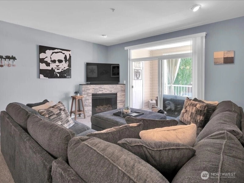 Sophisticated living in this private, gated community! Views of Mt Rainier from kitchen and balcony. Hipsters will enjoy this immaculate 2 Br/ 2BR unit with high ceilings, 2 private balconies and low monthly dues! The perfect blend of style and comfort in this stunningly updated second floor condo! Updated cabinets, engineered hardwood floors in kitchen, bright dining area, open floor plan living room with cozy fireplace. Sliding door opens to priate balcony with storage. Primary suite with large walk-in closet. All appliances stay! Amenities include: gated entry, clubhouse, exercise room, game room, and play space.