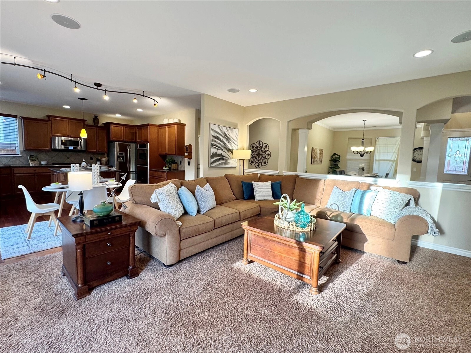 Charming 4 bed craftsman in VerCello welcomes you home to a spacious open floor plan decorated with archways, Rich hardwood and Beautiful tile floors. High end S/S double oven, 5 gas burner stove, warming drawer and butler's pantry. Tankless water heater, Central air condition. surround sounds and skylights. Huge Master suite with french doors, fire places. sitting room and deluxe bath. fenced yard and patio backs onto green belt and waling trail.