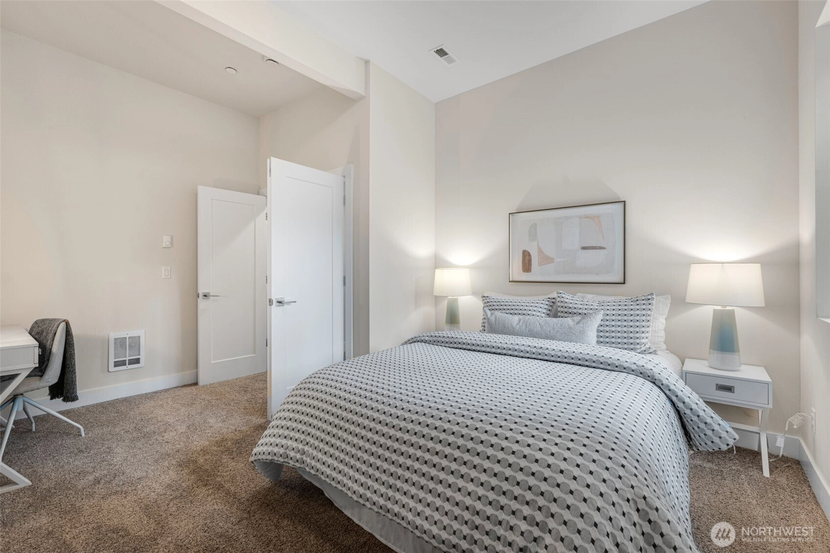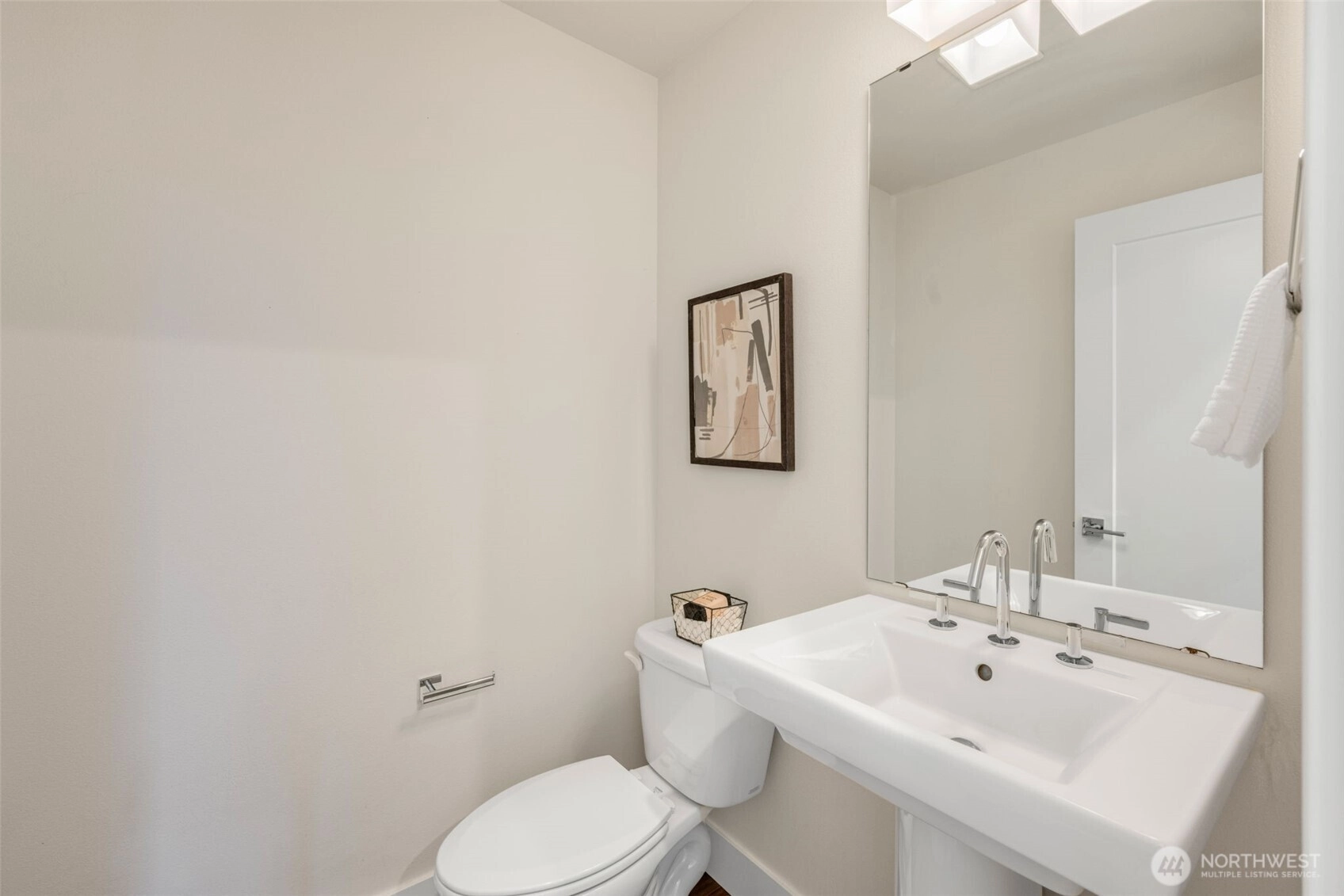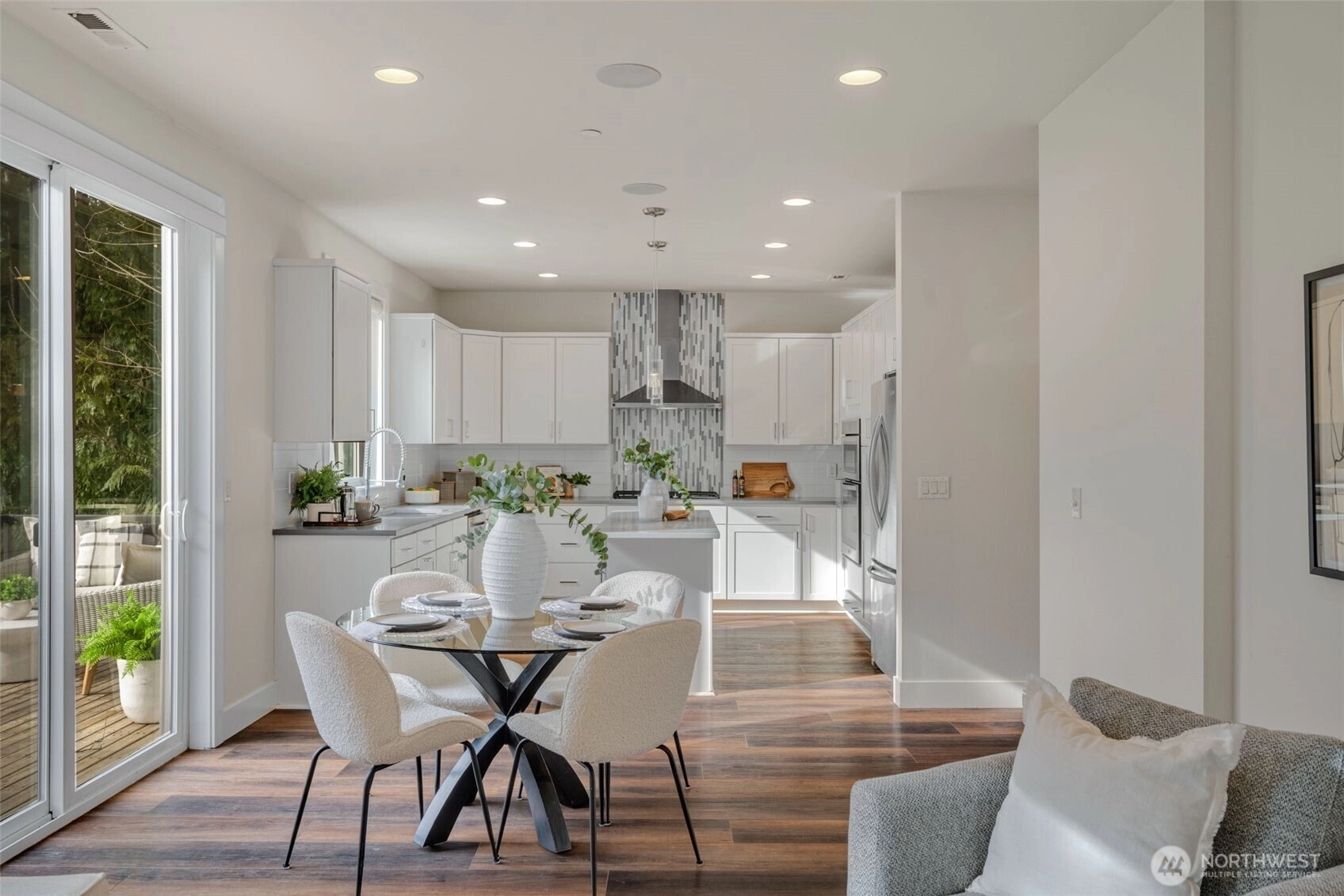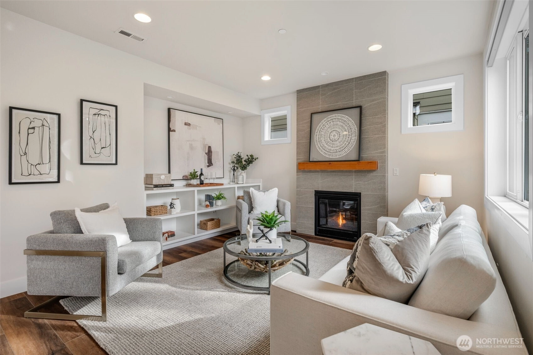 Modern Comfort Meets Northwest Views in Sammamish. Tucked on a quiet dead-end street, this beautifully updated home blends modern style with serene Pacific Northwest surroundings, featuring filtered views of Lake Sammamish and a lush tree canopy backdrop. The light-filled living and dining area offers newer flooring, a cozy gas fireplace, and built-in cabinetry, with an 8-foot door opening to the view deck for seamless indoor-outdoor living. The kitchen is designed for everyday living and entertaining with white shaker cabinets, a spacious island with pendant lighting, grey solid surface countertops, stainless appliances, French door fridge, wall oven, cooktop, and white tile backsplash. A versatile front flex room with fireplace is ideal for a dining room, office, or library, plus a convenient powder room on the main level. Upstairs, the primary suite features lake views, dual closets, and a five-piece bath with soaking tub and separate shower. Three additional bedrooms, a full bath with double sinks, and a laundry room complete the level. The daylight basement includes a large family room with deck access, an additional bedroom, ¾ bath, bonus/media room with wet bar, and ample storage. Solar panels with battery bank back-up power, A/C, and an attached garage add comfort and efficiency. Located near parks, the Burke Gilman Trail, and an optional community beach club membership, this home offers the best of Sammamish living.
