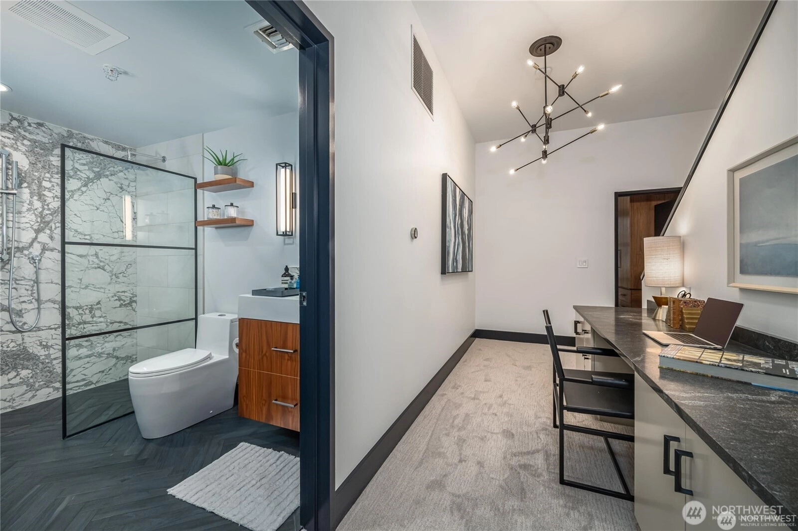 Strategically updated with three fully remodeled bathrooms, this two-story condo offers a detail-led retreat in the heart of Capitol Hill. The renovation was executed holistically, with reconfigured layouts, upgraded plumbing and electrical, and custom millwork throughout. Ten-foot ceilings and floor-to-ceiling windows frame the main living space with city views. The expanded primary suite features a custom walnut floor-to-ceiling closet system, private balcony, and a fully rebuilt bath with double vanity, curbless shower, and freestanding soaking tub. Additional highlights include custom pantry storage, architectural lighting, a rooftop deck, and two parking spaces. Blocks to light rail, grocery, downtown, and Capitol Hill dining.