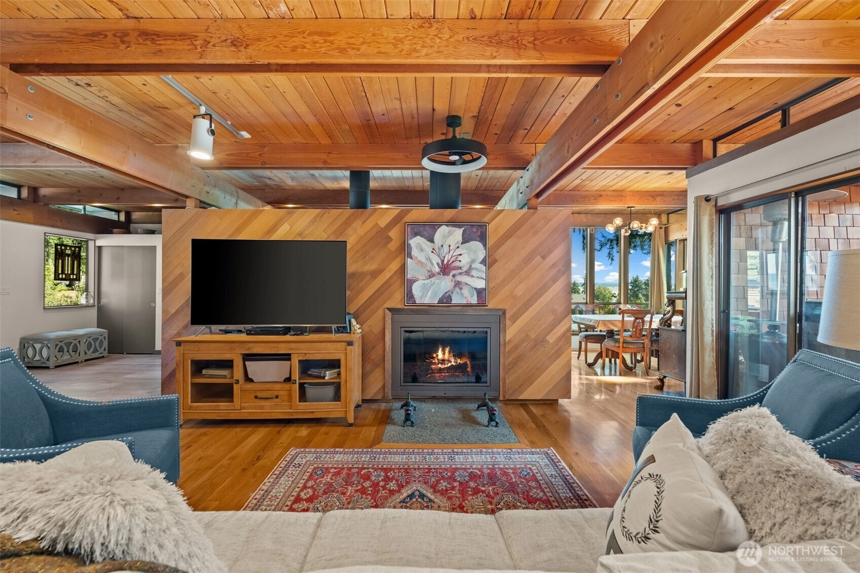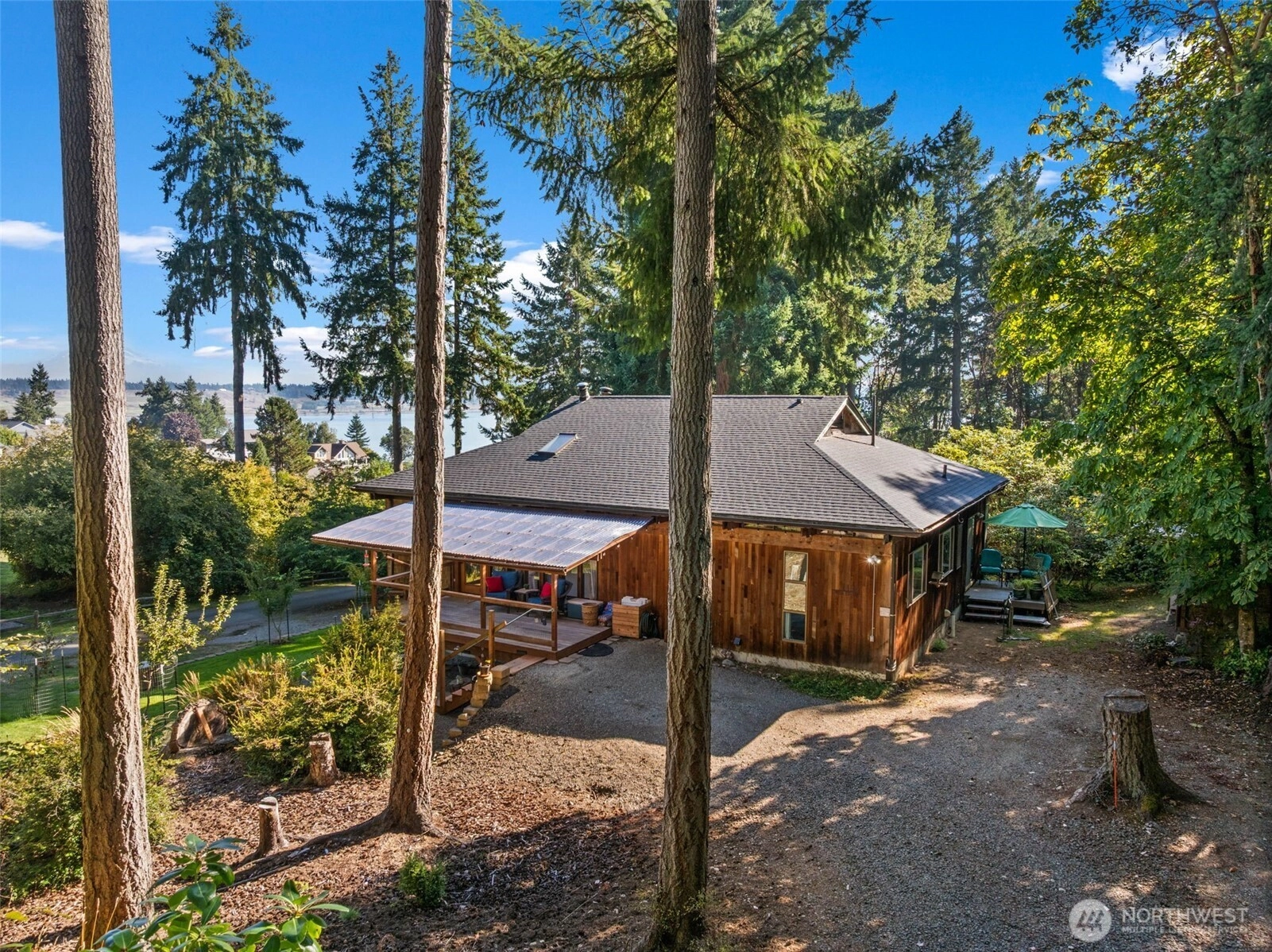 Gorgeous Fox Island home with sweeping views of Mt Rainier, Puget Sound & Chambers Bay Golf Course. This is the first time this Frank Lloyd Wright inspired home has been on the market since building. Entry opens to a gorgeous kitchen/dining area with cedar wood throughout, stainless steel appliances & plenty of storage. Living area opens up to a large deck and perfect area for summer BBQ's with views. Main level features a primary with en-suite, 3 additional bedrooms & full guest bath. Unfinished basement with exterior entrance is plumbed for a bathroom and ready to finish. Large 0.7 acre lot with fruit trees and plenty of parking. Move-in ready with newer 4 bed septic system, electric panel, high-efficiency furnace/heat pump, water heater, and roof. Truly unique home and a must see!