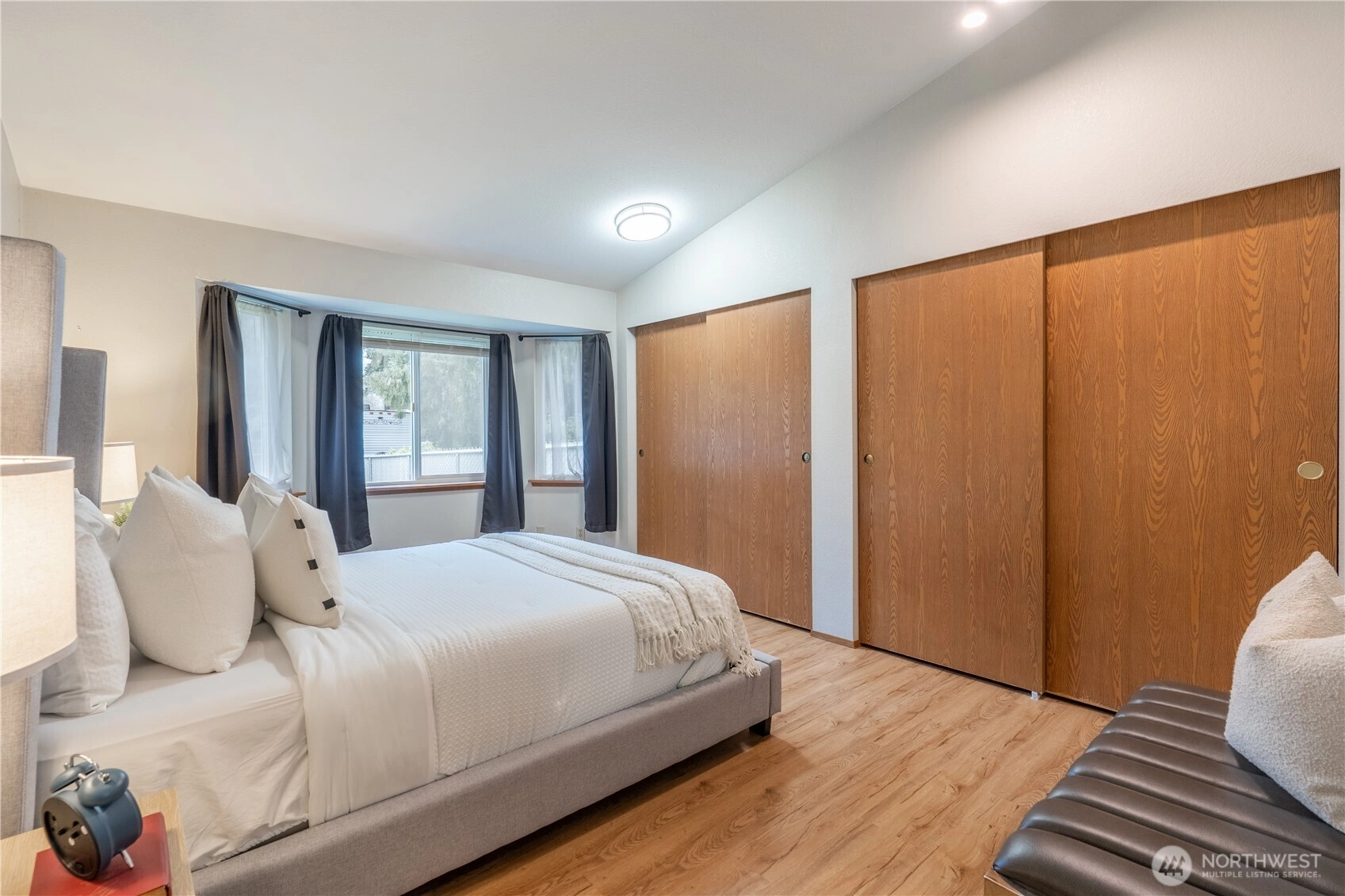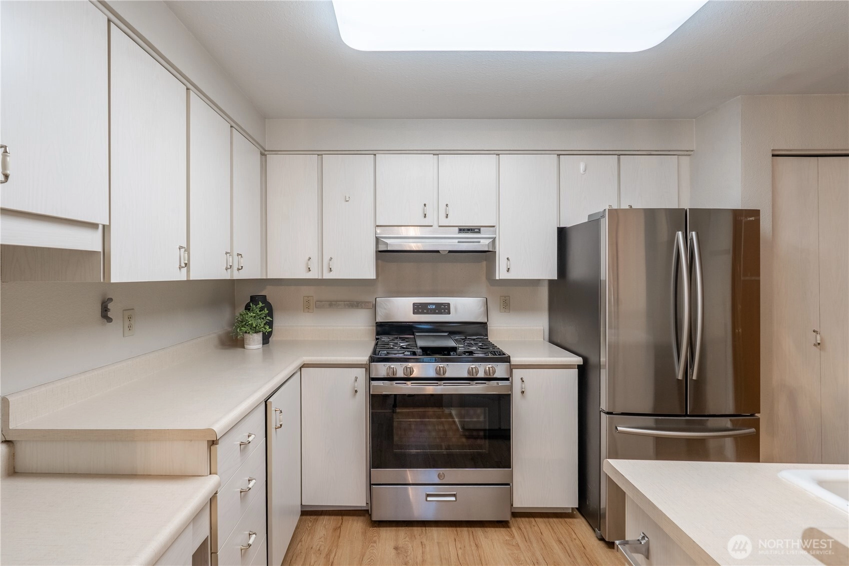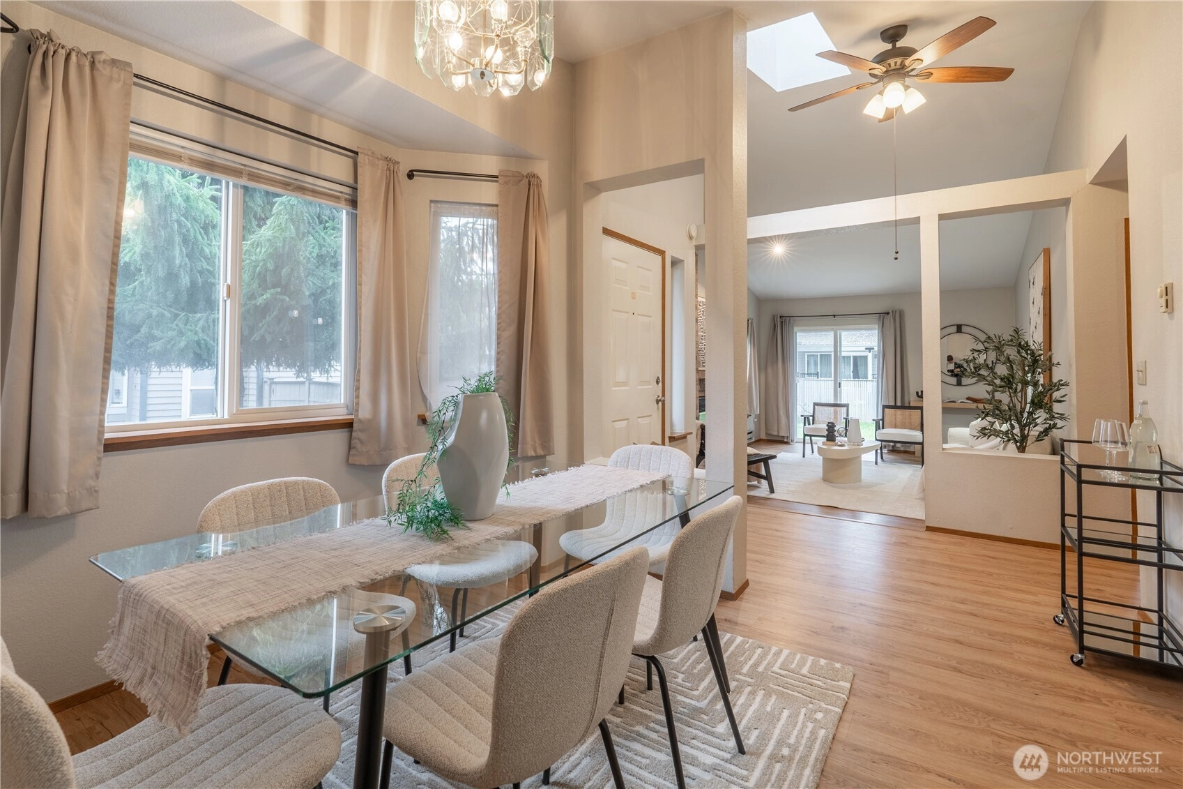 Quaint, Clean and cared for rambler style townhome in the desirable Riverwood community. Light, bright, and inviting, this home offers 2 bedrooms PLUS a versatile den/3rd bedroom that is perfect for working from home or guest space. Vaulted ceilings and skylights create an airy feel, while the sunken living room centers around a cozy gas fireplace. Newer vinyl plank flooring offers an updated feel throughout. The dine-in kitchen features stainless steel appliances with gas cooking, ample cabinetry and breakfast bar adjacent to the dining and living spaces. A sliding door opens to the patio and a rare, large fenced backyard—ideal for relaxing, gardening, or entertaining. Additional highlights include newer roof, a spacious 2-car garage with storage and community RV parking. HOA covers water, landscaping, and common maintenance for easy and convenient living. Centrally located near Downtown Orting and Downtown Sumner with local trails, parks, shopping, dining, and great schools. Welcome home!