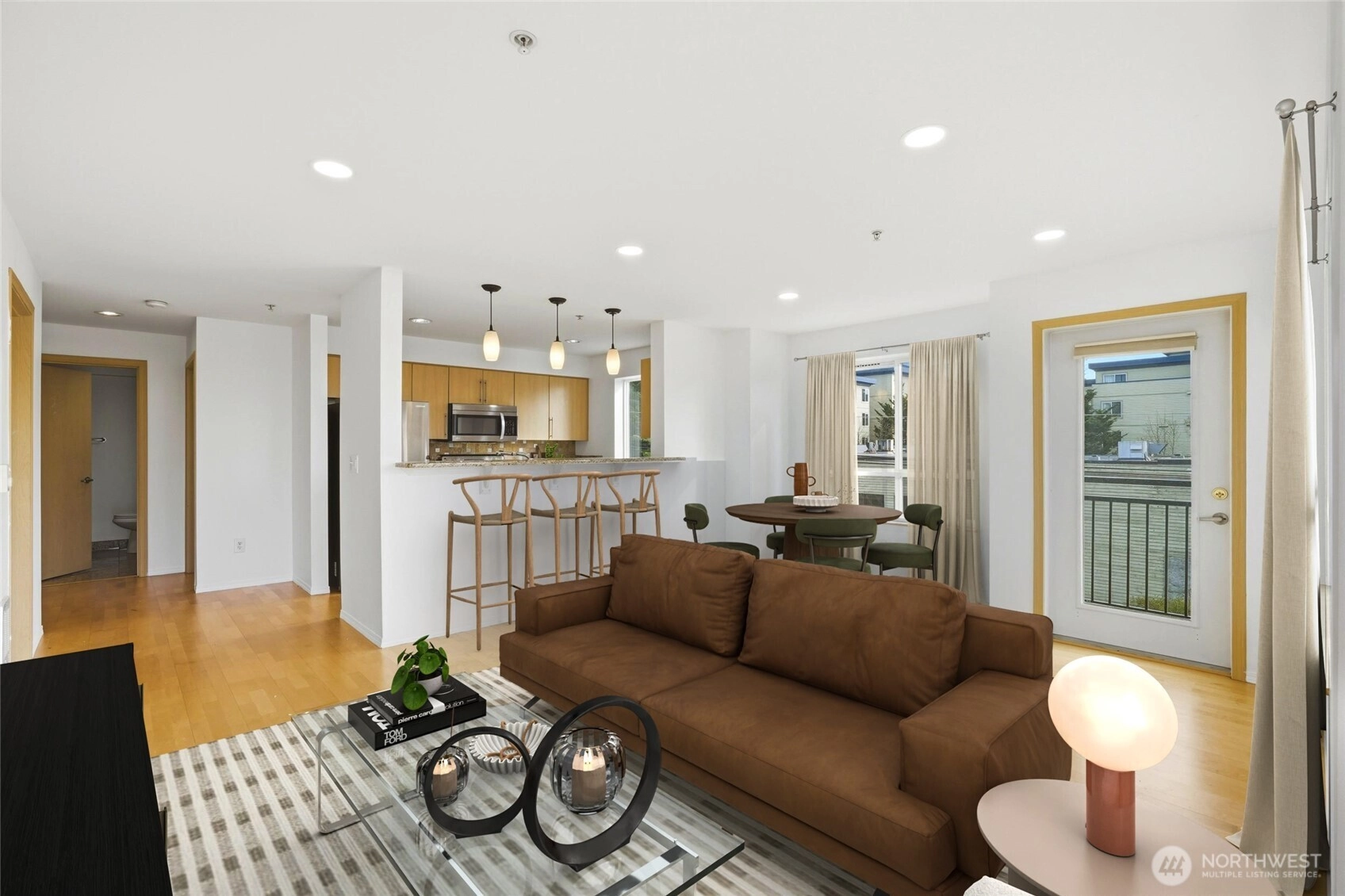 Bright, sun-filled corner condo in the heart of Greenwood offering sweeping territorial views—and on clear days, a stunning glimpse of Mount Rainier right from your living room. This spacious 2-bedroom, 1.75-bath home is one of the larger layouts in the building, featuring an open-concept design, granite countertops, and stainless steel appliances that make everyday living and entertaining feel effortless.Ideally located just two blocks from the energy of downtown Greenwood, you’ll love the easy access to local favorites, grocery options like Fred Meyer and Trader Joe’s, and nearby parks including Greenwood Park and Green Lake. Commuters will appreciate the quick connection to SR-99, providing a smooth route to downtown Seattle and the airport, along with convenient transit options to UW, North Seattle, and beyond.This modern, well-maintained building offers a host of desirable amenities, including a fully equipped fitness center, resident lounge with game area and large screen TV, and an expansive outdoor terrace with grilling stations—perfect for gathering with friends. Pet lovers will appreciate the dedicated dog park, while two secure parking spaces in the covered garage add everyday convenience. Enjoy the added bonus of a welcoming and connected community, where neighbors stay in touch and create a true sense of home.