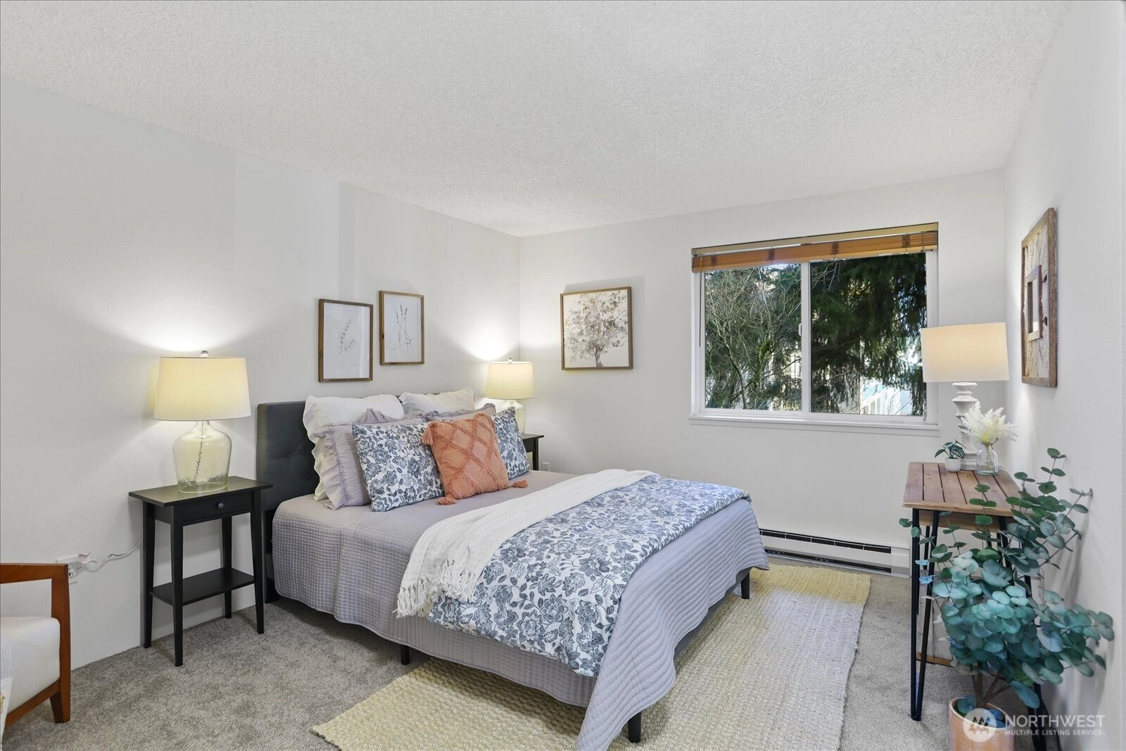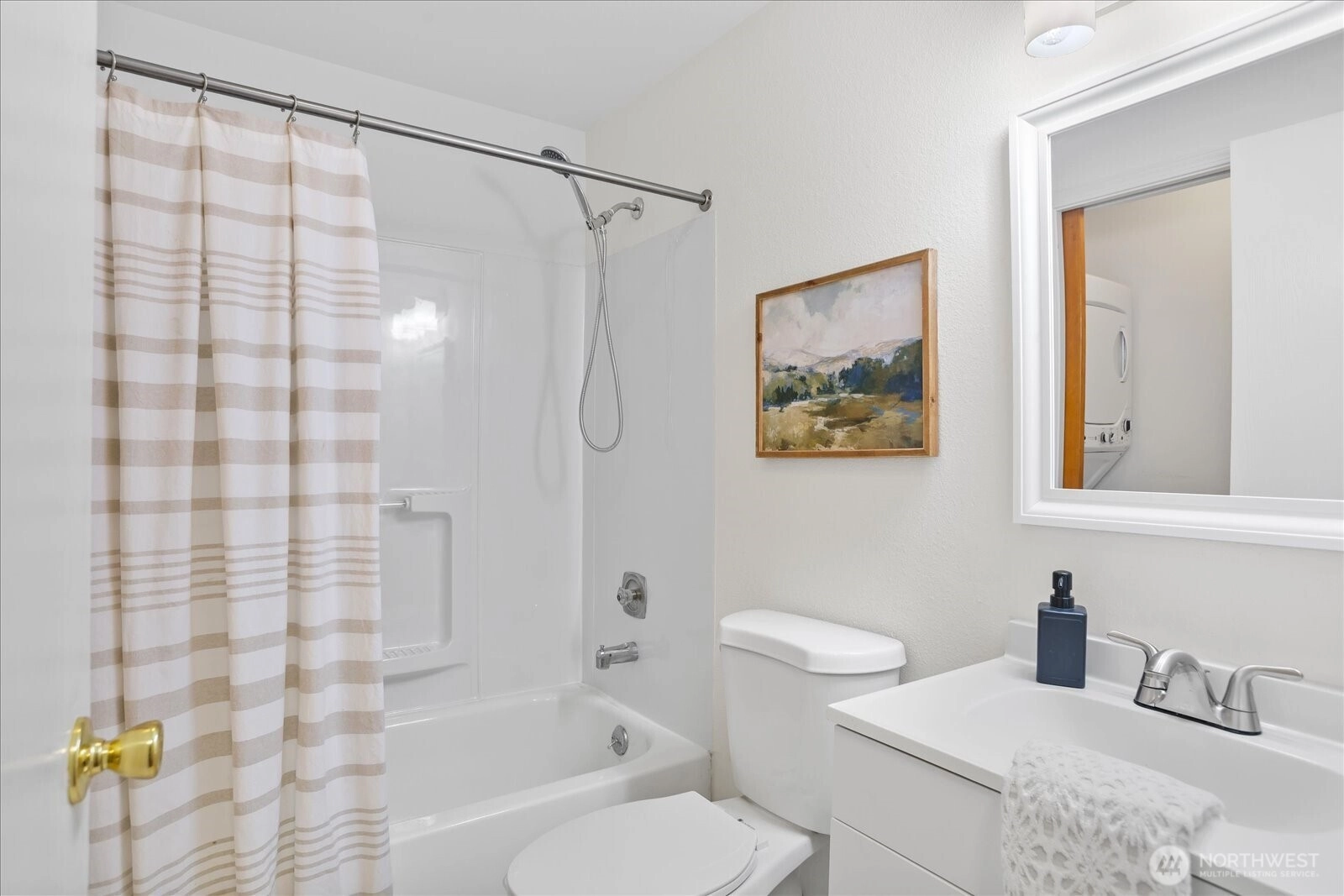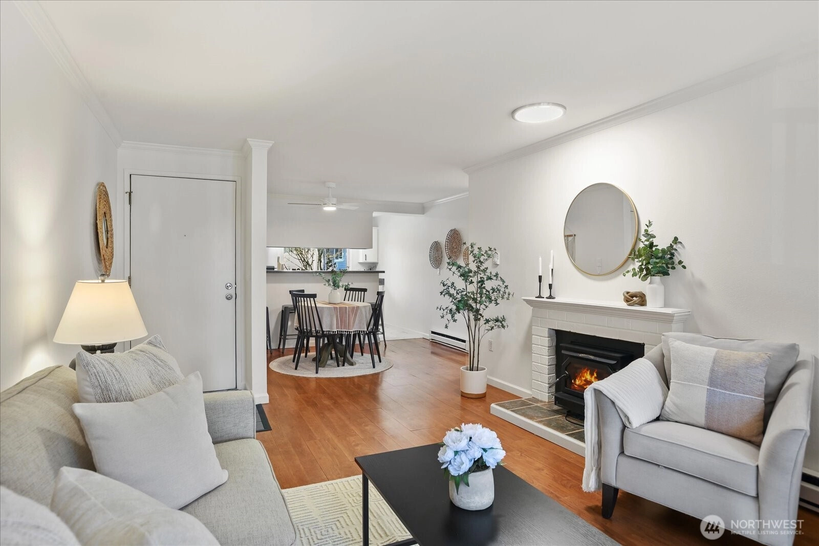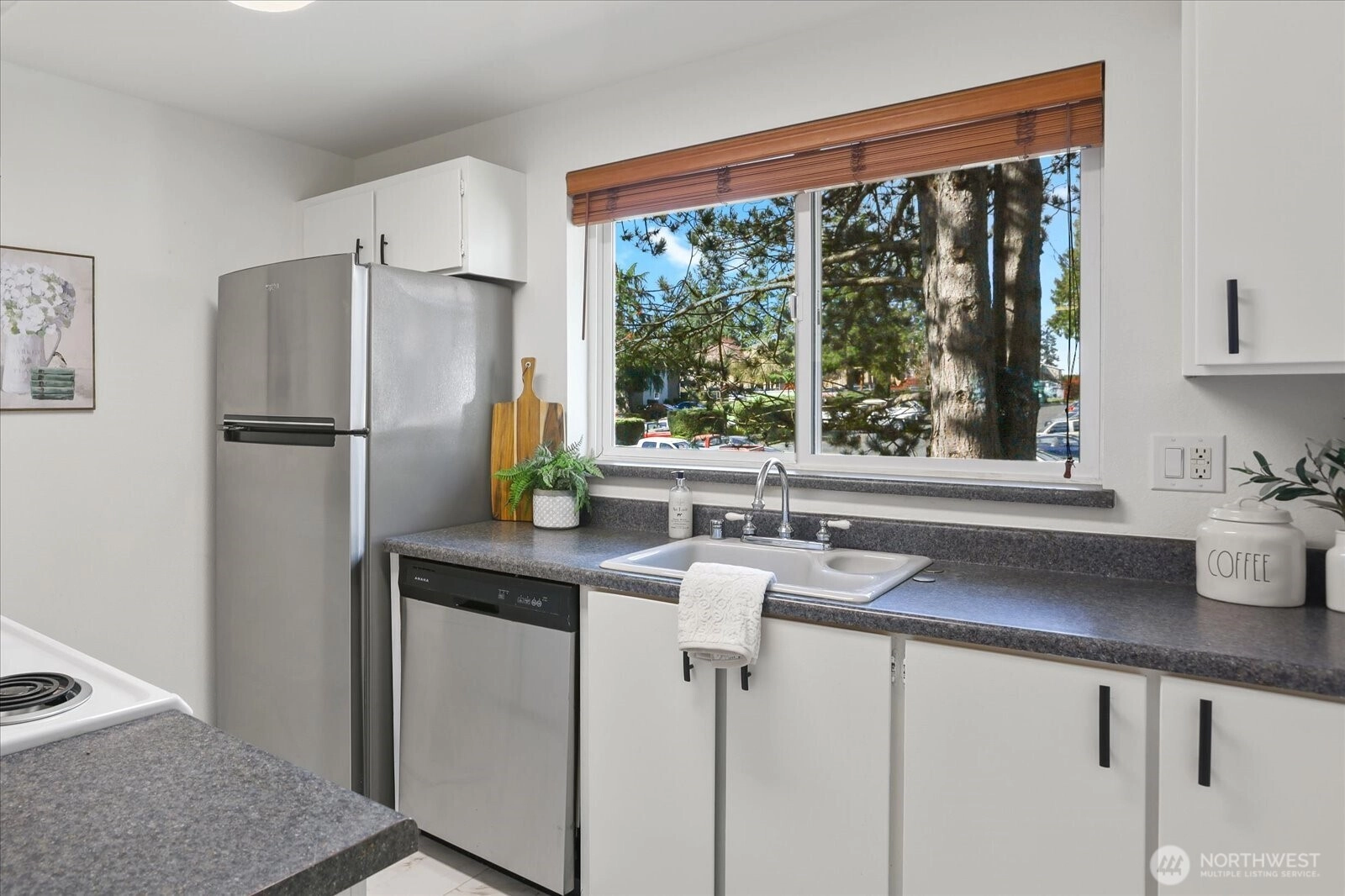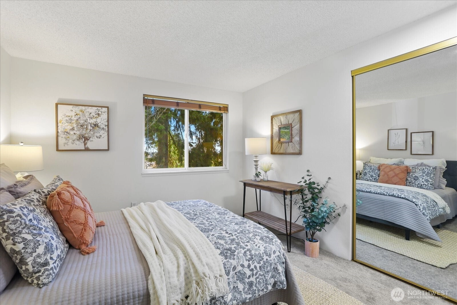 Beautifully refreshed, light filled condo tucked down a quiet drive with LOW monthly dues. Thoughtfully designed layout offering two full bathrooms and two large bedrooms with serene views of the Cascades from the spacious deck. New paint throughout, new LVP flooring in kitchen and bathrooms, new carpet in both bedrooms, new lighting fixtures including ceiling fan with remote, new fridge, new WD, newer water heater and cozy wood burning fireplace. Situated within the highly sought-after Mukilteo School District and just minutes from Boeing and I-5, this location is ideal for both homeowners and investors alike (no rental cap!).Enjoy a nicely maintained community and well-run HOA. Major exterior updates already completed, including new siding, windows, slider doors, roof, and decks. Amenities include heated pool, indoor hot tub, cabana and sports court. One assigned parking space and loads of visitor parking. Pet friendly and close to lots of restaurants, shops, hospital and transit options. Ample storage closet on private deck and VA approved. Welcome Home!