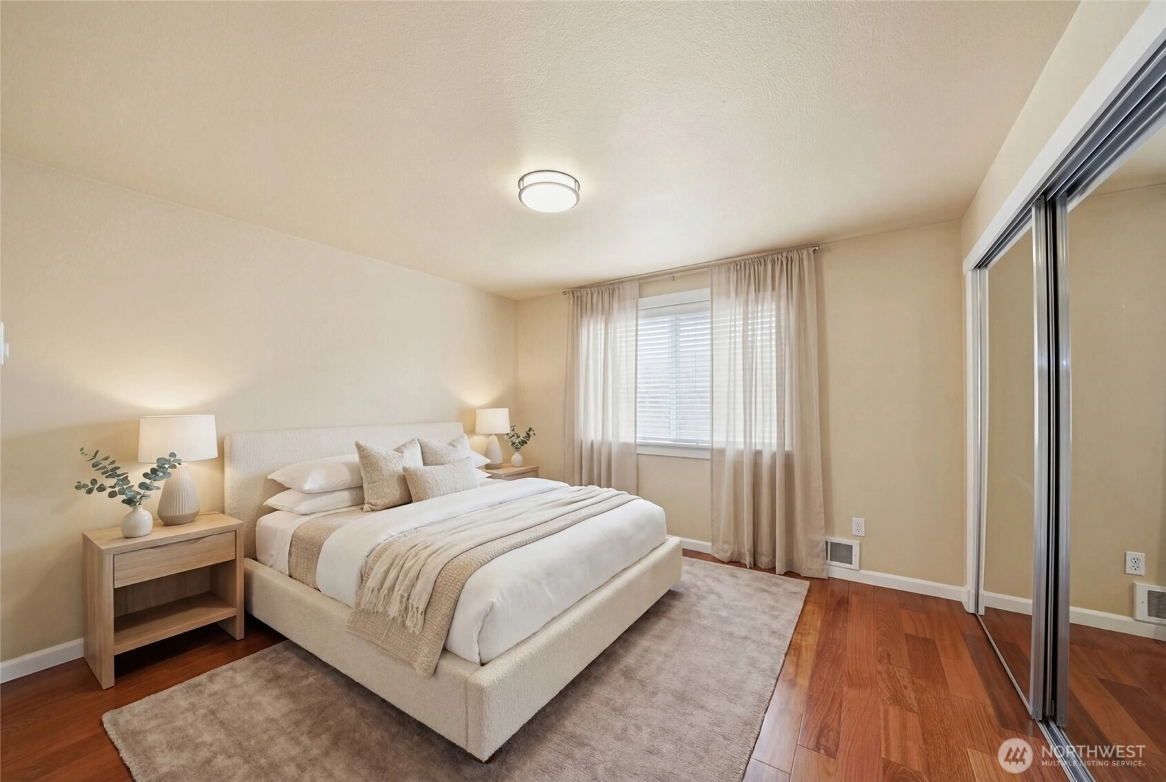 Discover the perfect blend of renovated enhancements and functional design in this stunning dual primary bedroom suite townhome. As you step inside you are greeted by the warmth of the rich extensive cherry hardwood floors throughout. The inviting main floor living area is perfect for relaxing or entertaining as the ornate corner gas fireplace adds both luxury and a perfect addition for chilly evenings. The unique layout of 2 upper level primary bedroom suites with their own attached full bath and extended closets makes it an ideal choice for roommates, guests or a high end home office setup. The open gourmet kitchen offers an abundance of counter space with granite counter tops & gas cooktop range. You will love the oversized attached kitchen adjoining walk in pantry. Transition from indoor comfort to your private fenced backyard area with large extended patio which is great for BBQs or a secure space for pets to relax. Finished floor attached garage in addition to front parking spaces. This home is tucked away in an excellent setting of only 8 townhomes that includes a large back yard park area for play time or pet exercise. Easy access to freeways and shopping, as it is a perfect commuter location.