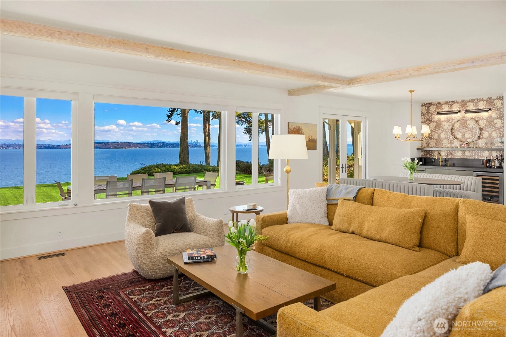 Rare Bainbridge Island waterfront offering with protected, panoramic water views from a fully bulkheaded high-bank setting, capturing stunning sunrises over Downtown Seattle, the Cascades, Mt. Rainier, and the ever-changing maritime activity along the shipping lanes. A private tree-lined drive opens to a near-circular driveway, creating a quiet, stately sense of arrival, set within a rare, fully level 1-acre parcel. Designed in a timeless Coastal Craftsman style, the home has been extensively reimagined with over $1M invested, encompassing magazine-worthy design alongside meaningful infrastructure and system upgrades. The interior unfolds with a natural, connected flow, well suited for both everyday living and entertaining, with views from nearly every room. The expansive kitchen is stunning, with vaulted ceilings, a new AGA range, a generous island, and a sunlit breakfast nook, all oriented toward two walls of windows that capture breathtaking eastern and southern views. The home offers 3 bedrooms, each with its own ensuite, along with a Murphy bed in the office. The primary suite is a true retreat, with sweeping views, a deck, dramatic vaulted ceilings, a walk-in closet of exceptional scale, & a spa-like ensuite bath with sauna. A covered mahogany view deck extends from the kitchen, dining room, and living room, complete with integrated heaters, and opens to an expansive, flat lawn set against commanding views. Ideally located near Fay Bainbridge Park & Rolling Bay's shops.