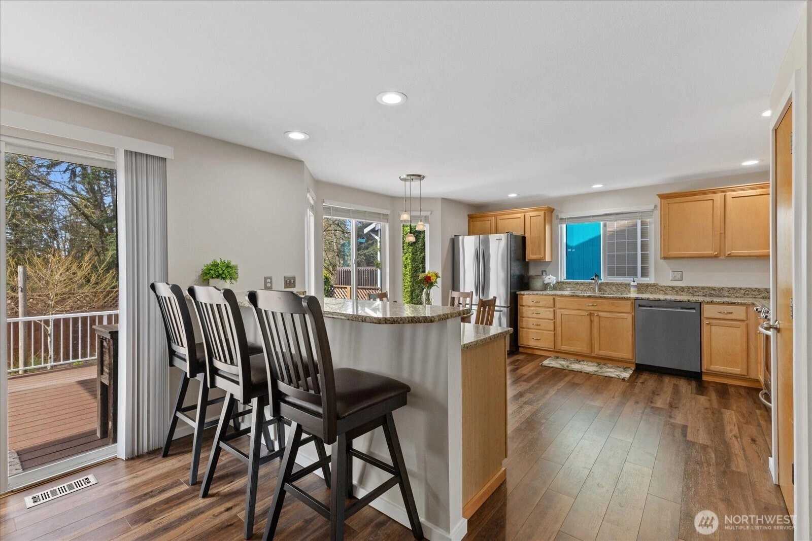 Welcome home to this very well-maintained gem in Summerfield Estates. Featuring 4 beds, 2.5 baths, and 1,960 sq ft in a prime location. Come inside and be greeted with a light, bright, and open floor plan that features vaulted ceilings in the spacious living room and a cozy gas fireplace in the family room. The updated kitchen offers generous space that flows seamlessly for entertaining. Step outside to a backyard oasis with a green belt, a firepit area, and a long-lasting AZEK deck with an awning perfect for gatherings. Retreat to the large primary suite with cathedral ceilings, a bay window, and a large 5-piece bath with a walk-in closet. More home features include air conditioning, newer LVP flooring and carpet, a fully fenced yard, wired-in exterior trim lighting, and generator hookups that complete this move-in-ready home. Enjoy easy access to Green River College, parks, freeways, and shopping. Pre-inspected!