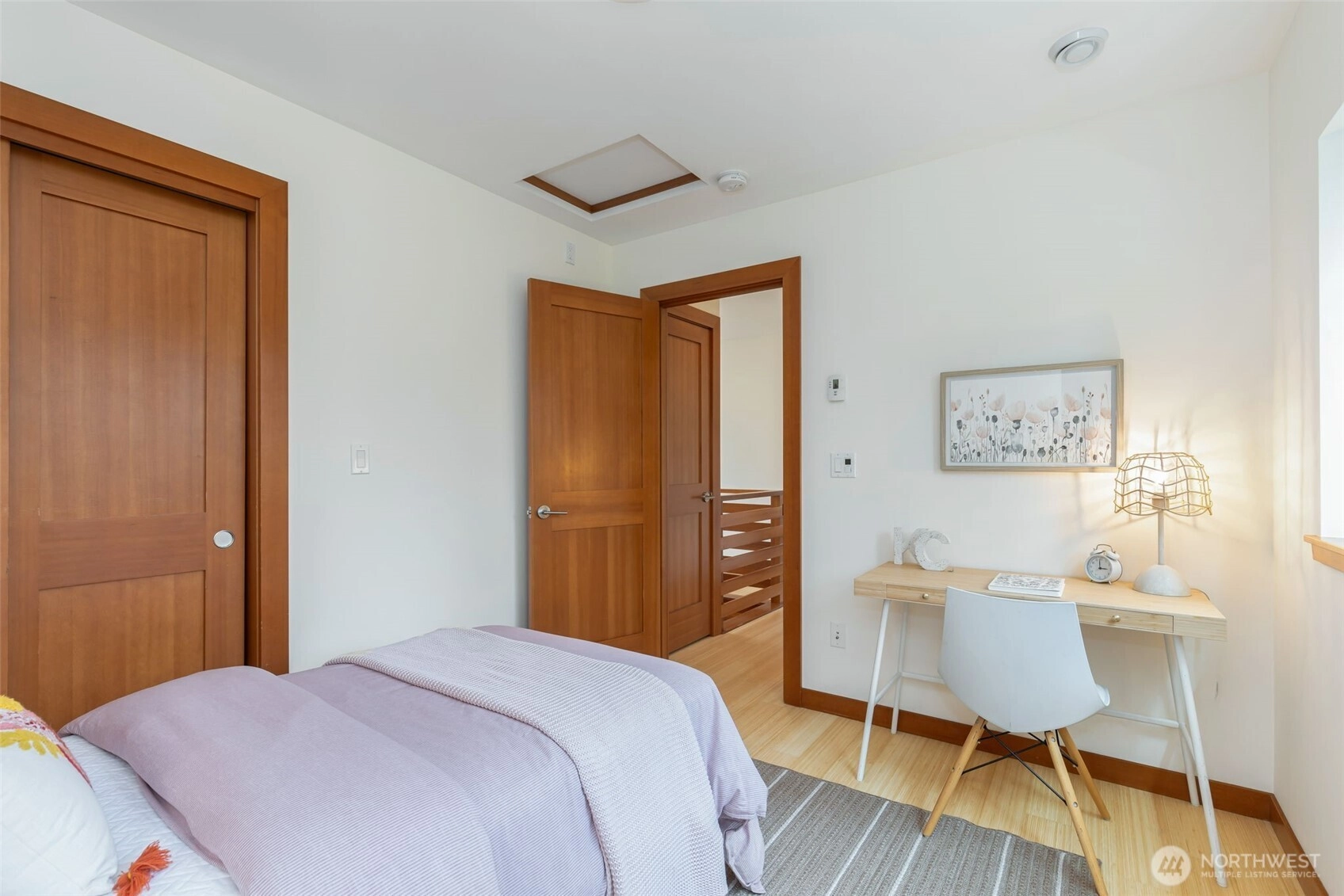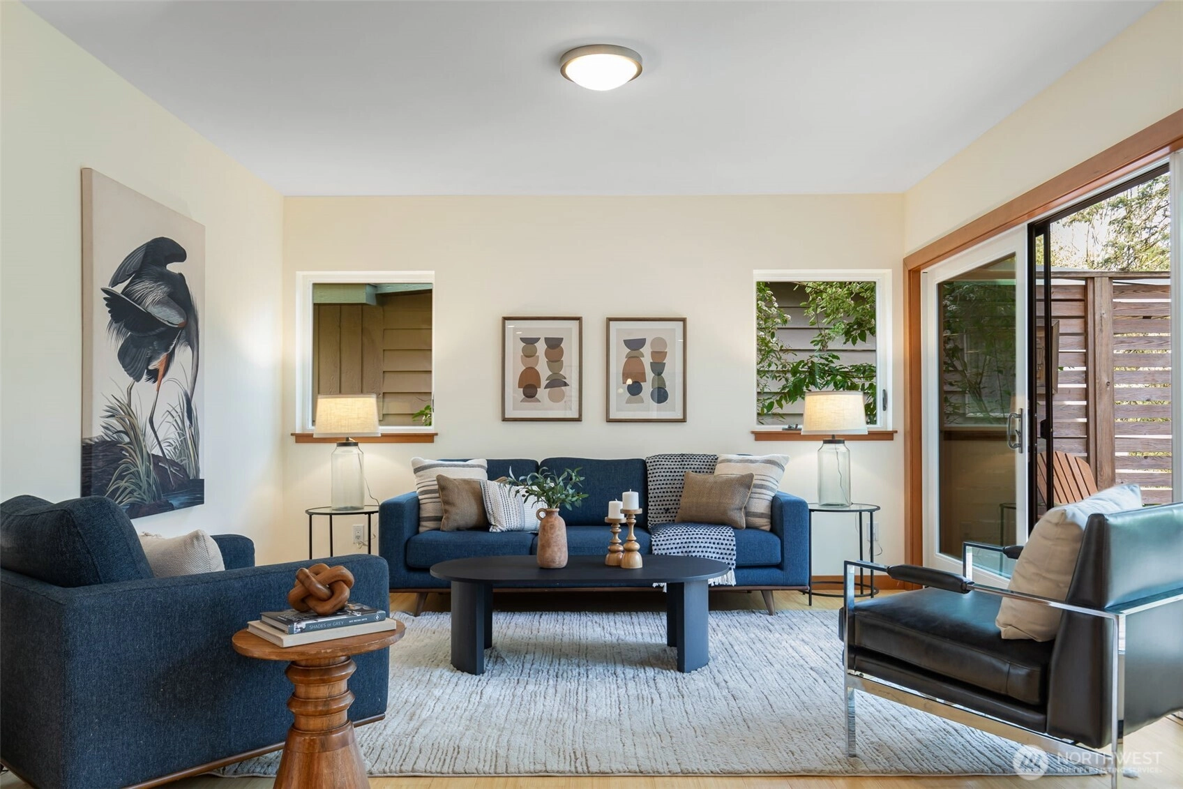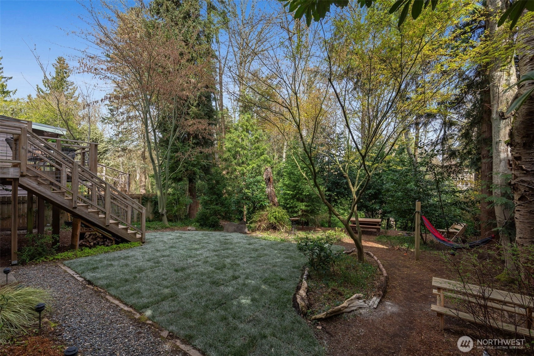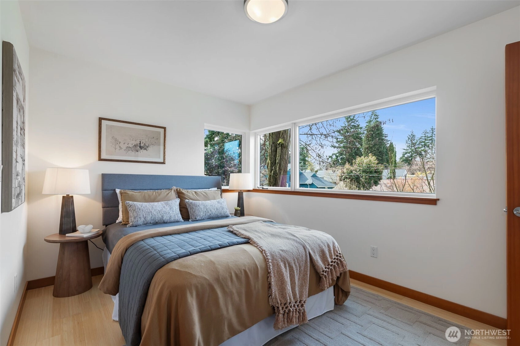 This Northwest contemporary home, a true sanctuary in the city, is an impeccable example of thoughtful design intersecting with a natural setting. This Built Green home, made largely with locally sourced materials, is only steps from all that Wedgwood has to offer. On a lush protected greenbelt, the sweet birdsongs change with the seasons. Organic materials and walls of windows, awash in natural light, integrate the indoors to the outdoors. The combination of open concept living and comfortable, discreet spaces make this a home that will delight. The metal roof, concrete board siding, Ipe decks, 220 electric in the garage for EV, a premium HRV whole house air filtration system, and radiant heating are among the comforting and sustainable choices made in the well considered construction. There's no need to compromise. You get all of this with the perfect floorplan - 3 bedrooms and 2 baths up, 1 bedroom or office with its own entrance and a half bath on the main, and downstairs is a spacious bedroom, another bath, and a media room with a second kitchen/laundry. The downstairs can also be used as an ADU with permitting already in place and its own entrance. The gardens around the home are expansive and special, perfect for gardening, relaxation, and play. You are going to love this home and it will love you back.
