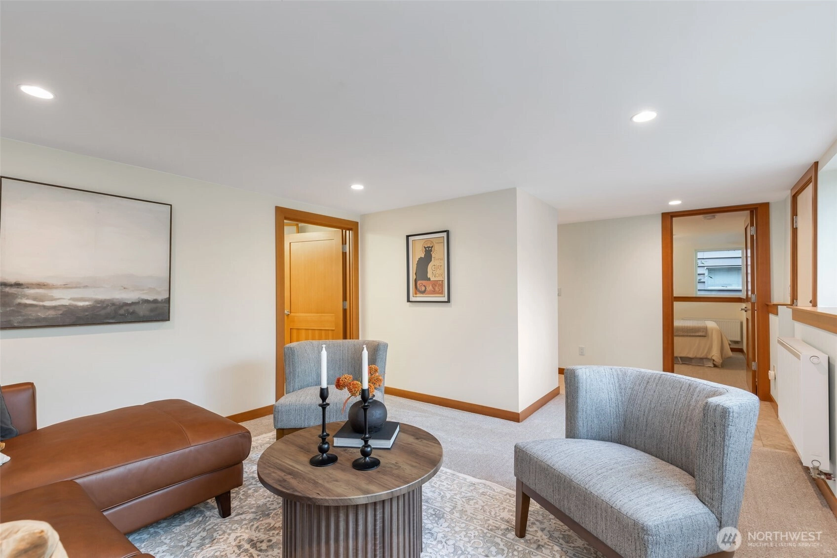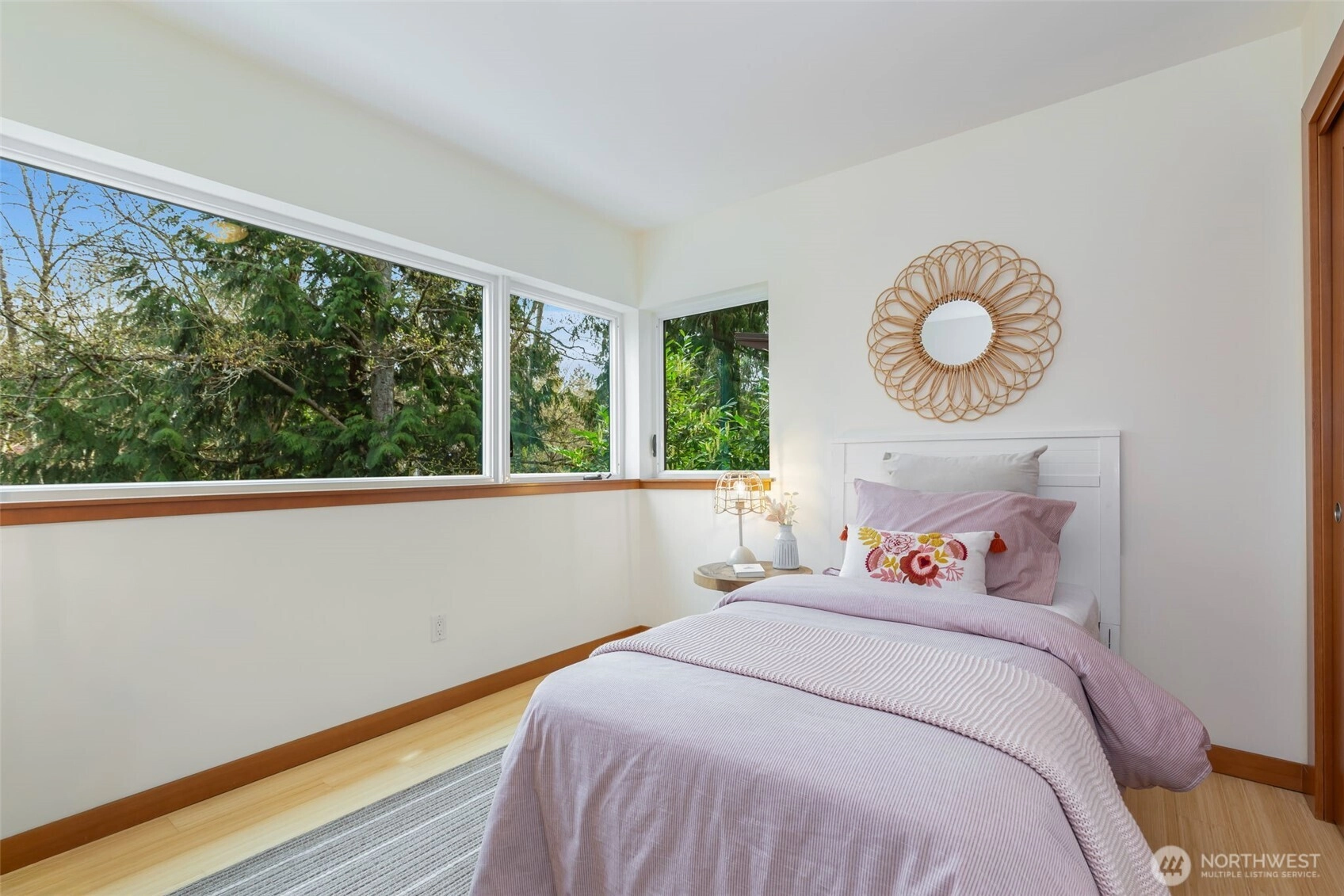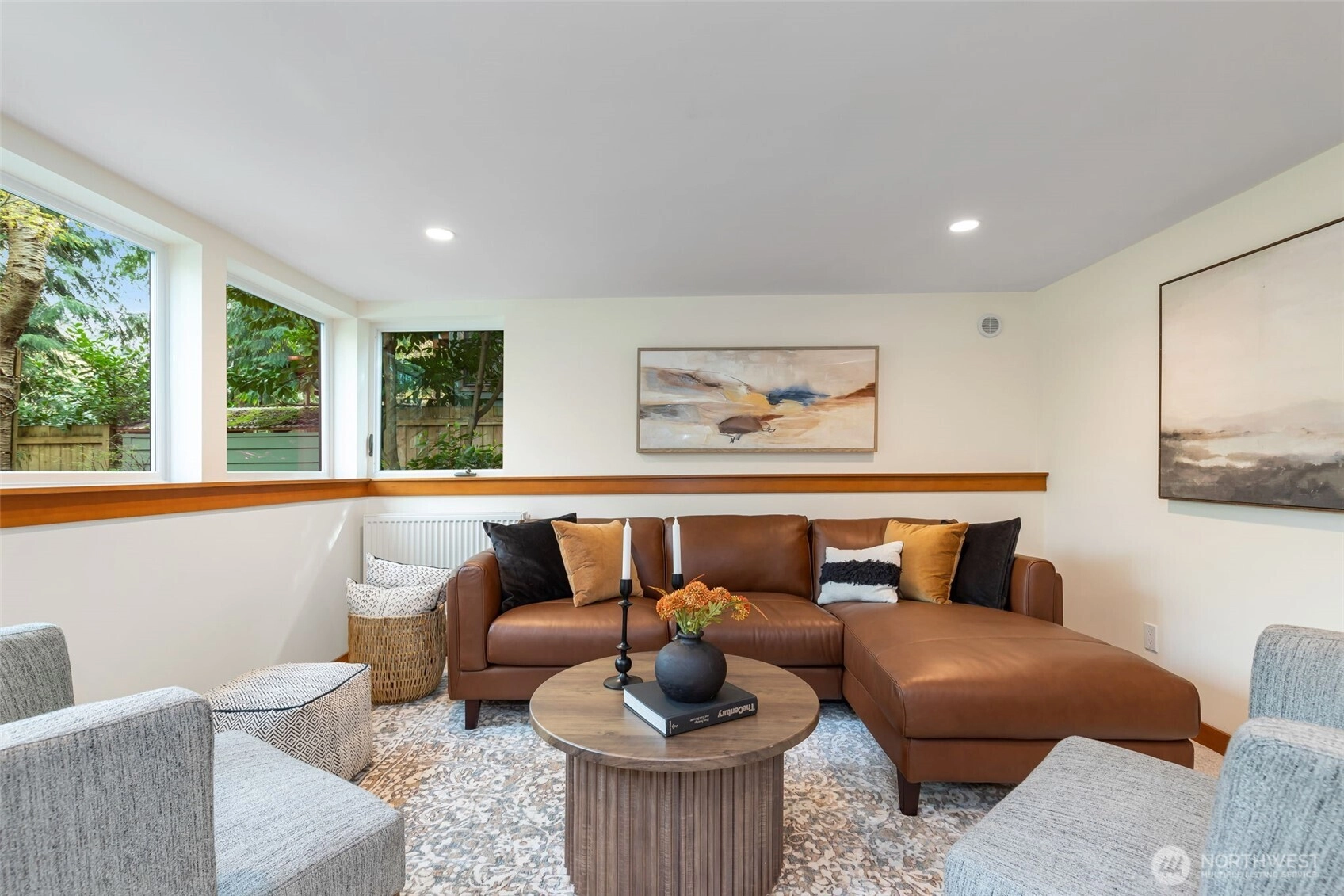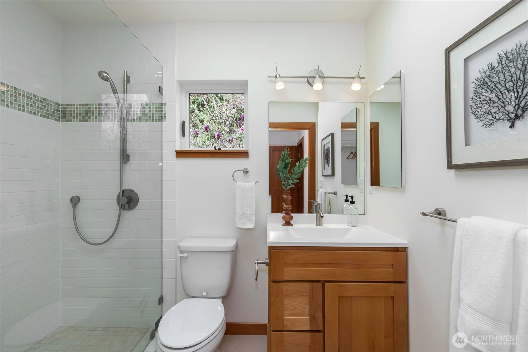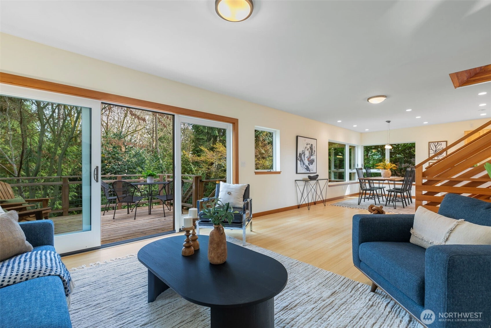 This Northwest contemporary home, a true sanctuary in the city, is an impeccable example of thoughtful design intersecting with a natural setting. This Built Green home, made largely with locally sourced materials, is only steps from all that Wedgwood has to offer. On a lush protected greenbelt, the sweet birdsongs change with the seasons. Organic materials and walls of windows, awash in natural light, integrate the indoors to the outdoors. The combination of open concept living and comfortable, discreet spaces make this a home that will delight. The metal roof, concrete board siding, Ipe decks, 220 electric in the garage for EV, a premium HRV whole house air filtration system, and radiant heating are among the comforting and sustainable choices made in the well considered construction. There's no need to compromise. You get all of this with the perfect floorplan - 3 bedrooms and 2 baths up, 1 bedroom or office with its own entrance and a half bath on the main, and downstairs is a spacious bedroom, another bath, and a media room with a second kitchen/laundry. The downstairs can also be used as an ADU with permitting already in place and its own entrance. The gardens around the home are expansive and special, perfect for gardening, relaxation, and play. You are going to love this home and it will love you back.
