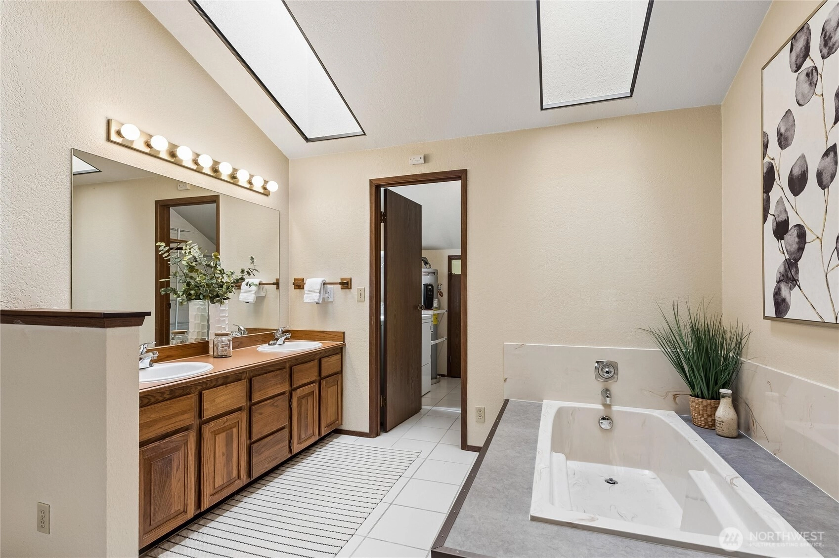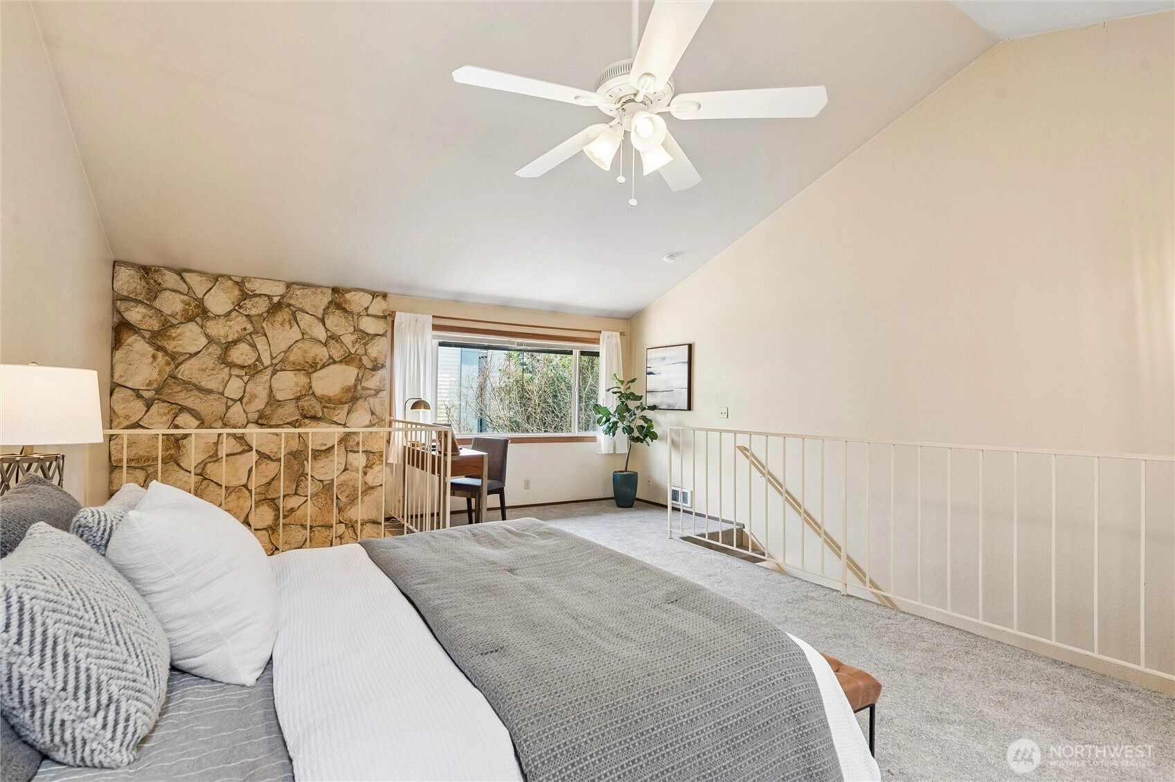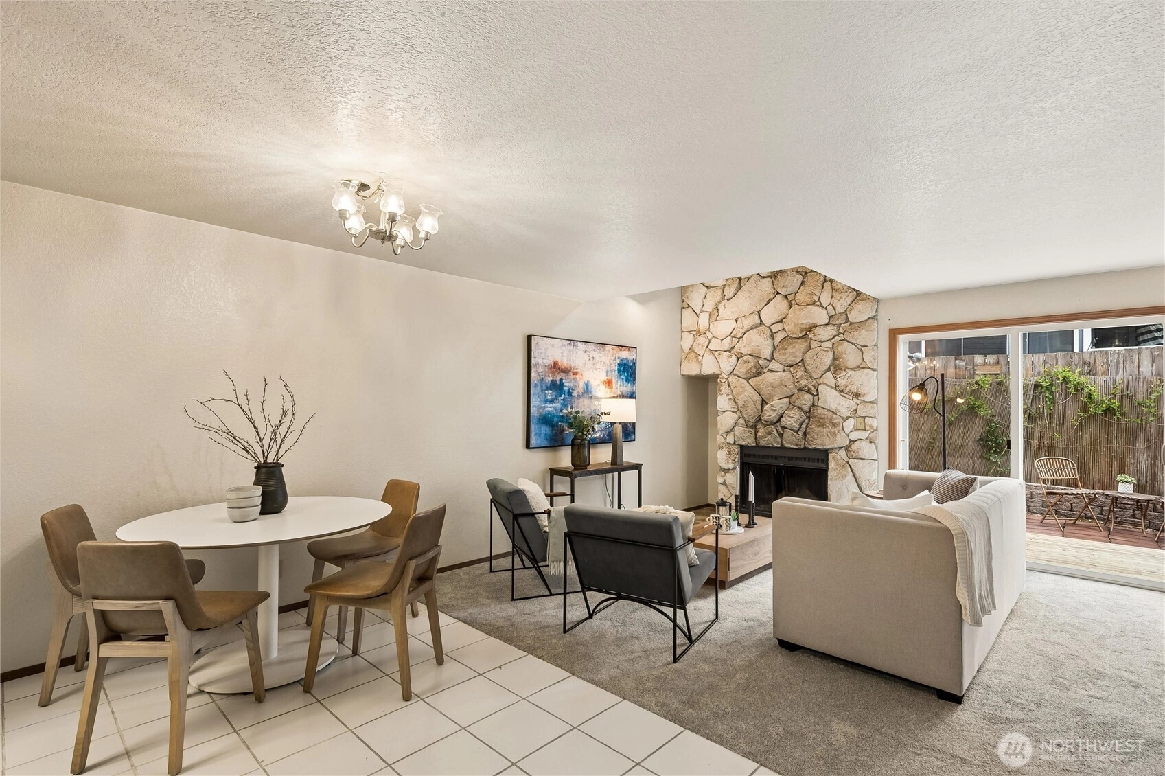 This is the mid-century moment you’ve been waiting for. Ideally located, this townhouse-style home lives like a single-family residence. Bright, private, and thoughtfully designed, the open-concept main level features a dramatic floor-to-ceiling river rock fireplace, clean architectural lines, and effortless flow throughout. A striking floating staircase leads to an oversized loft-style primary retreat with vaulted ceilings and skylights that flood the space with natural light. The flexible layout offers room for a home office, while the ensuite bath features a soaking tub, separate shower, double vanity, and walk-in closet with full-size washer and dryer. Large sliding doors create seamless indoor-outdoor living, opening to a fully fenced yard with dedicated gardening space. Additional highlights include a private one-car garage, new water heater, new carpet throughout, new thermostat, newer dishwasher, a main-level half bath, and no rental or pet restrictions. Located near the new light rail, this home blends design, function, and long-term potential in one of North Seattle’s most connected pockets. Pre-inspected and move-in ready!