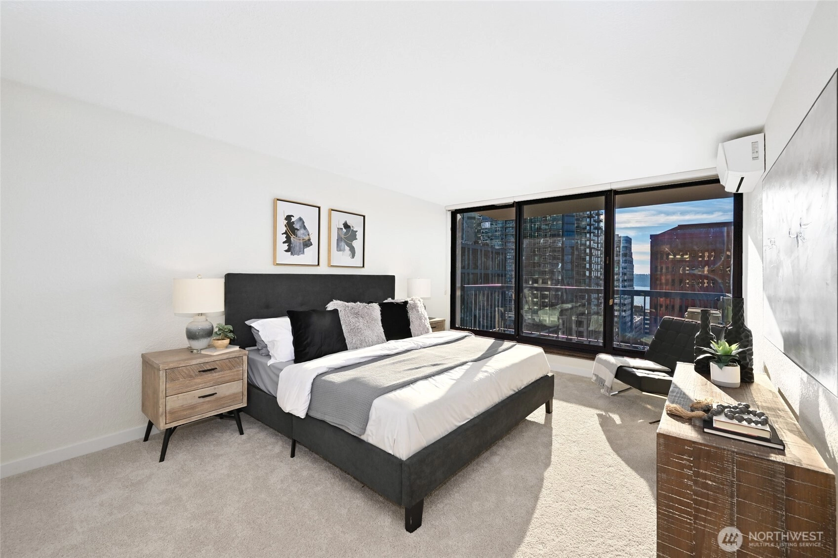 Step outside and you're in the middle of one of the most vibrant, walkable cities in the country. Step inside, and the city melts away into your own private sanctuary with unobstructed, protected views of Puget Sound, the Olympic Mountains, and the Seattle skyline. One of the best view values in the city, without question. This Belltown condo carries the lowest HOA dues per square foot in the neighborhood, with those dues covering all utilities, electricity and water included. Strong reserves and no special assessments. The westward exposure means the light builds beautifully through the day and gives way to unforgettable sunsets, all framed by floor-to-ceiling windows and two private balconies. Ferries, ships, wildlife, fireworks over the Sound, the Space Needle. The view is dynamic and ever-changing. The home is move-in ready and thoughtfully updated: air conditioning, in-unit washer/dryer, a large secure garage parking space with EV charging, and oversized private storage. Building amenities include a city-view pool, gym, sauna, and community room. Fully step-free from entry to unit, with effortless access to Pike Place Market, the waterfront, all stadiums, the Space Needle, and light rail. Everything Seattle has to offer is right outside your door.