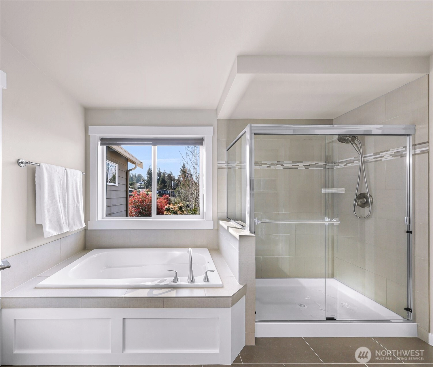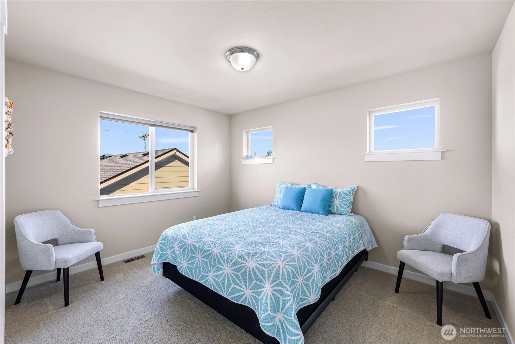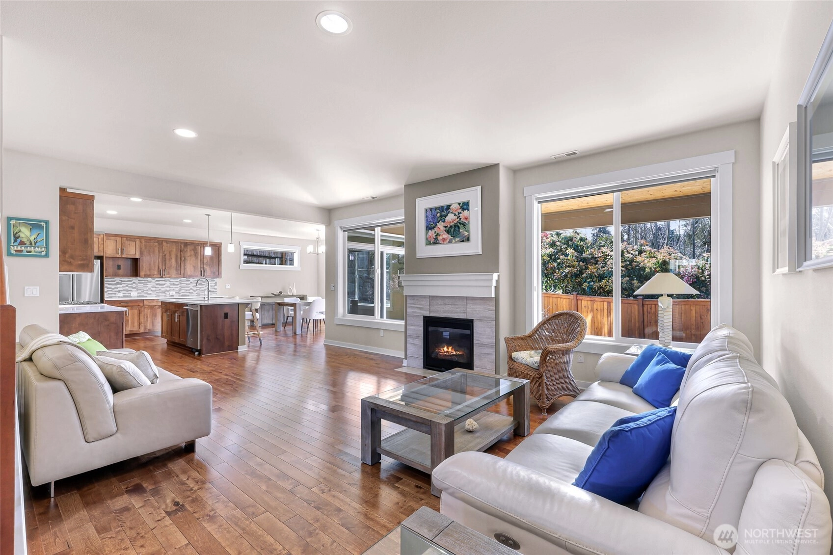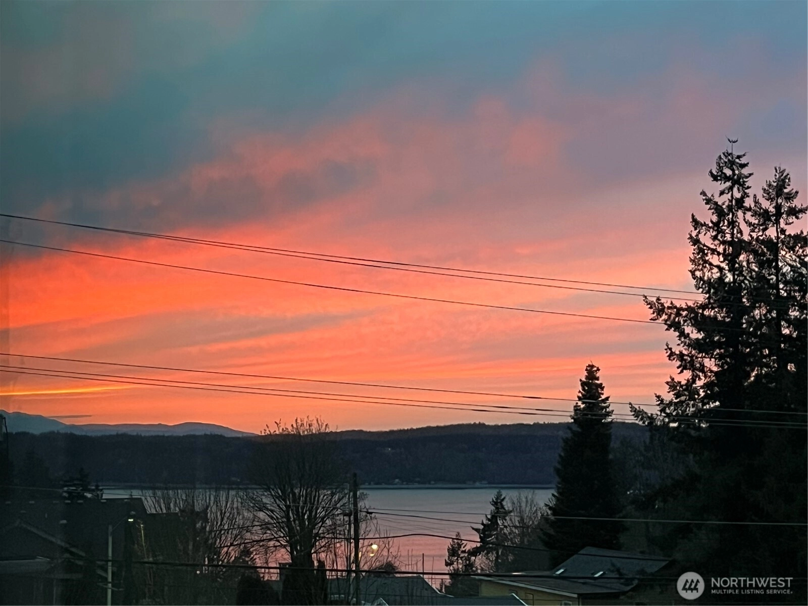 Discover this stunning two-story Northwest Contemporary featuring 5 bedrooms, a den, and an expansive bonus room. A charming Juliet balcony entry welcomes you in, leading past a den and a main-level bedroom with a 3/4 bath—perfect for guests or multi-generational living. The heart of the home opens into a bright, open-concept living space with a cozy gas fireplace, a chef’s island kitchen with an impressively large walk-in pantry, and a spacious dining area ideal for entertaining. Hunter Douglas blinds throughout and central A/C add comfort, style, and convenience throughout the home. Upstairs, retreat to the luxurious primary suite complete with dual walk-in closets. You’ll also find a convenient utility room, three additional bedrooms, and a full bathroom. The oversized bonus room offers breathtaking views of the Sound, Olympic Mountains, and unforgettable sunsets.