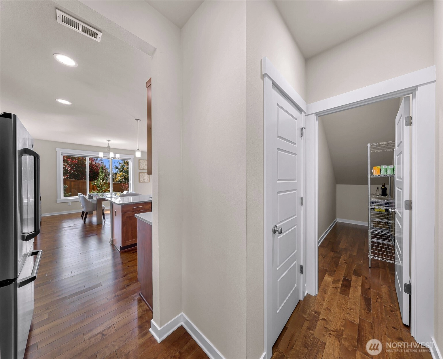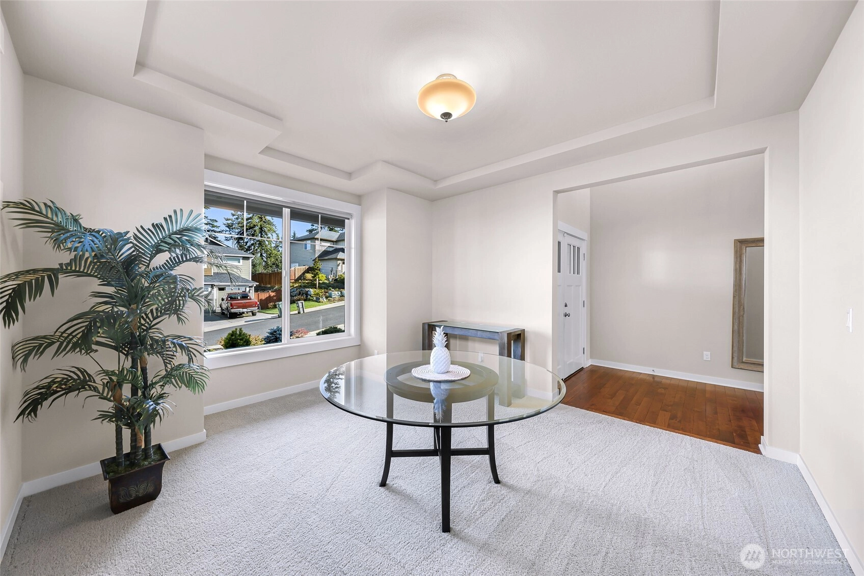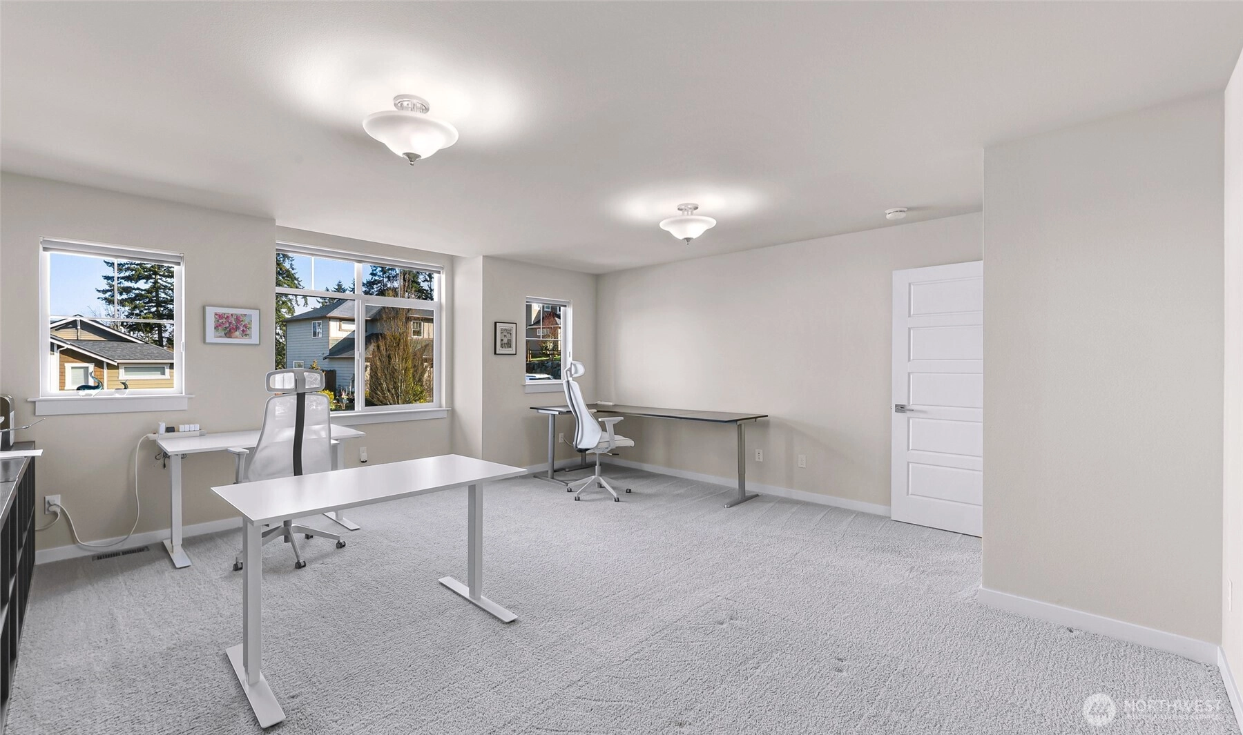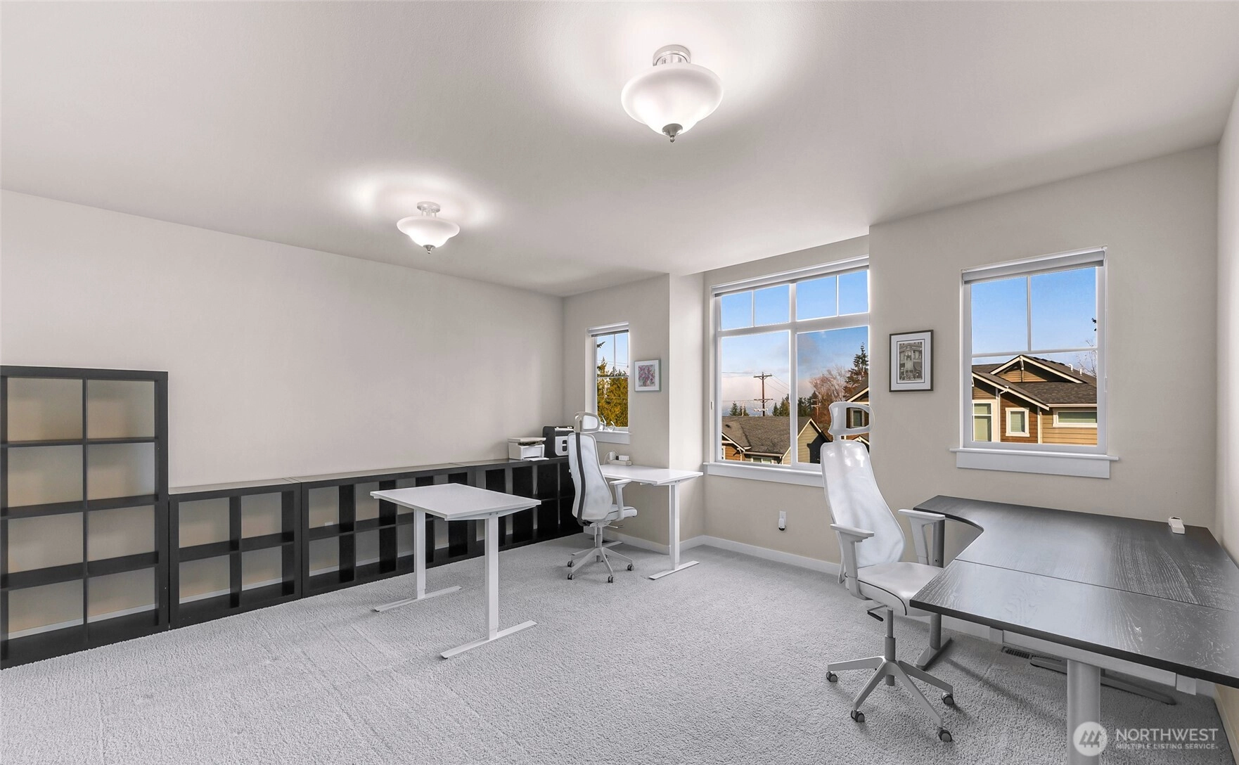 Discover this stunning two-story Northwest Contemporary featuring 5 bedrooms, a den, and an expansive bonus room. A charming Juliet balcony entry welcomes you in, leading past a den and a main-level bedroom with a 3/4 bath—perfect for guests or multi-generational living. The heart of the home opens into a bright, open-concept living space with a cozy gas fireplace, a chef’s island kitchen with an impressively large walk-in pantry, and a spacious dining area ideal for entertaining. Hunter Douglas blinds throughout and central A/C add comfort, style, and convenience throughout the home. Upstairs, retreat to the luxurious primary suite complete with dual walk-in closets. You’ll also find a convenient utility room, three additional bedrooms, and a full bathroom. The oversized bonus room offers breathtaking views of the Sound, Olympic Mountains, and unforgettable sunsets.