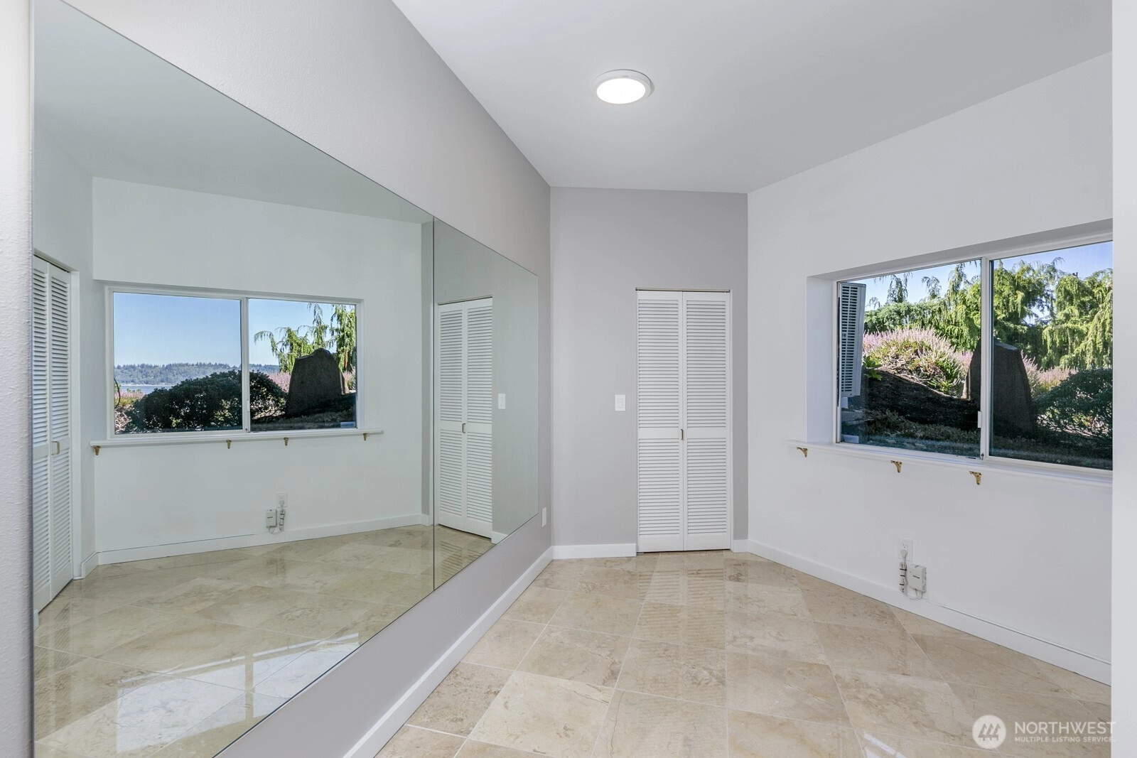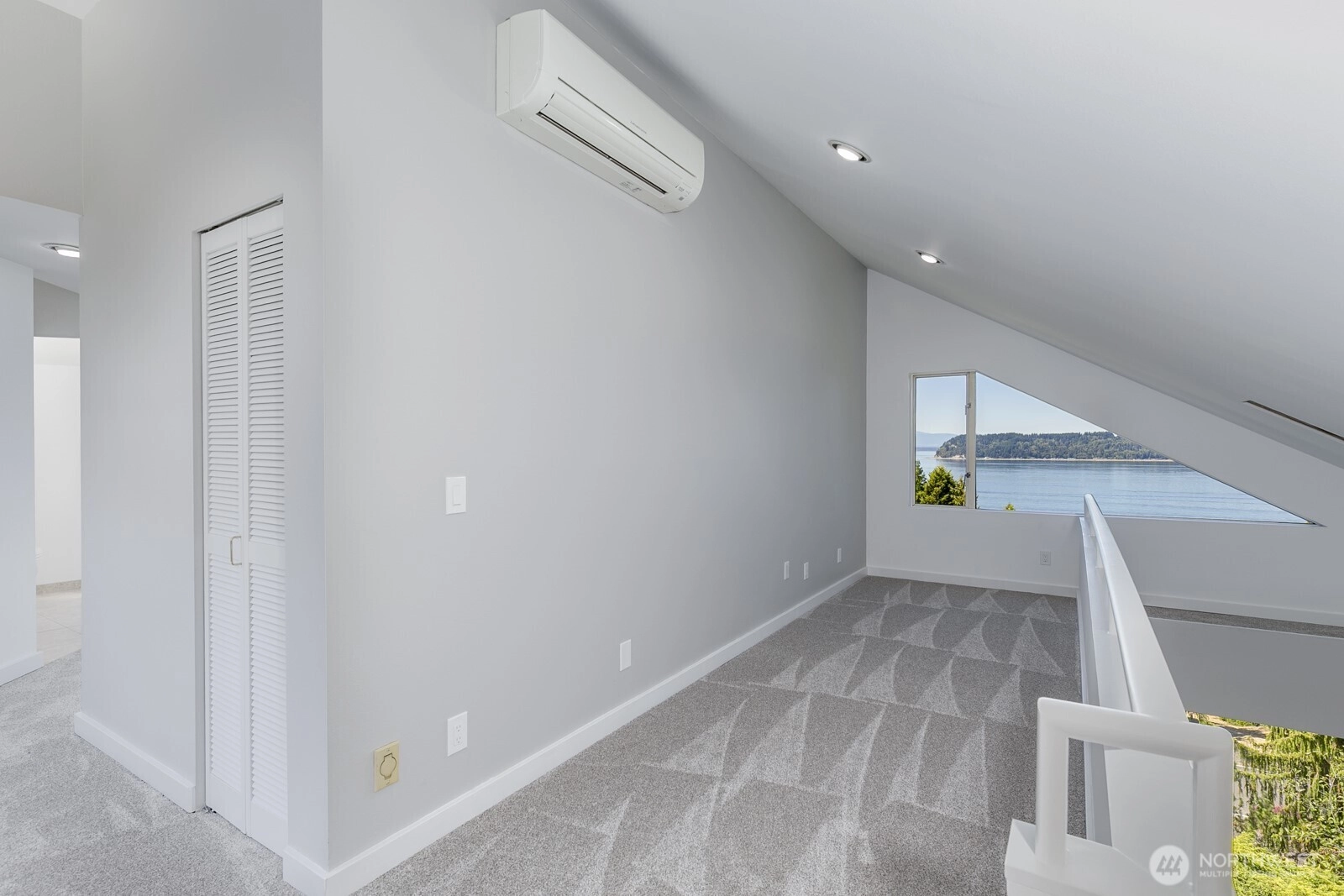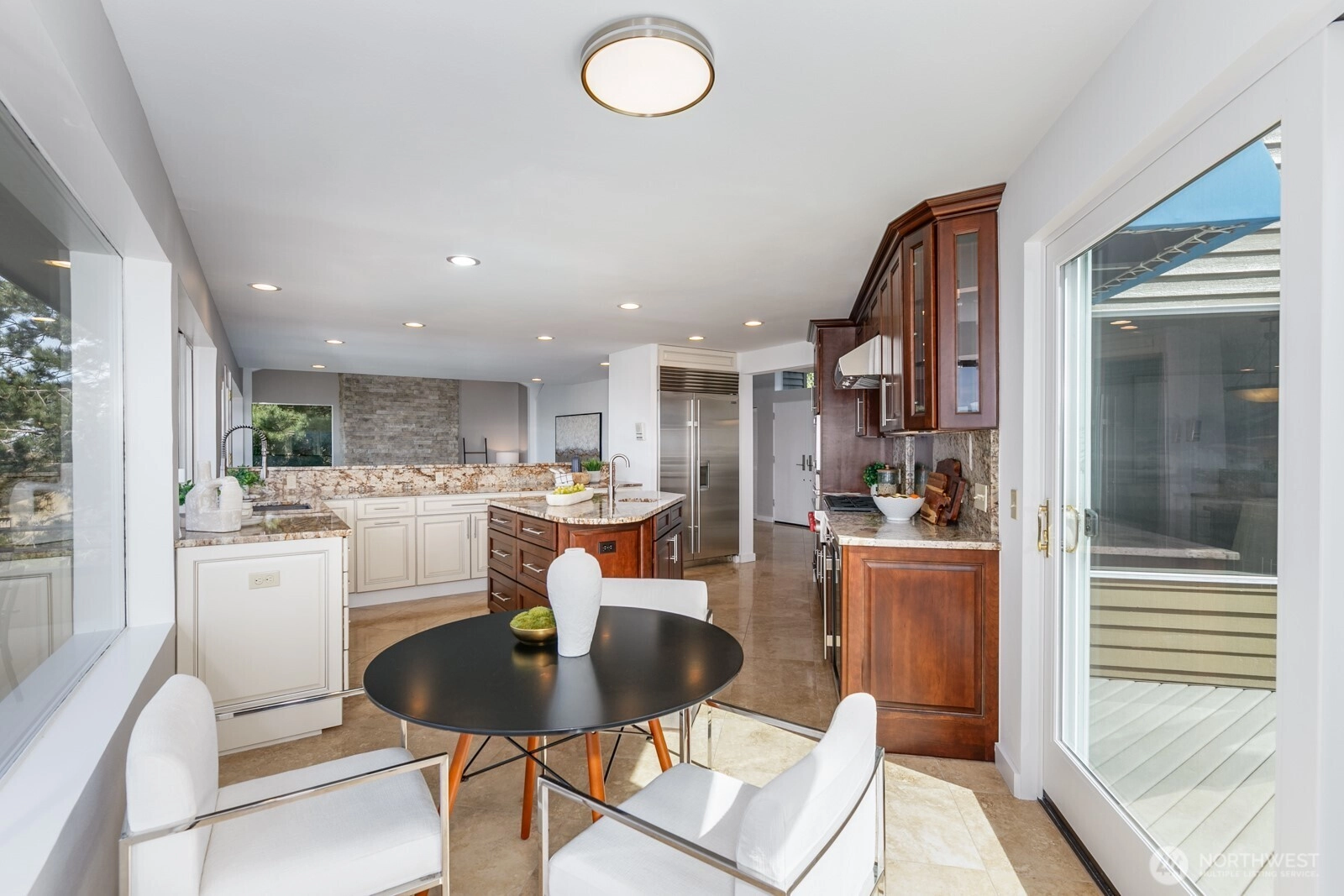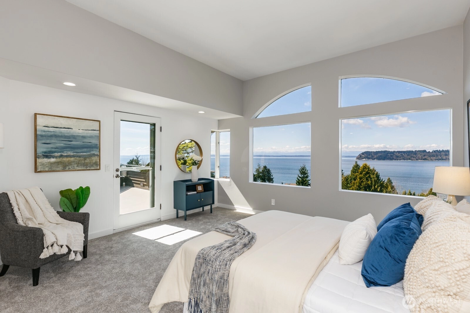 VIEW! VIEW! VIEW! NW Contemporary with a truly fabulous view to the west - the Olympics, Admiralty Inlet, shipping lanes + gorgeous sunsets. Open & airy with tall ceiling & big windows, not a cookie cutter home. 2nd floor primary w/private deck + office, full totally remodeled bath w/ porcelain tile & walk in closet. Main level family room or dining room, you choose, eating space in the island kitchen. The island kitchen has SS appliances, wine refer, Wolf, Dacor, Sub Zero, GE Profile, stone counters, new cabinets. Travertine tile on the main level, marble tile on lower level, home was just painted inside-out, new carpet, each level has in floor hot water heat which is super comfy, 2 mini-splits upstairs, close to shopping and Kamiak HS! Floor to ceiling stone gas fireplace. Two view decks on the main level. Even the bedrooms on the lower level have great views.
