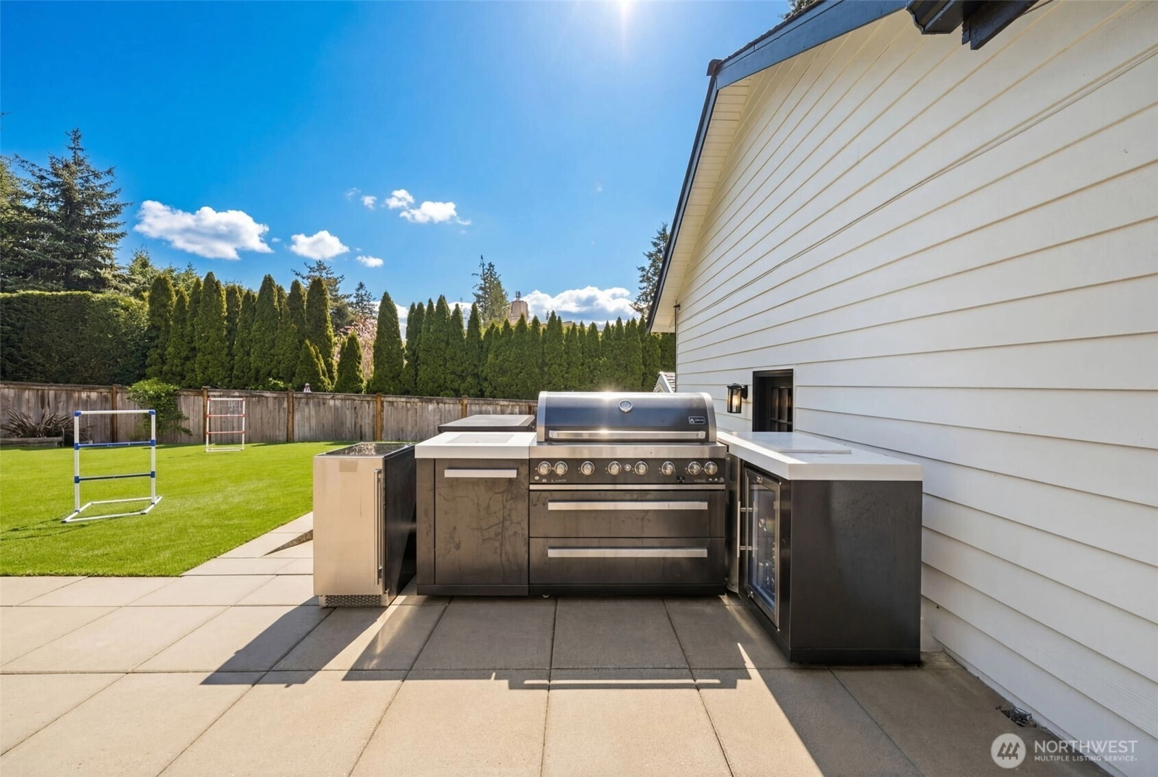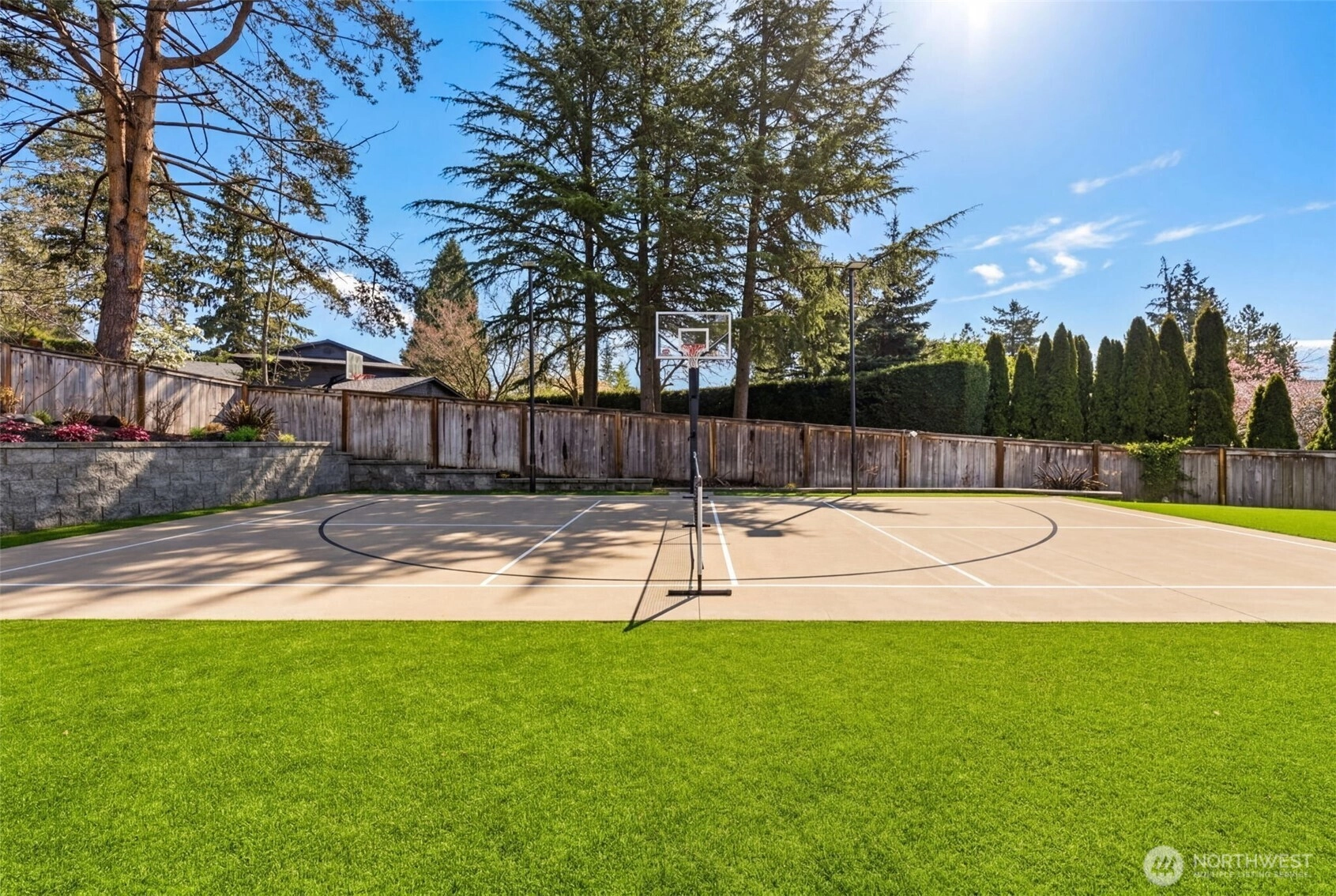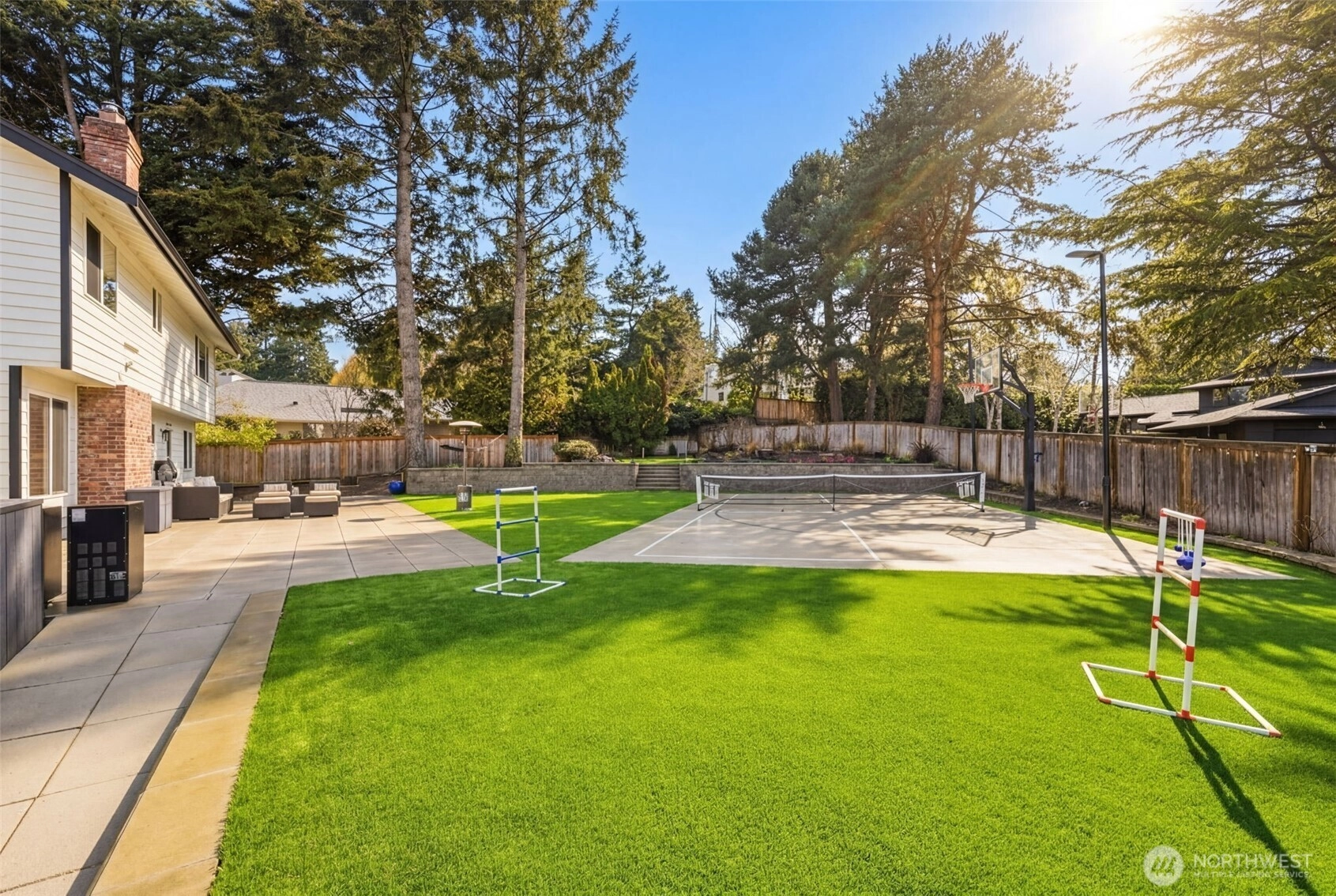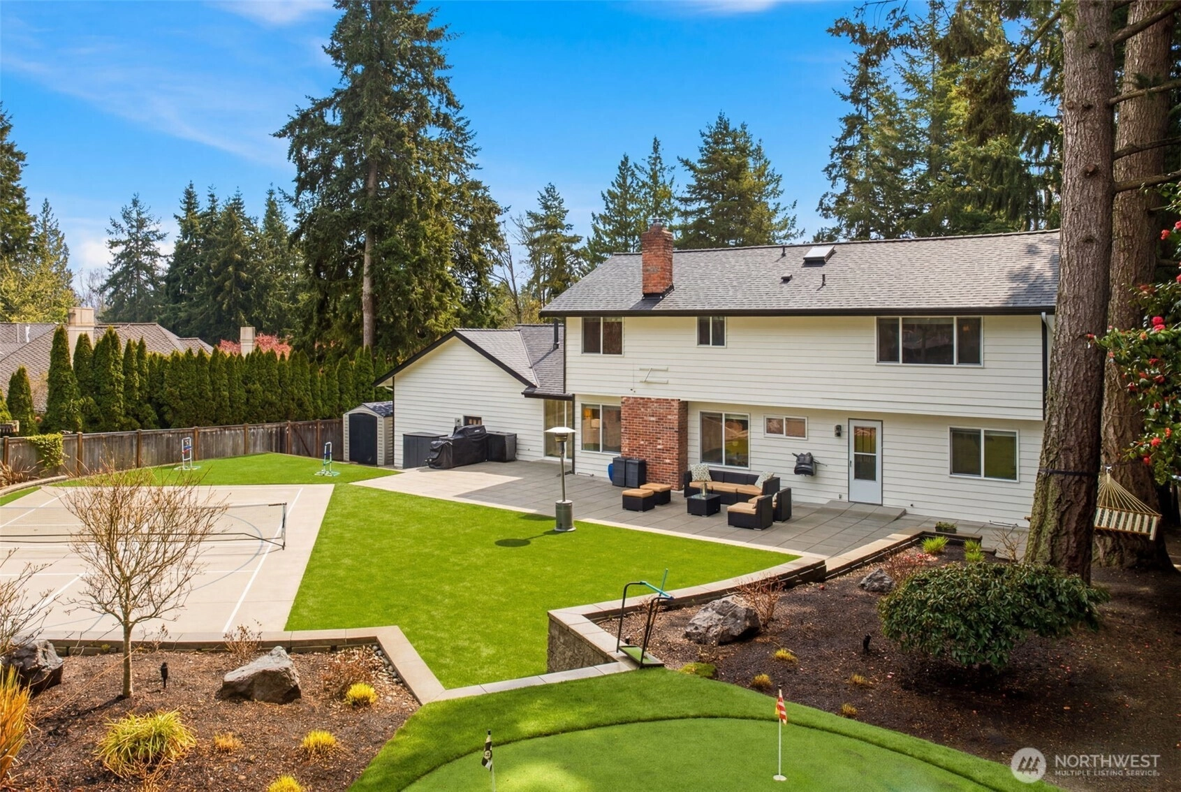 Step inside to a beautifully updated main level designed for modern living and effortless entertaining on a spacious 17,700sq ft lot. The renovated kitchen anchors the home with fresh finishes and great flow, complemented by new flooring throughout and integrated ceiling speakers on both levels and outdoors. A main-level flex room adds versatility—ideal as a guest room, office, or home gym. Upstairs, you’ll find 4 bedrooms, including a serene primary suite with a fully updated, light-filled bath enhanced by new skylights. Every bathroom has been stylishly remodeled, creating a cohesive, modern feel throughout the home. Over $350K in thoughtful upgrades elevate the property: new roof, gutters, exterior paint, garage doors, updated electrical panel, and added A/C for year-round comfort. And then… the backyard. A true showstopper and entertainer’s dream. Fully fenced, flat, and completely reimagined with turf, a sport court, putting green, spacious patio, grilling area, and outdoor kitchen. New irrigation and landscape lighting add both function and ambiance. Located on a quiet, walkable street near Medina Park, Medina Elementary, the beach, and Overlake Country Club—within the award-winning Bellevue School District. Turnkey, stylish, and ready for modern living.