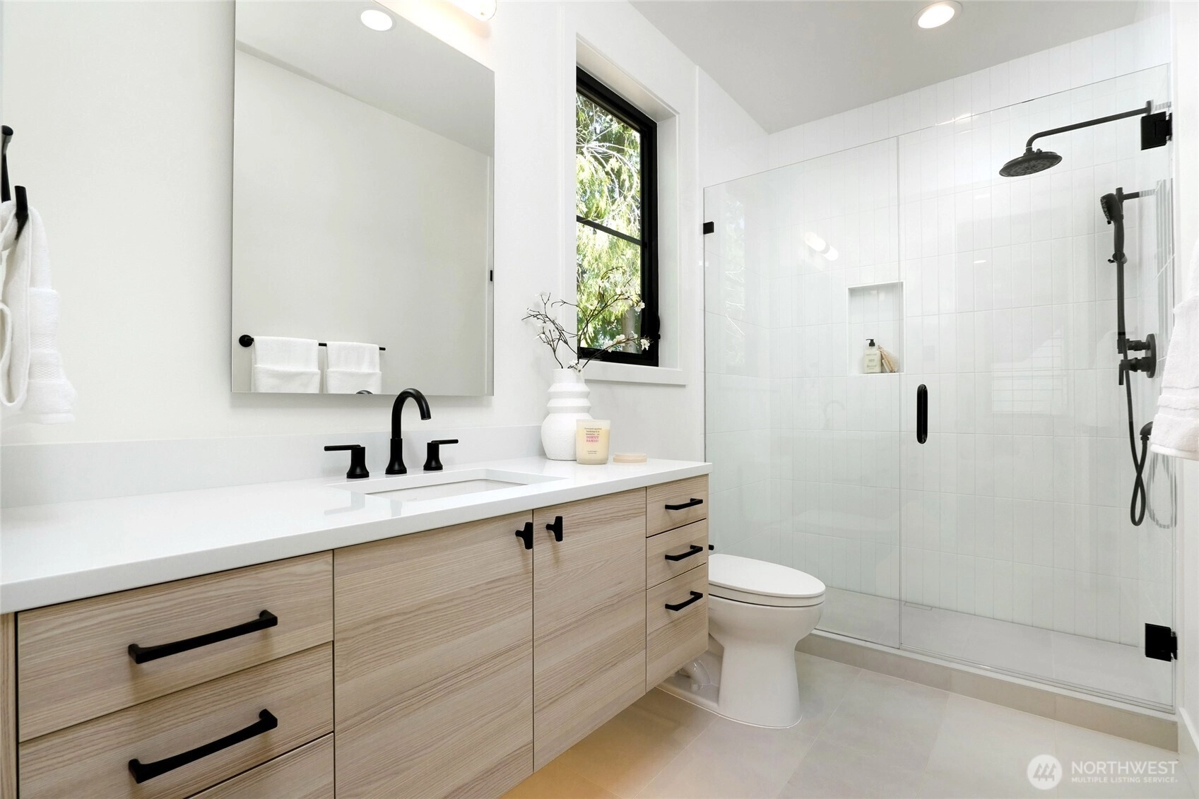 Serene, beautiful new home by Kirkland's premier local luxury home builder, RD Homes. Located in quiet, highly desirable neighborhood conveniently located to freeway, downtown Kirkland and Bellevue. Just blocks to area shops, restaurants, parks, trails and schools! Rarely available attached garage! Modern, elevated level quality, design and finish! Spacious, open flowing floor plan featuring chef's kitchen with Monogram appliance package. Comfortable upper level with two bedrooms and two baths. Stunning designer modern lighting and hardware. Custom, oversized windows throughout offer plenty of natural light. Premium sound system. Ring door bell, security system. Broan HRV Ventilation. Private yard space with irrigation. Garage EV ready, room for storage