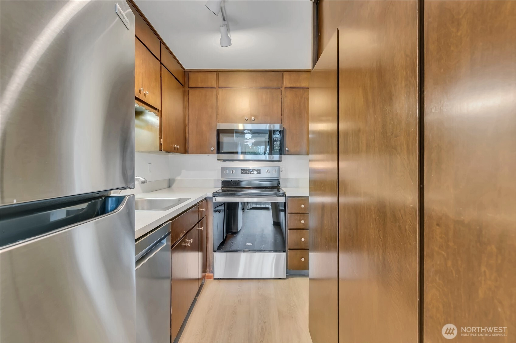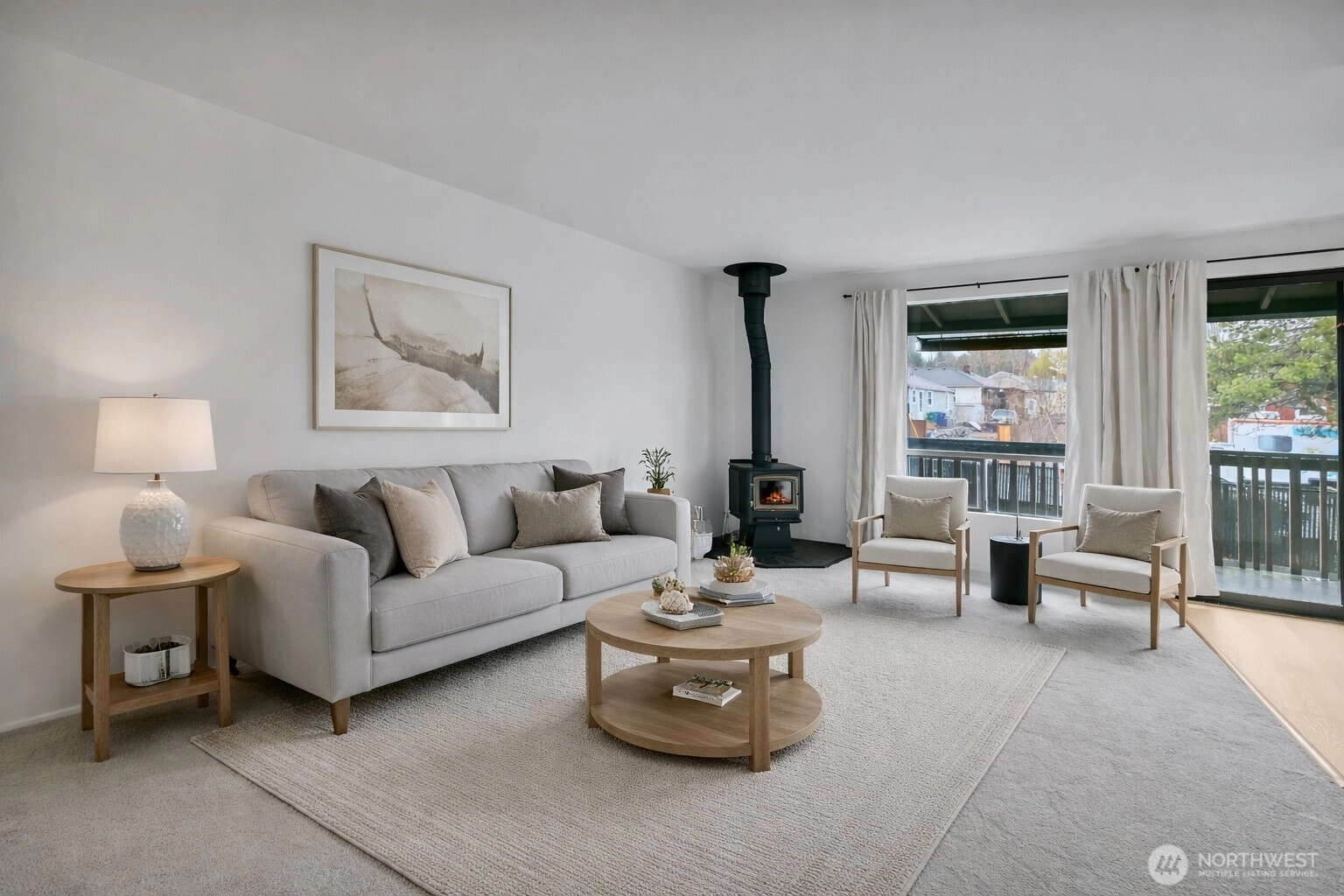 Well-priced Colony Square condo in a convenient Tukwila location! Situated in a gated community, this top-floor 1-bedroom, 1-bath, single-level unit offers a spacious living area with a cozy freestanding wood stove. Recently refreshed with brand new interior paint and updated flooring, including neutral carpet and stylish luxury vinyl plank, this home is truly move-in ready. The kitchen features ample cabinetry and brand new stainless steel appliances, providing both functionality and a modern touch.The generous bedroom includes a wall-to-wall closet and ceiling fan, while the top-floor setting allows for natural light and an open, airy feel throughout. Enjoy a private deck off the dining area with a convenient 4x4 storage closet. Assigned parking is located close to the stairs for easy access.The community offers on-site laundry and maintained common areas. With strong rental potential and possible DSCR financing, this is an excellent opportunity for both homeowners and investors.
