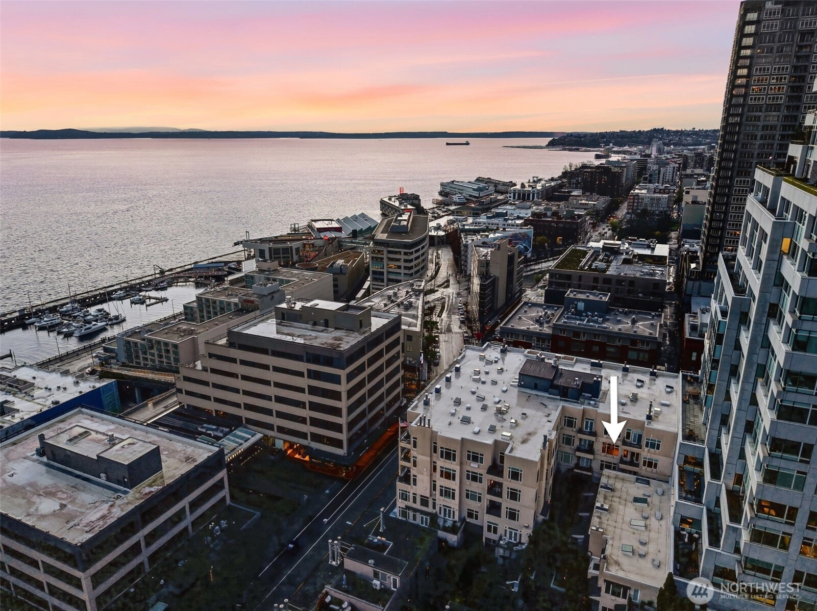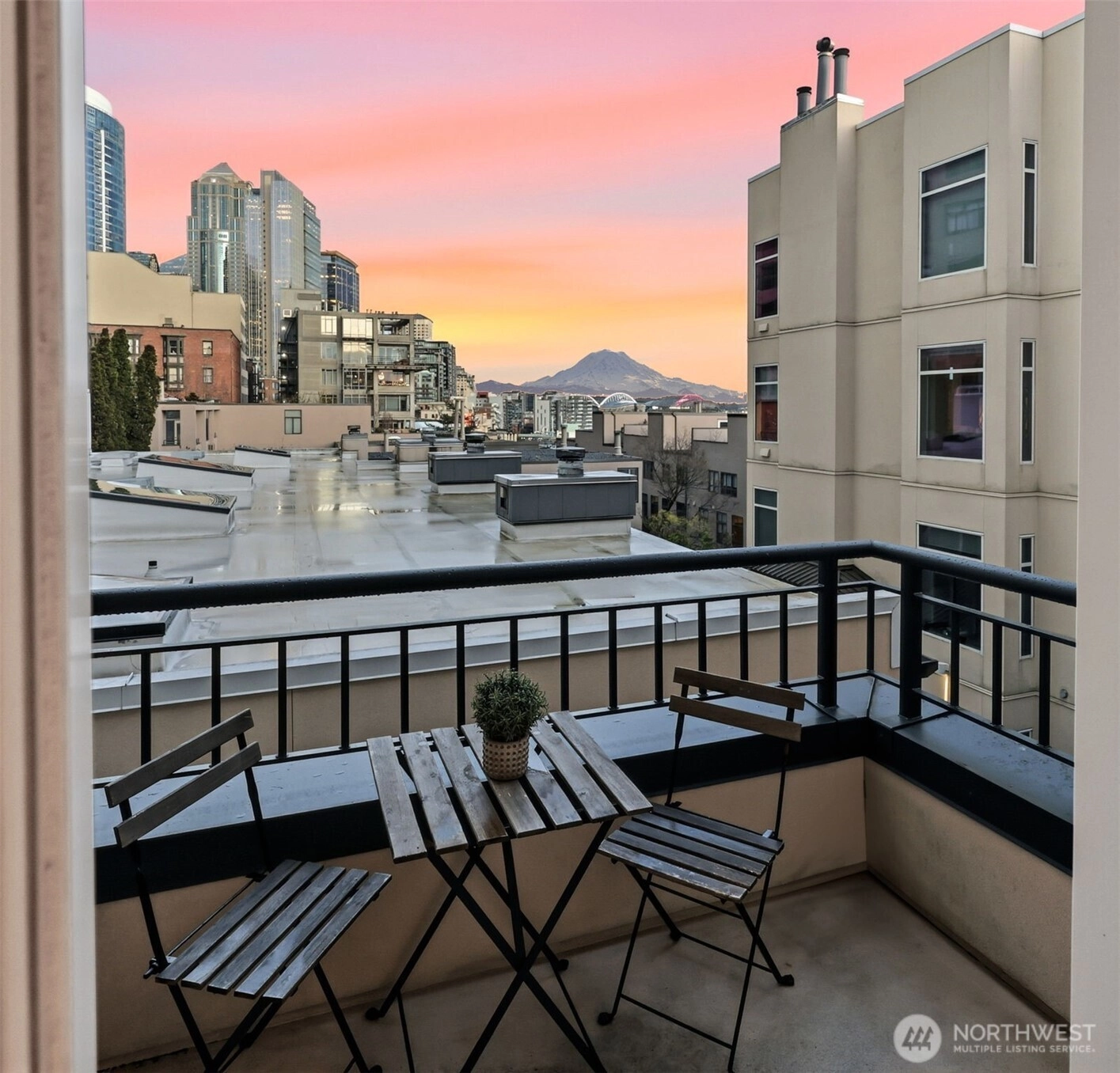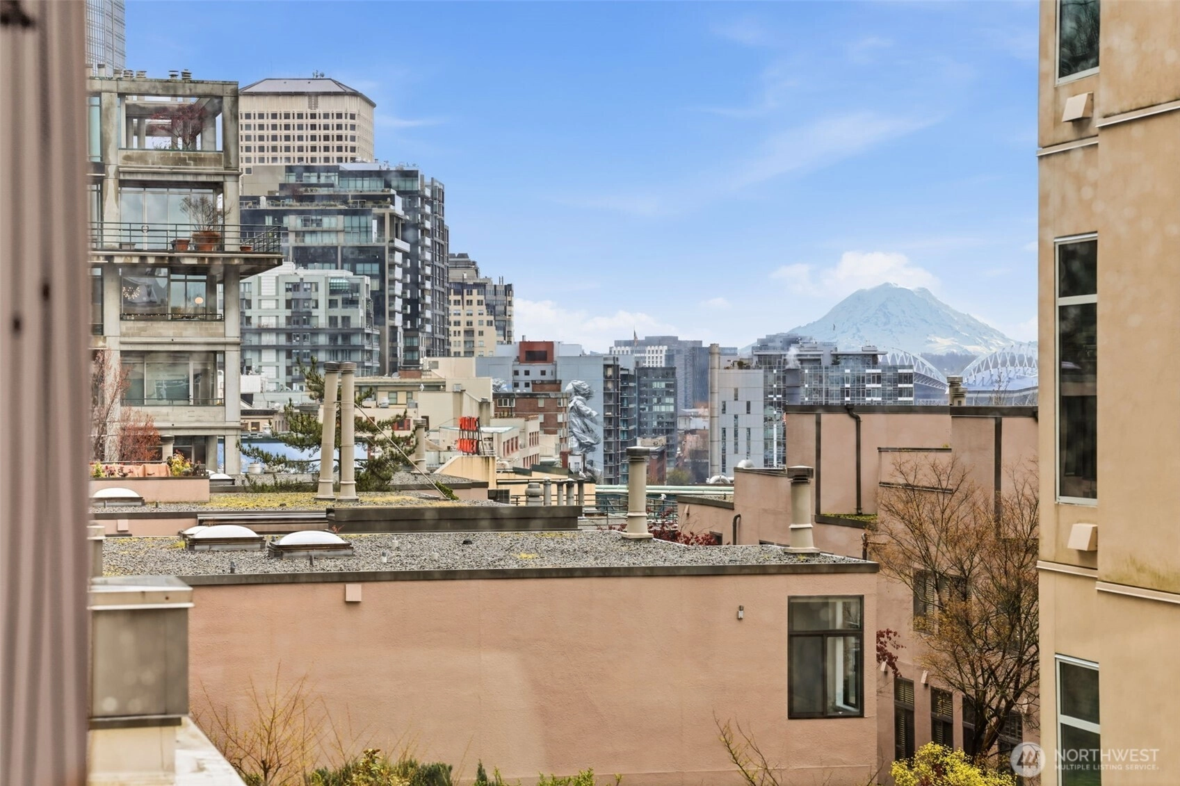 Tucked into the quiet northern edge of Pike Place Market with a front row seat to one of Seattle's most treasured places, Market Court is a singular gem. Shop for legendary seafood, produce, flowers & more right outside your doorstep. Inside the home, soaring high ceilings, bright southern exposure and floor-to-ceiling windows let in the light and impart serenity and calm. Warm-hued hardwood and cork flooring throughout + thoughtfully outfitted kitchen with Fisher Paykel & Miele appliances. Sparkling city views out to Mt. Rainier and the stadiums from the living room, private deck and palatial bedroom are beautiful reminders that you are in the heart of the city. Solid building with well-managed HOA, solid reserves plus an on-site concierge. Lovely verdant building patio w/fountain provides an extra space to escape to, with private gate access to Post Alley.