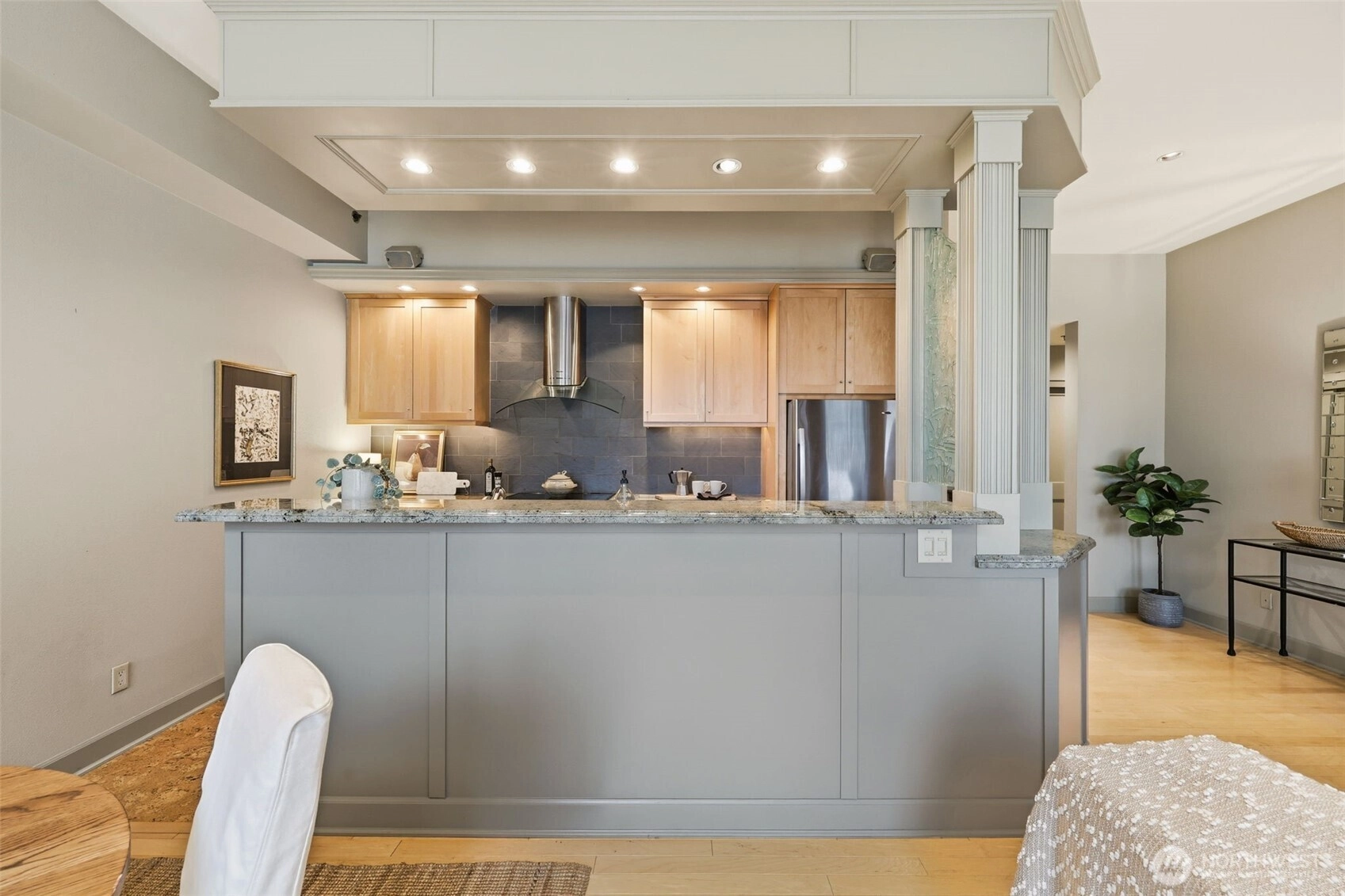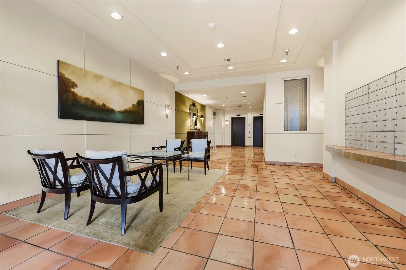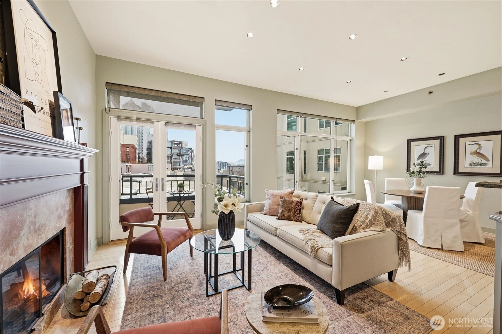 Tucked into the quiet northern edge of Pike Place Market with a front row seat to one of Seattle's most treasured places, Market Court is a singular gem. Shop for legendary seafood, produce, flowers & more right outside your doorstep. Inside the home, soaring high ceilings, bright southern exposure and floor-to-ceiling windows let in the light and impart serenity and calm. Warm-hued hardwood and cork flooring throughout + thoughtfully outfitted kitchen with Fisher Paykel & Miele appliances. Sparkling city views out to Mt. Rainier and the stadiums from the living room, private deck and palatial bedroom are beautiful reminders that you are in the heart of the city. Solid building with well-managed HOA, solid reserves plus an on-site concierge. Lovely verdant building patio w/fountain provides an extra space to escape to, with private gate access to Post Alley.