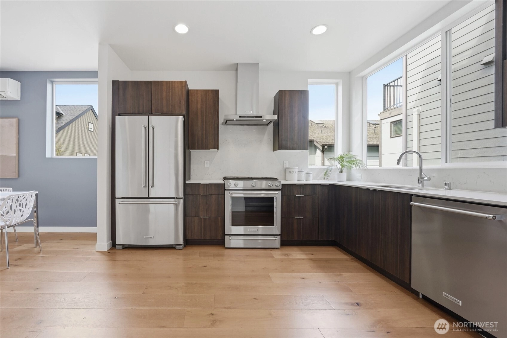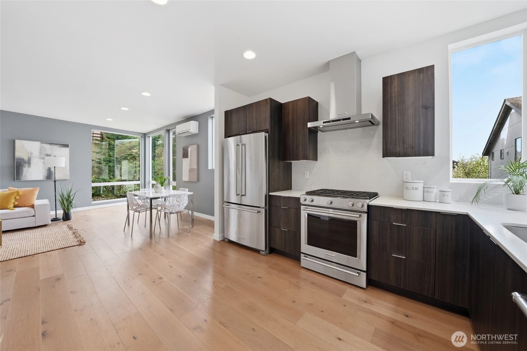 Some rooftop decks have views. This one has front-row seats to fireworks over Lake Union. From your private rooftop terrace, take in shimmering water, Queen Anne to the west, and the Downtown skyline glowing to the south. It is a setting that feels made for summer evenings, sunset dinners, and effortless entertaining. Unlike many rooftop spaces, this one connects seamlessly to the main living areas, creating a natural flow that elevates everyday living as much as special occasions. Inside, the layout is equally refined. Two bedrooms and two full baths are positioned upstairs, while an attached one-car garage offers a rare level of convenience on Yale Ave. No circling for parking. No HOA. Crafted by Blue Fern Development, the home blends modern design with elevated finishes, including wide plank oak floors, KitchenAid stainless appliances, and Moen fixtures throughout. Set in the heart of Eastlake, one of Seattle’s most coveted neighborhoods, this is a home that delivers beauty, function, and a rooftop experience that feels truly exceptional.