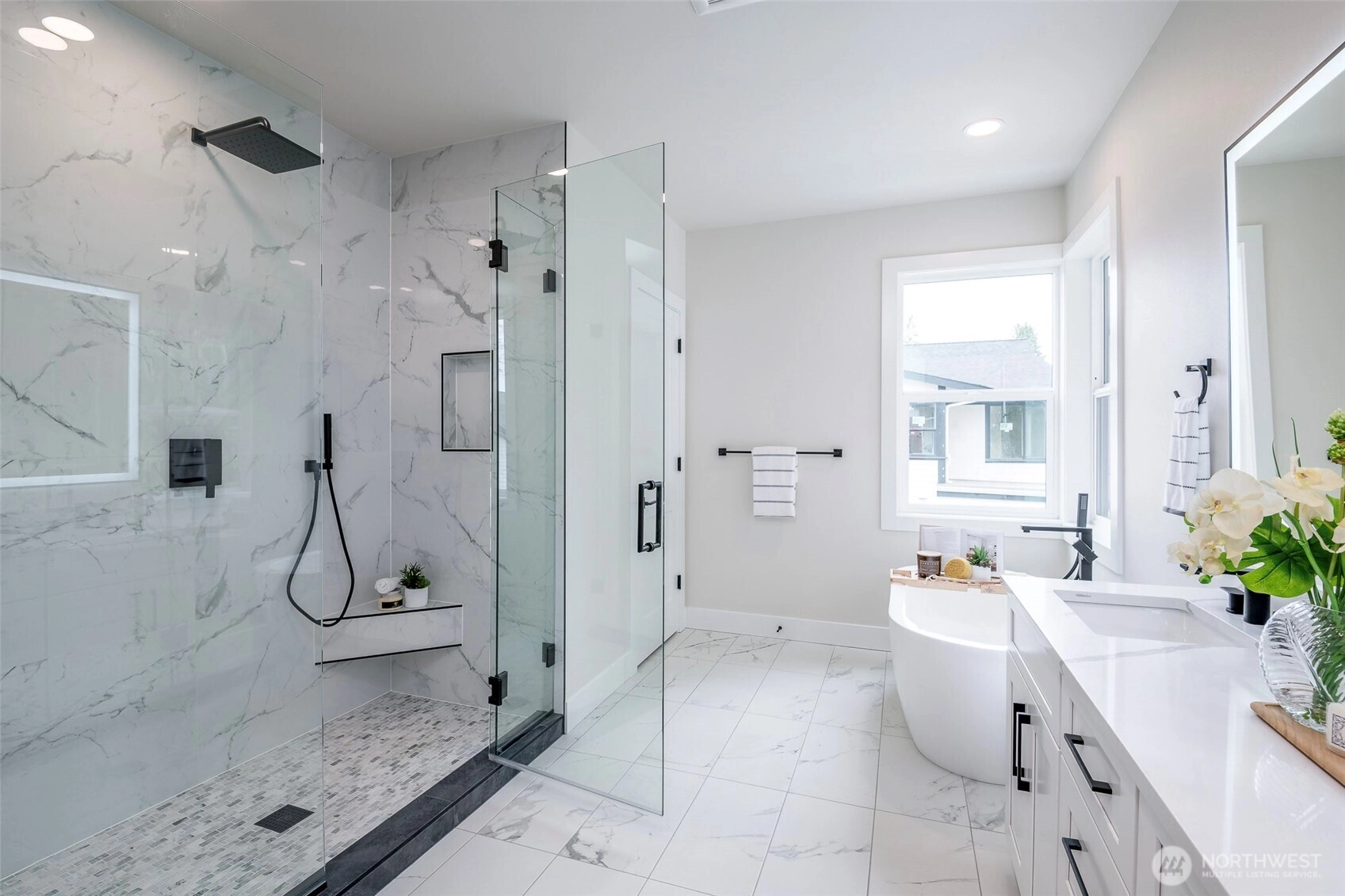 Meraki Homes presents a rare two homes for one opportunity in the sought-after Rose Hill community of Kirkland. Featuring a stunning modern residence plus a detached ADU, ideal for multi-generational living, rental income, or guest quarters. This thoughtfully designed home showcases 10-ft ceilings, wide-plank hardwood floors, and elegant crown molding. The main level offers exceptional flexibility with two private offices, En-suite, mudroom with built-ins, all perfect for today’s lifestyle. A light-filled great room flows seamlessly into the chef’s kitchen, complete with premium finishes, expansive island, and walk-in pantry. Upstairs, retreat to the luxurious primary suite welcomed by double doors and featuring a cozy sitting area, fireplace, spa-inspired bathroom with heated floors, soaking tub, and walk-in closet. Every detail has been curated for comfort and sophistication. Enjoy seamless indoor-outdoor living with a covered patio, mature trees and grass completes a nice Northwest feel. Truly unique offering combining style, function, and versatility. Live in one and rent the other, or enjoy both in one of Kirkland’s most desirable neighborhoods.