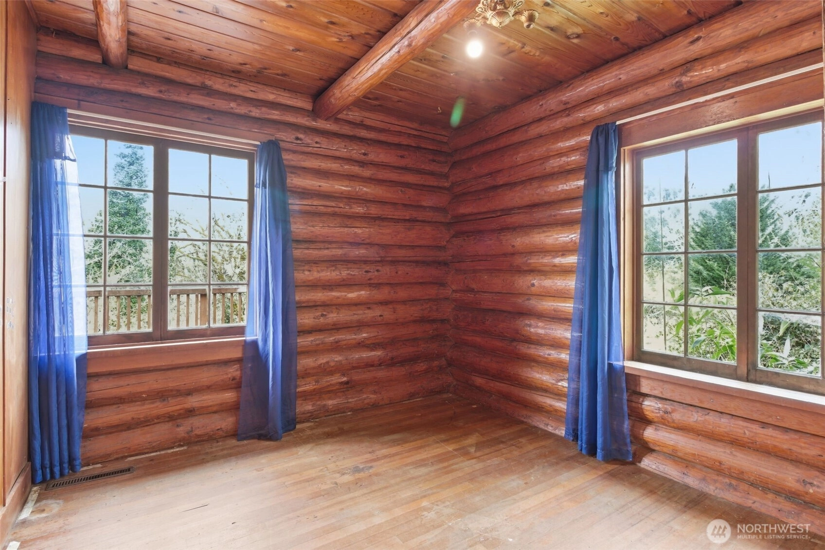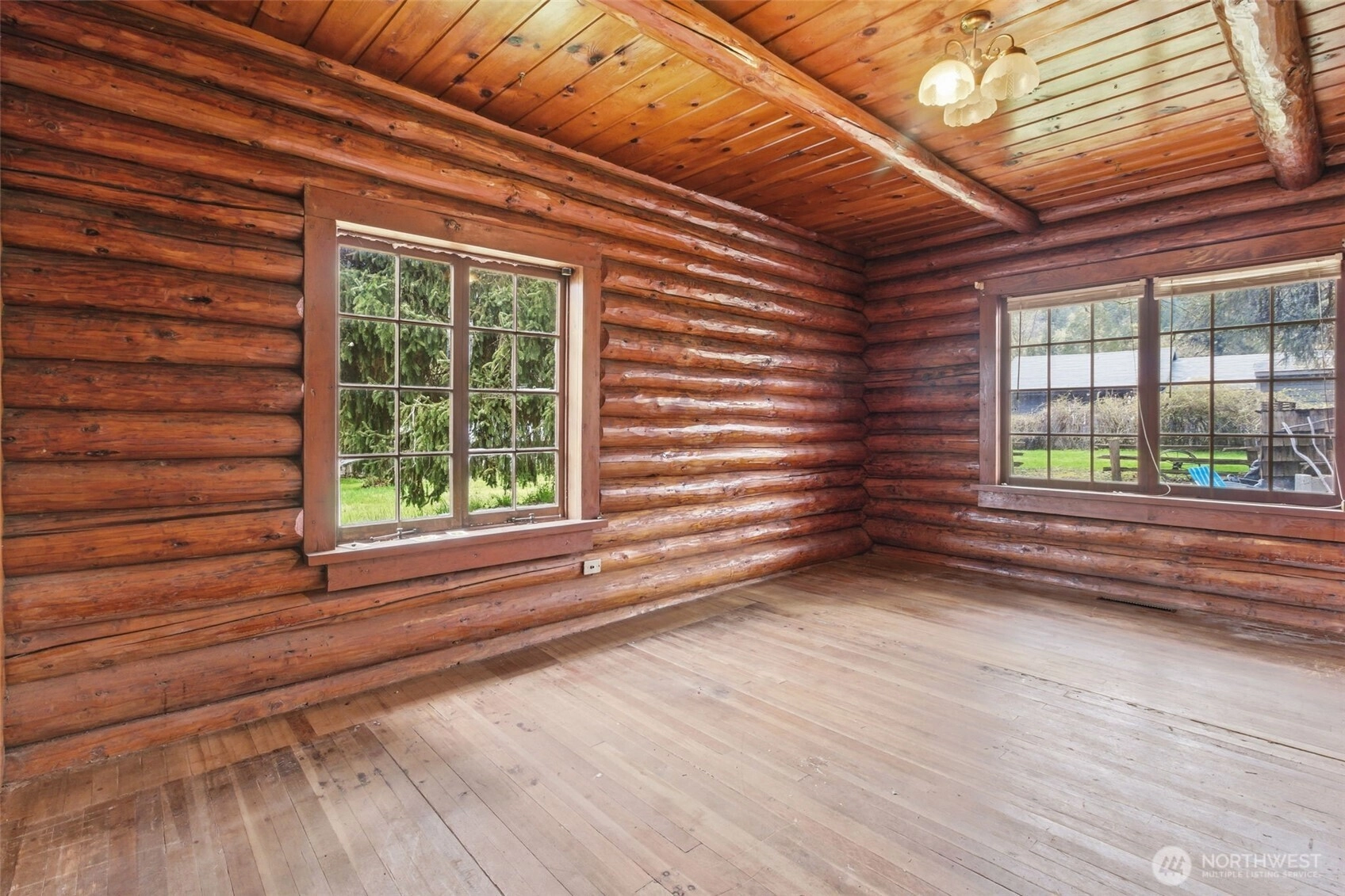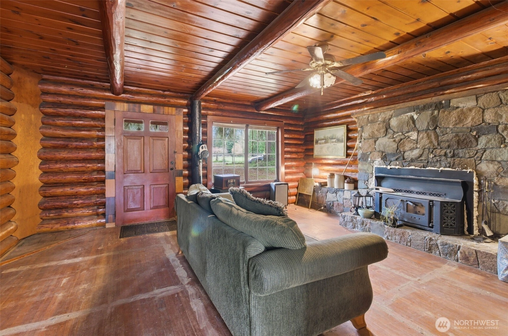 Opportunity awaits on 3.57 acres! This 2-bed, 1-bath log home is ready for your ideas and updates. Home features hardwood floors, kitchen with backyard access, and a dining room. The basement includes laundry and additional space. Property includes a deck, RV hookup, two large outbuildings, and fruit trees—ideal for those looking to create a hobby farm or invest in acreage with potential.