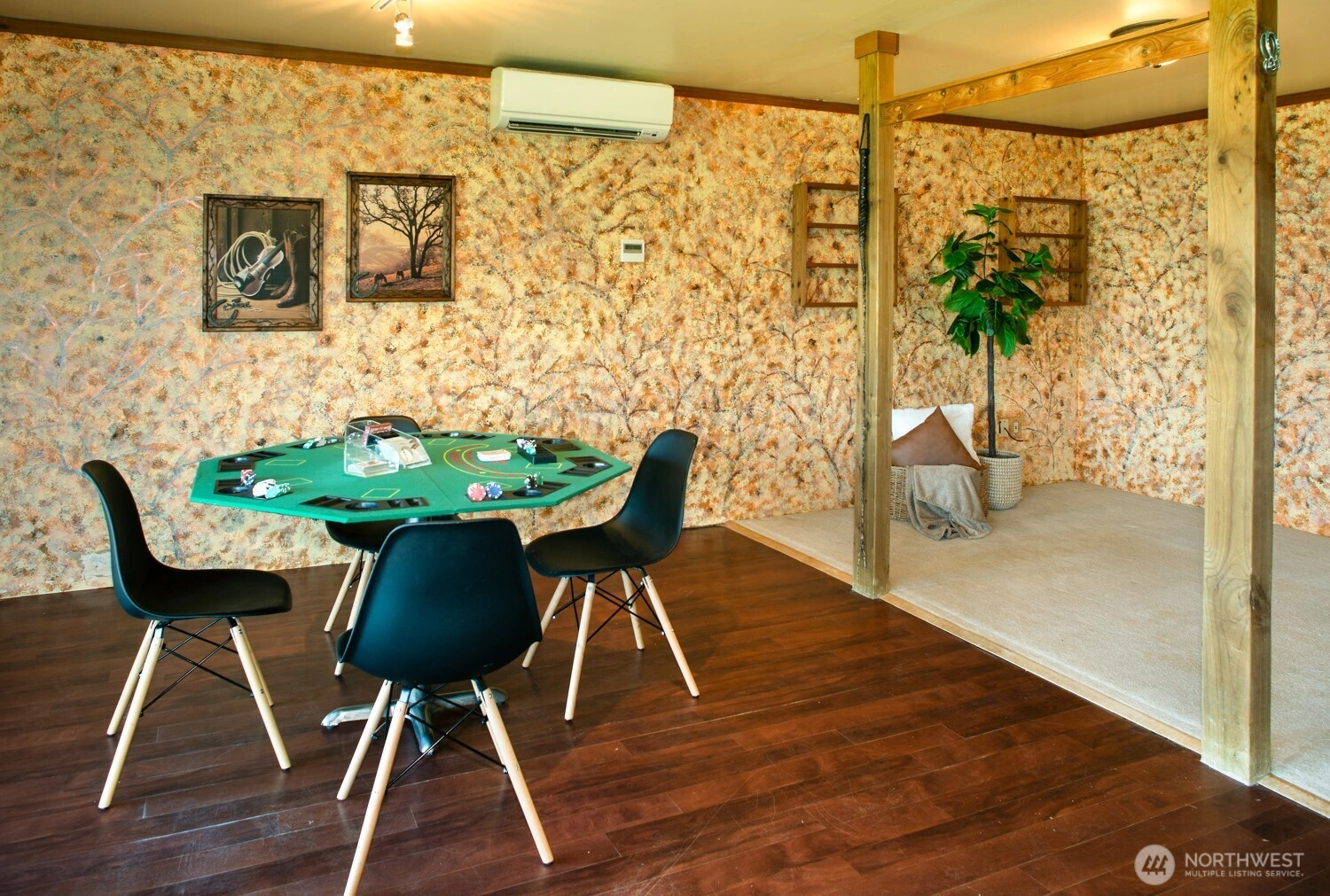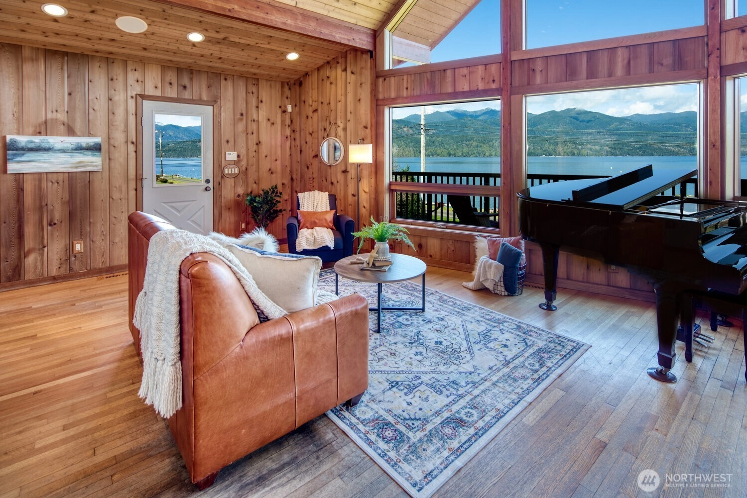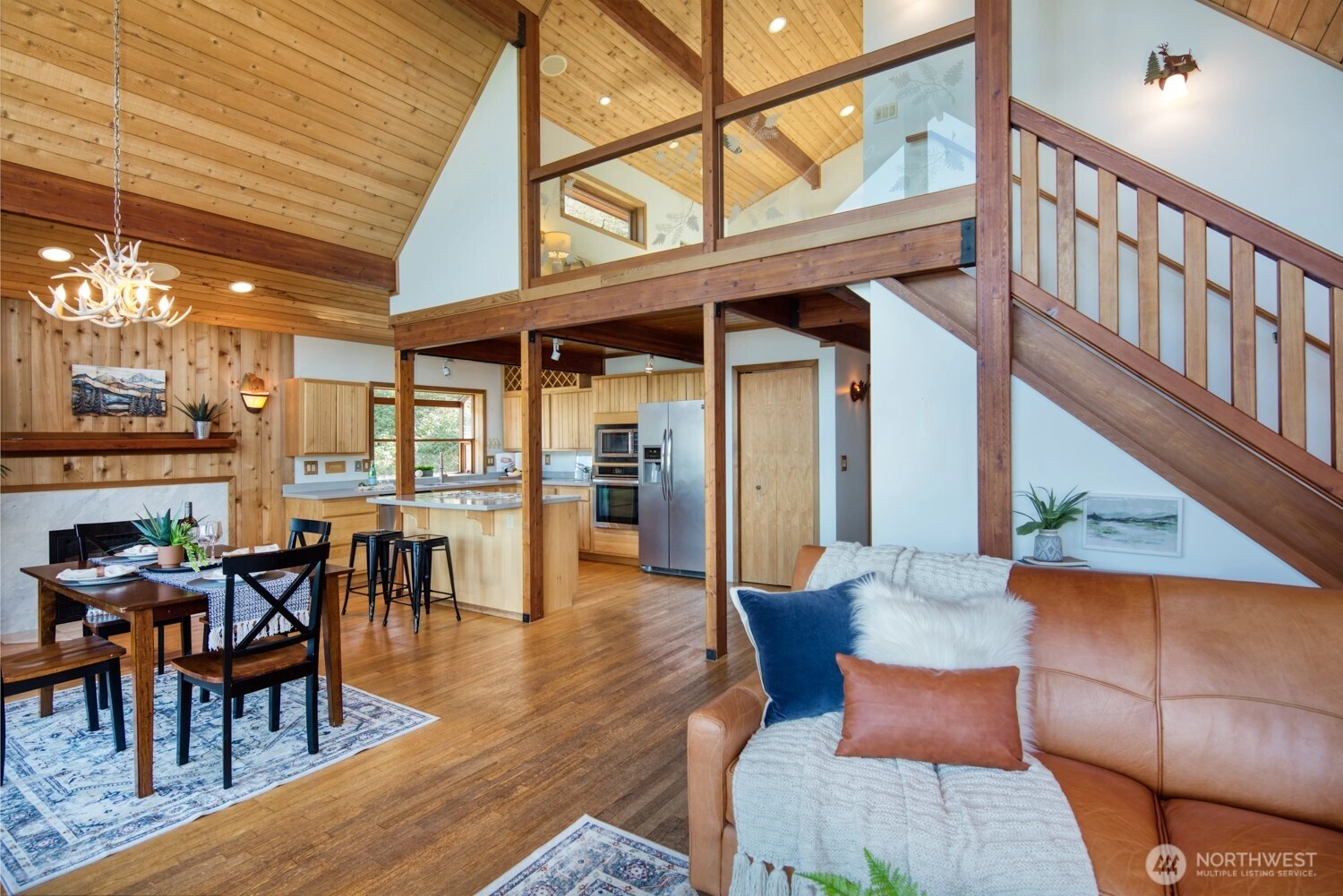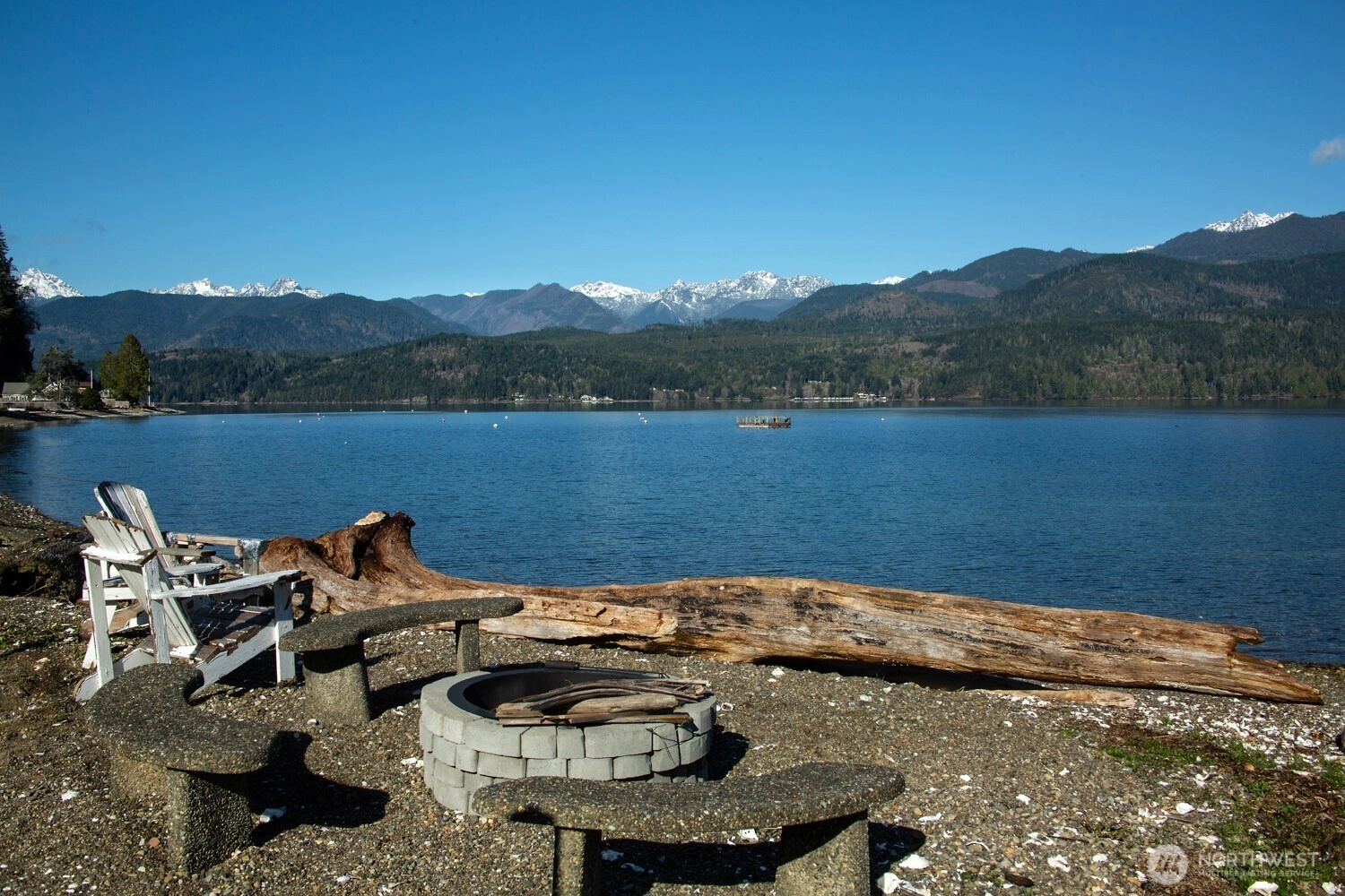 The View that dreams are made of. Outside your front wall of windows, you'll see the stunning Olympic Mountains, your beachfront on Hood Canal, and seafood in your front yard during the season. This charming three-story "A" Frame offers this view from the private master suite upstairs, to the main floor living room, kitchen, and additional bedroom, office, or your full-size deck. The ground level features an entertainment room with the same breathtaking view. This floor includes a flex room and a three-car garage that can also serve as a two-car garage and workshop. With a large front yard for lawn games and a spacious backyard with a cute shed and porch, and a creek trickling down the side of the property, you have plenty of space to make all your dreams come true.