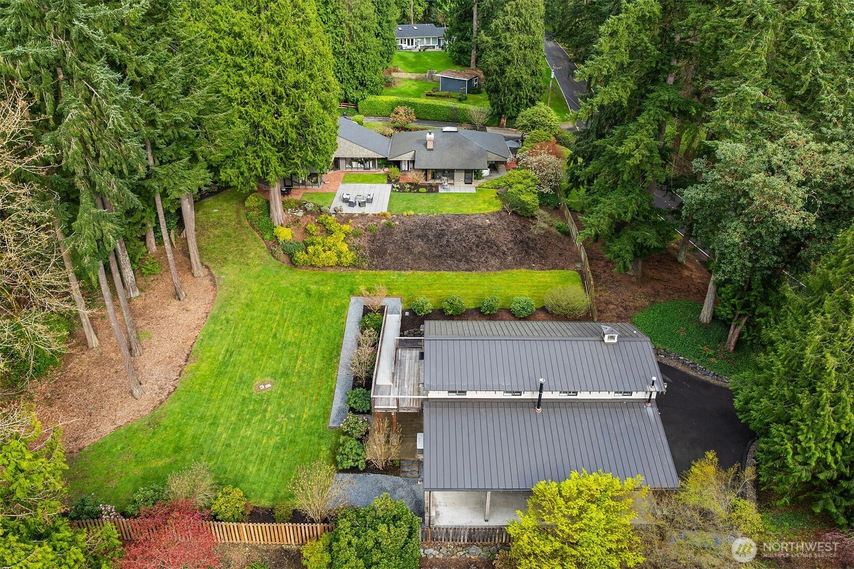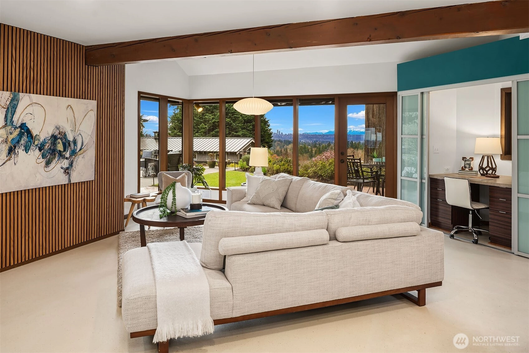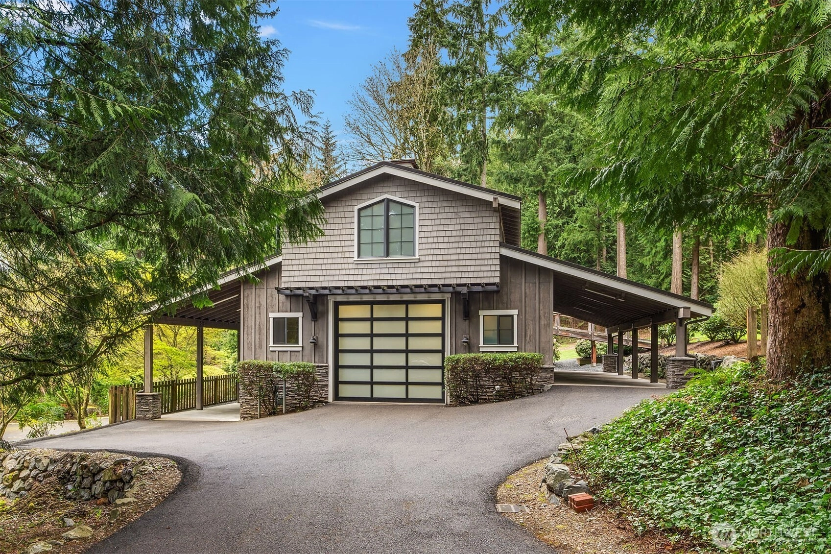 Distinctive David Gray mid-century modern estate in Pike’s Peak w/sweeping city/lake/mtn views & 3 separate structures. 3,050 ft2 Main House & 1,270 ft2 Guest House w/addtl 1,000ft2 detached office (5,320ft2 total)! Main House offers 20’ vaulted ceilings, skylights, extensive indoor lighting, main floor primary suite, 3 beds/2.5 baths, 3 exterior patios, remodeled kitchen/baths, attchd 2-car garage & more! Guest house connected w/ breezeway offers 2nd kitchen, 1 bed/1 bath, fireplace, 2 addtl patios, 1-car attchd garage. Car enthusiasts’ dream - detached garage/office with storage for 10 vehicles. Sun-drenched west-facing 1+ acre grounds directly adjacent to Bridle Trails State Park, fully landscaped & exclusively private. Extensive systemic upgrades. Welcome home…
