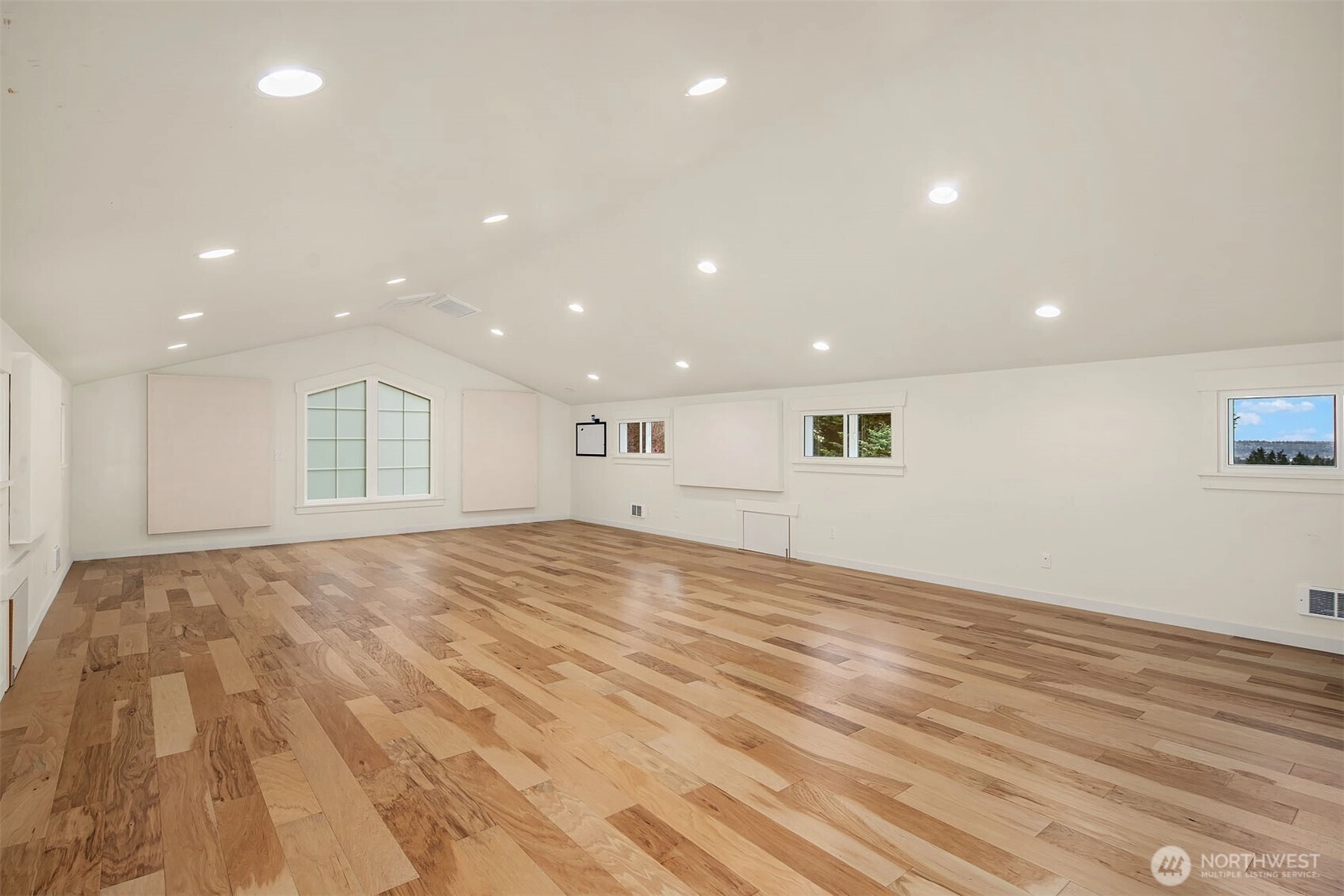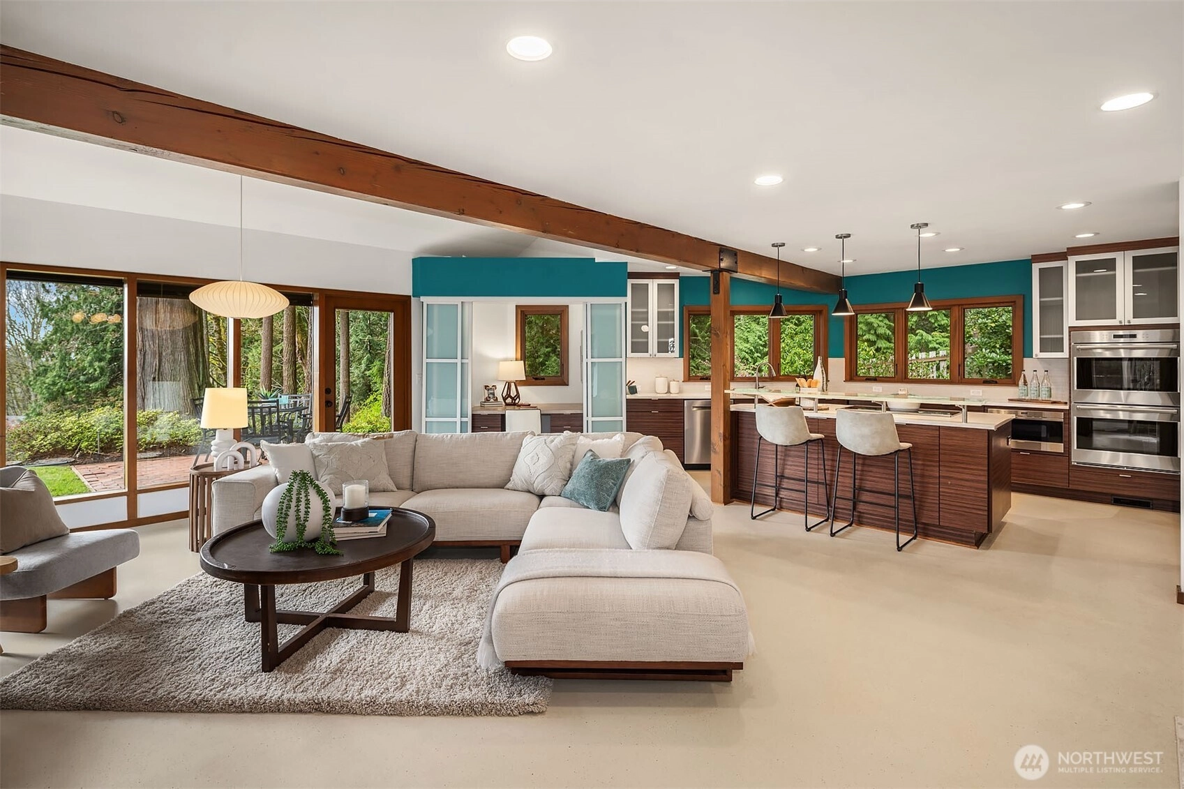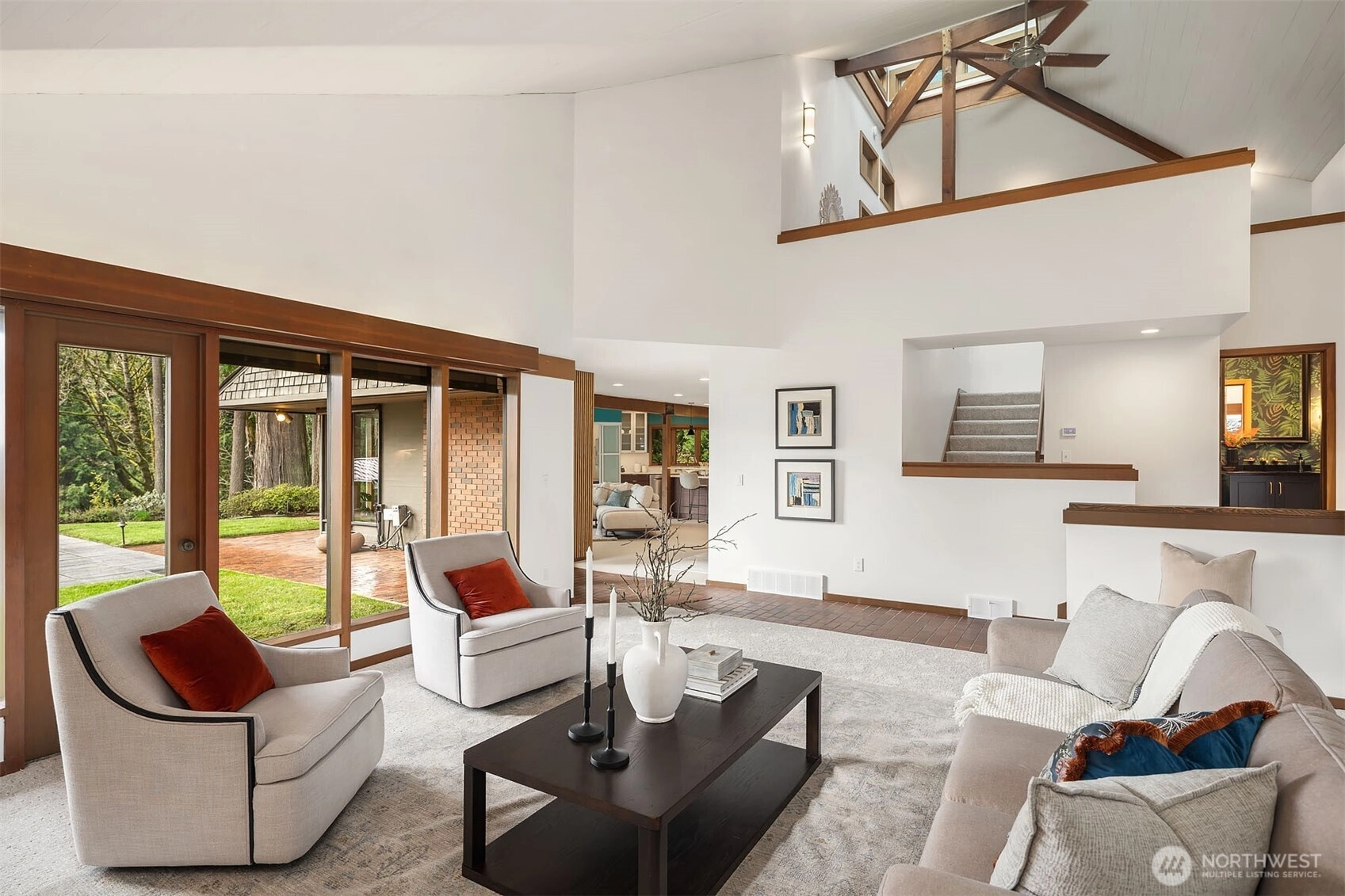 Distinctive David Gray mid-century modern estate in Pike’s Peak w/sweeping city/lake/mtn views & 3 separate structures. 3,050 ft2 Main House & 1,270 ft2 Guest House w/addtl 1,000ft2 detached office (5,320ft2 total)! Main House offers 20’ vaulted ceilings, skylights, extensive indoor lighting, main floor primary suite, 3 beds/2.5 baths, 3 exterior patios, remodeled kitchen/baths, attchd 2-car garage & more! Guest house connected w/ breezeway offers 2nd kitchen, 1 bed/1 bath, fireplace, 2 addtl patios, 1-car attchd garage. Car enthusiasts’ dream - detached garage/office with storage for 10 vehicles. Sun-drenched west-facing 1+ acre grounds directly adjacent to Bridle Trails State Park, fully landscaped & exclusively private. Extensive systemic upgrades. Welcome home…