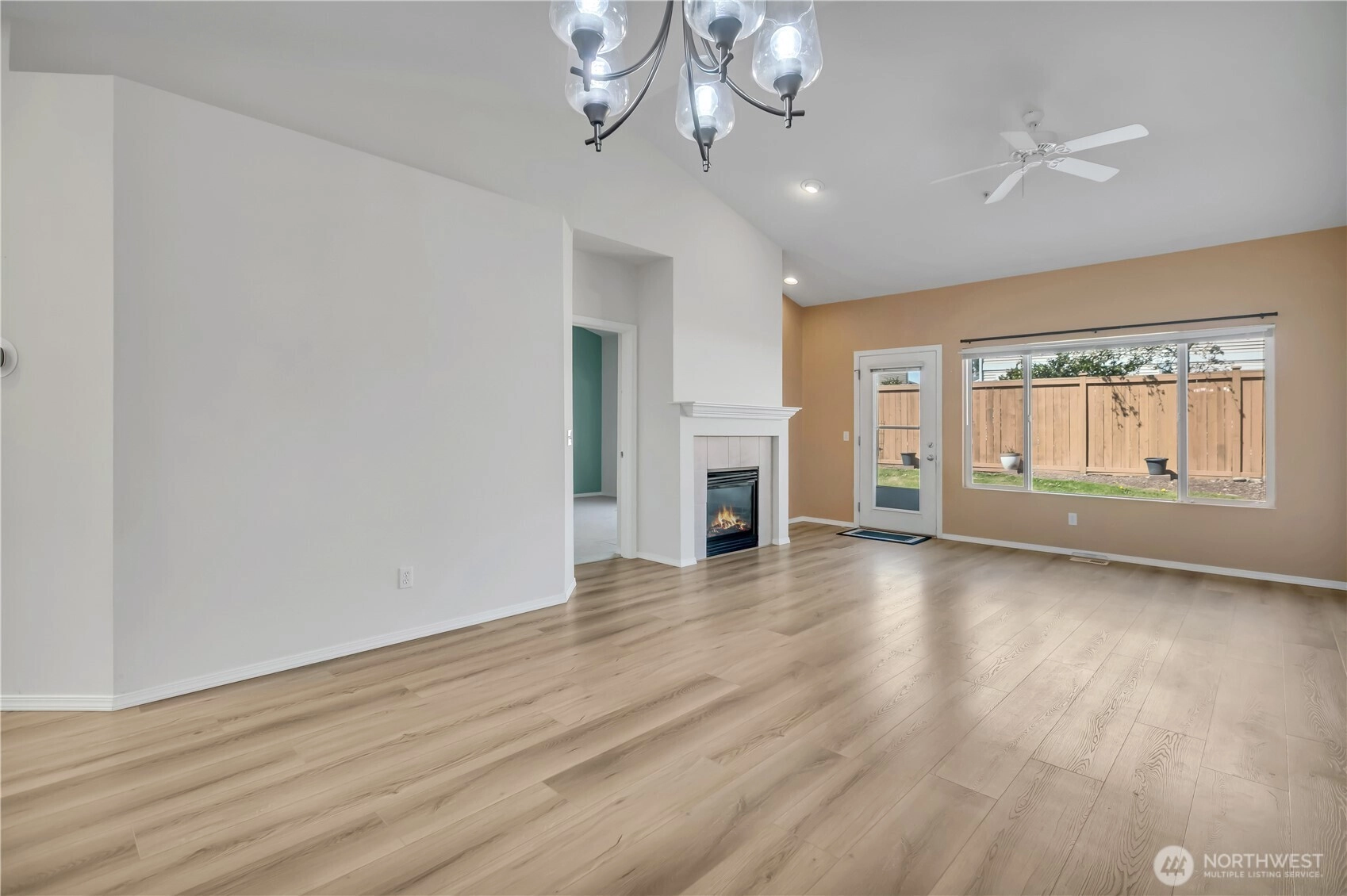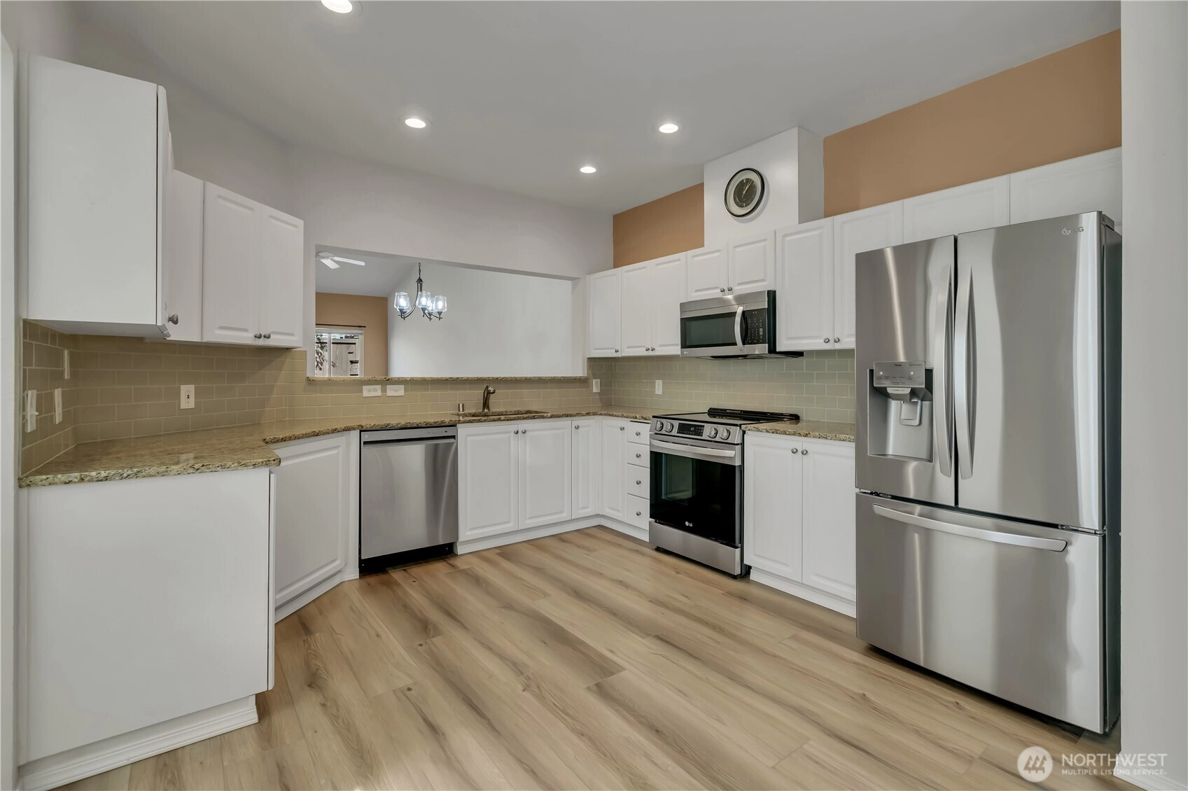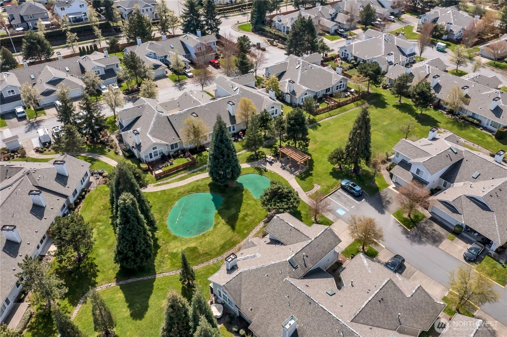 Welcome to this very well cared for ONE-level condo in the quiet, gated community of Waterford in Lakeland Hills. This wonderful home offers 2 bedrooms, 2 bathrooms, new laminate flooring throughout the open living spaces, with vaulted ceilings, & a gas fireplace. Big kitchen with white cabinetry, granite counters, kitchen nook space & newer stainless steel appliances. The passthrough from the kitchen looks into the open living & dining space. The primary suite also has vaulted ceilings, & an attached bathroom with new quartz counters & double sinks, a walk in closet & beautiful new walk-in shower. The guest room or office sits at the front of the home with a full guest bath. Great little patio/yard space out back, mostly fenced. Air conditioning to keep you cool all summer. Two car attached garage, with storage cabinets. Washer & dryer stay. Close to schools, parks, trails, & walkable to the Lakeland Shopping center. Enjoy low maintenance living ~ dues cover exterior of home, lawn maintenance, sewer & water, security gate, & a fun putting green!