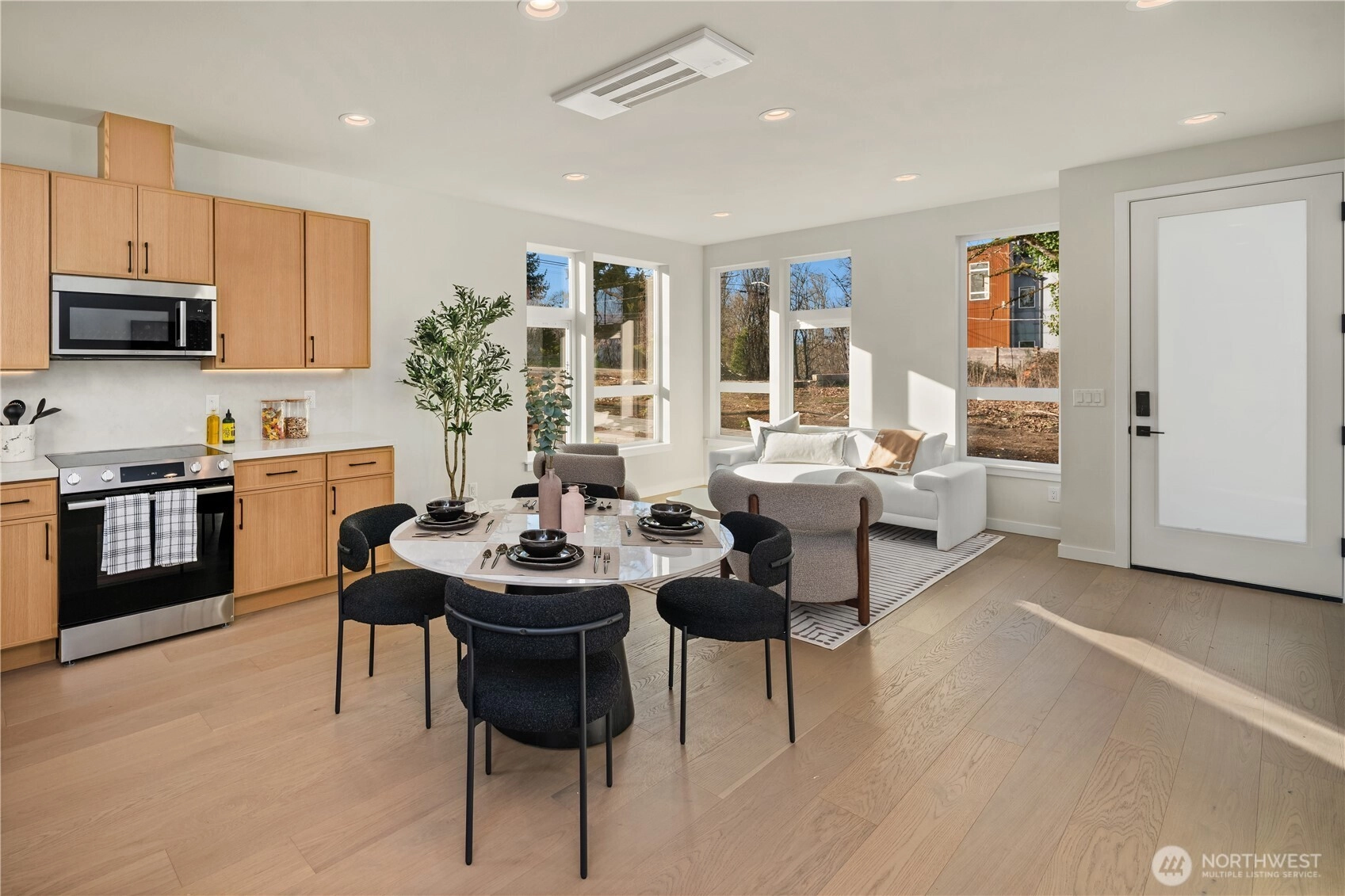 Introducing a beautifully crafted new home in West Seattle’s Highland Park, set on a quiet, tucked-away street for added privacy. Inside, you’ll find wall-to-wall engineered hardwoods, sleek quartz surfaces. with full height backsplash, and a high end Bosch and Liebherr appliance suite anchoring the kitchen. Comfort meets efficiency with advanced heating and cooling, while the primary bath delivers a spa-like feel with heated floors and refined lighting details, including LED under-cabinet and niche illumination. Generous storage solutions are integrated throughout the home for practical living without sacrificing design. Modern construction, thoughtful finishes, and a peaceful location make this one stand out from the typical new build.