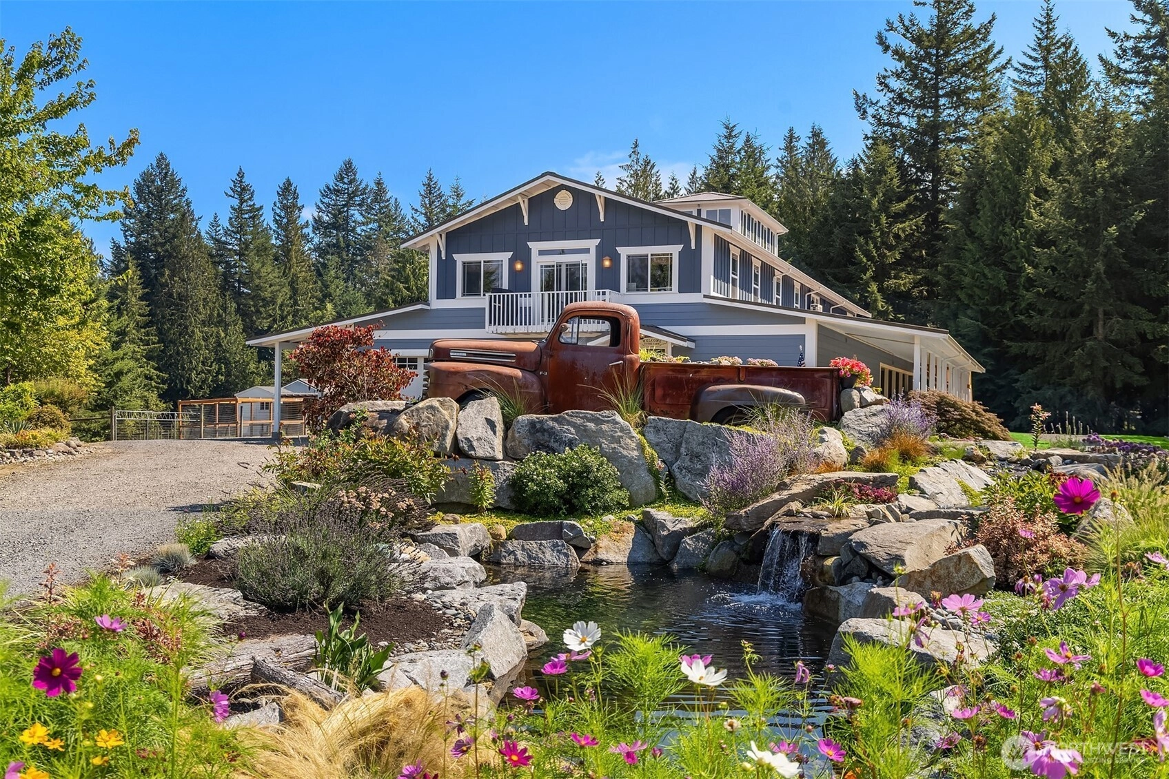 Some farms speak to your soul - their images linger deep within you as if you've lived there many lifetimes ago. It's all so familiar - a beautiful wrought iron gate opens to a sanctuary where you can unplug and reconnect to what is truly important. This farm gently whispers "you're home now". Whether you dream of a thriving hobby farm for your horses, goats and chickens, or simply crave a sequestered buffer from the world, this farm delivers on 20 acres of pristine Fall City land. The spacious 5-bedroom home offers flexibility for everyone, including an entry level guest ensuite and a generous bonus room on the main level for fun game nights! All features have been lovingly updated with finishes that align perfectly with the balance of the farm. After a day in the garden, relax by the charming vintage truck water feature or watch the sun go down from the unique clerestory lookout eagles nest room. This estate is fully equipped for your passions, featuring a massive garage with workshop space, a chicken coop, barn, additional stalls, and even a treehouse. Enjoy total rural seclusion without sacrificing access - you're just minutes away from Fall City or Snoqualmie and a quick jaunt to I-90. 6 stall barn permit ready to issue. Pre-inspected for peace of mind and award-winning Snoqualmie Valley School District.