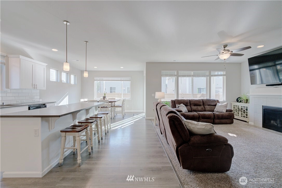 Gorgeous North Facing bright open-concept layout perfect for modern living at Hawks Ridge! The gourmet kitchen is a standout feature, complete with stainless steel appliances, ample counter space, and a spacious walk-in pantry. With a layout that lives like a 5-bedroom 2.5 bathrooms, it includes a generous primary suite, well-sized additional bedrooms, a versatile den, and a vaulted bonus room ideal for work, play, or relaxation. Enjoy a cozy family room with a gas fireplace, and plenty of natural light throughout. Step outside to a fully fenced backyard featuring a covered patio perfect for year-round entertaining. Additional highlights include a 3-car garage, a paved driveway with plenty of parking, and access to a nearby neighborhood park. Conveniently located just 30 minutes from JBLM with quick freeway access, this home offers both comfort and convenience. A perfect blend of style, space, and location come see it for yourself!