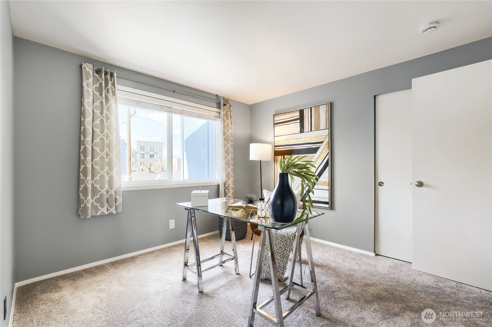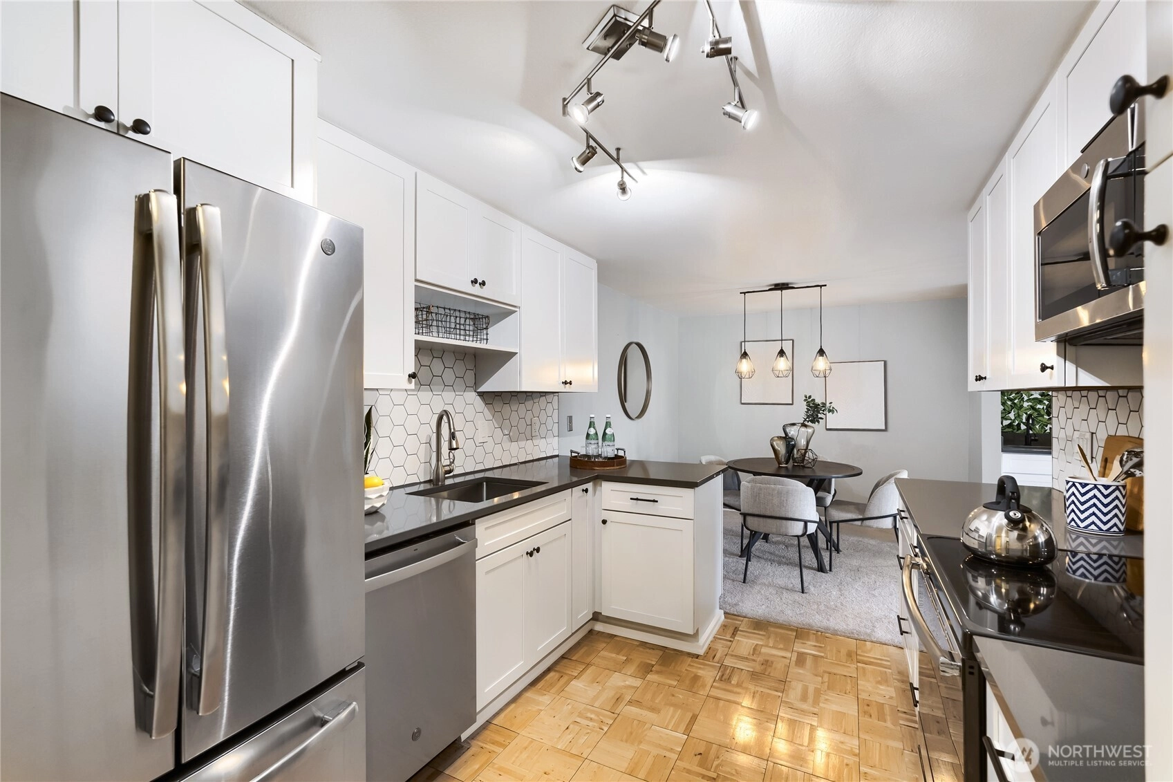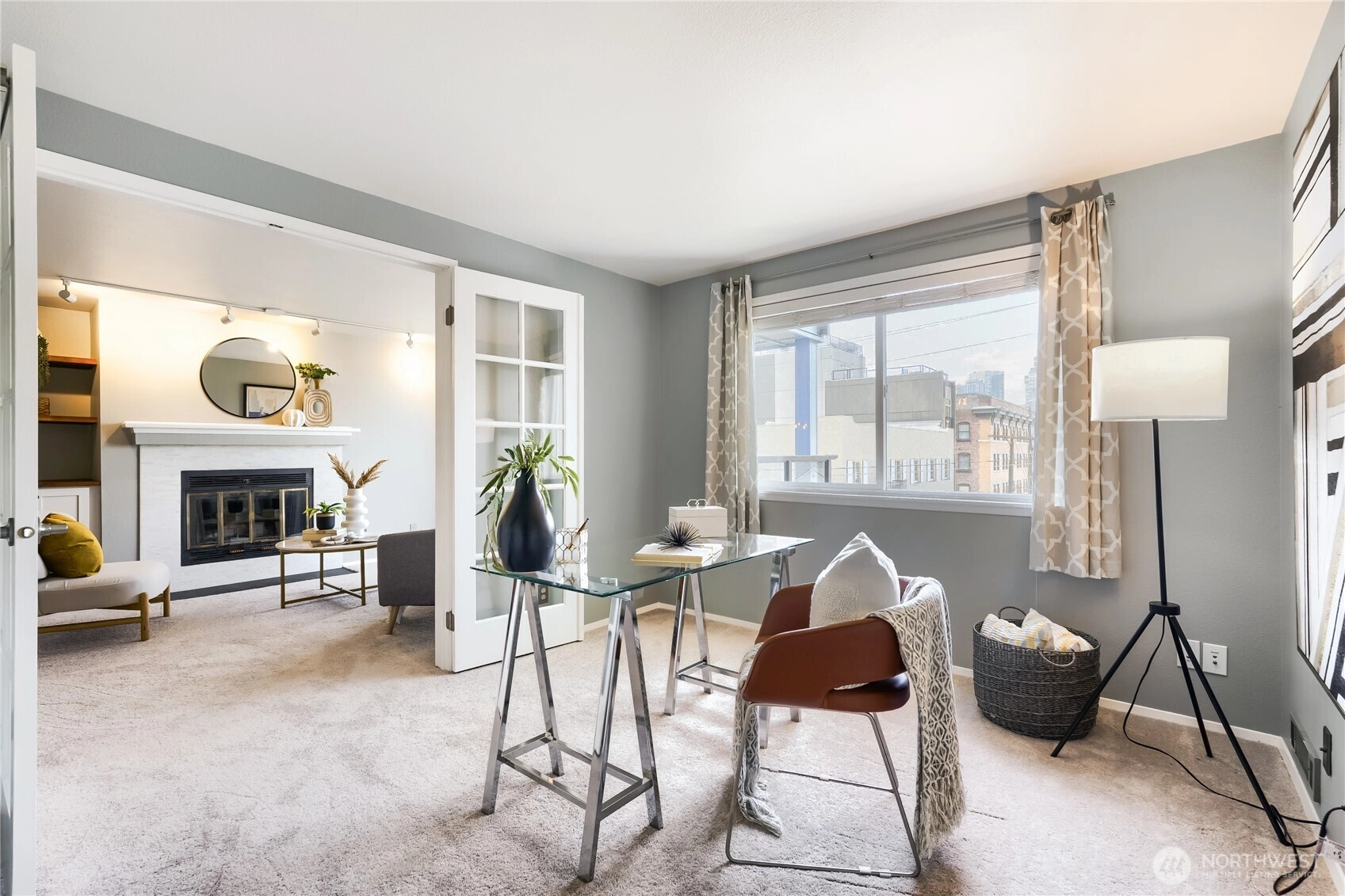 Feel the pulse & energy of the city from this fabulous urban landing pad in Capitol Hill! Everything you love about vibrant city living is at your doorstep: top-rated restaurants, fantastic nightlife, grocery options, scenic parks, community events & endless transit options. You'll love being so connected to everything! This bright third floor unit lives large & makes the most of every sqft, w/ thoughtful updates at every turn: fresh interior paint, new carpet, stylish wallpaper accents, chic lighting, & more. Become the host with the most & invite your whole friend circle over - you'll love to gather in the bright open living room looking out to city views, flowing easily into the dining area w/ a wet bar & kegerator, then into the sleek updated kitchen, equipped w/ stainless appliances, hex tile backsplash & updated counters/cabinetry. Both bedrooms are bright & airy w/ California closets to store all your gear. West-facing covered balcony looks out to twinkling city lights & gorgeous sunsets. In-unit laundry, dedicated garage parking + no rental cap = versatility, longevity & value. Tucked away on a quiet street, yet walkable to all the fun so you never miss a moment. Live your best life with downtown's best as your backdrop!