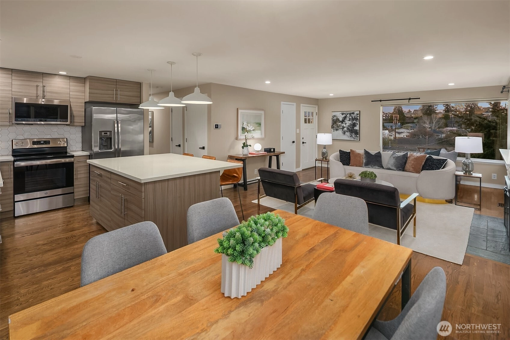 Modern updates highlight this spacious home that is near the best of West Seattle amenities. Perched above a quiet street, the property features well-maintained landscaping and adjacent forested greenbelt. With its bright interiors, the home has a welcoming energy that is enhanced by rich hardwood flooring and a fireplace anchoring the open-concept living area. Upgraded kitchen has stainless appliances, sleek quartz counters, and large island. Two bedrooms on main level, including primary with ensuite and walk-in closet. Incredible finished lower level boasts media room plus two additional bedrooms. Backyard oasis with expansive deck and a unique outbuilding for use as office or studio space. Layout is ideal for indoor-outdoor entertaining. Easy access to the fantastic restaurants, shops and cafes of Alaska Junction. Steps to elementary school and neighborhood park. Whole Foods, Trader Joe’s and LA Fitness are just minutes away.