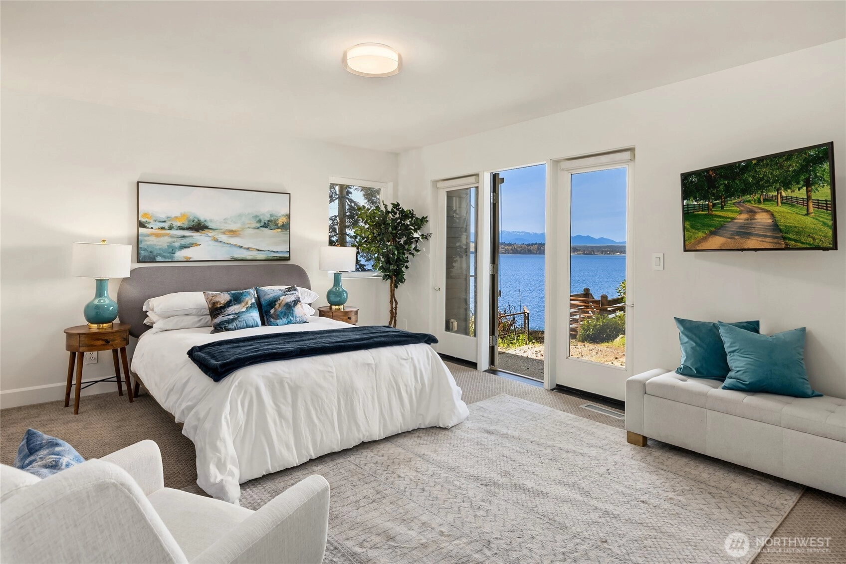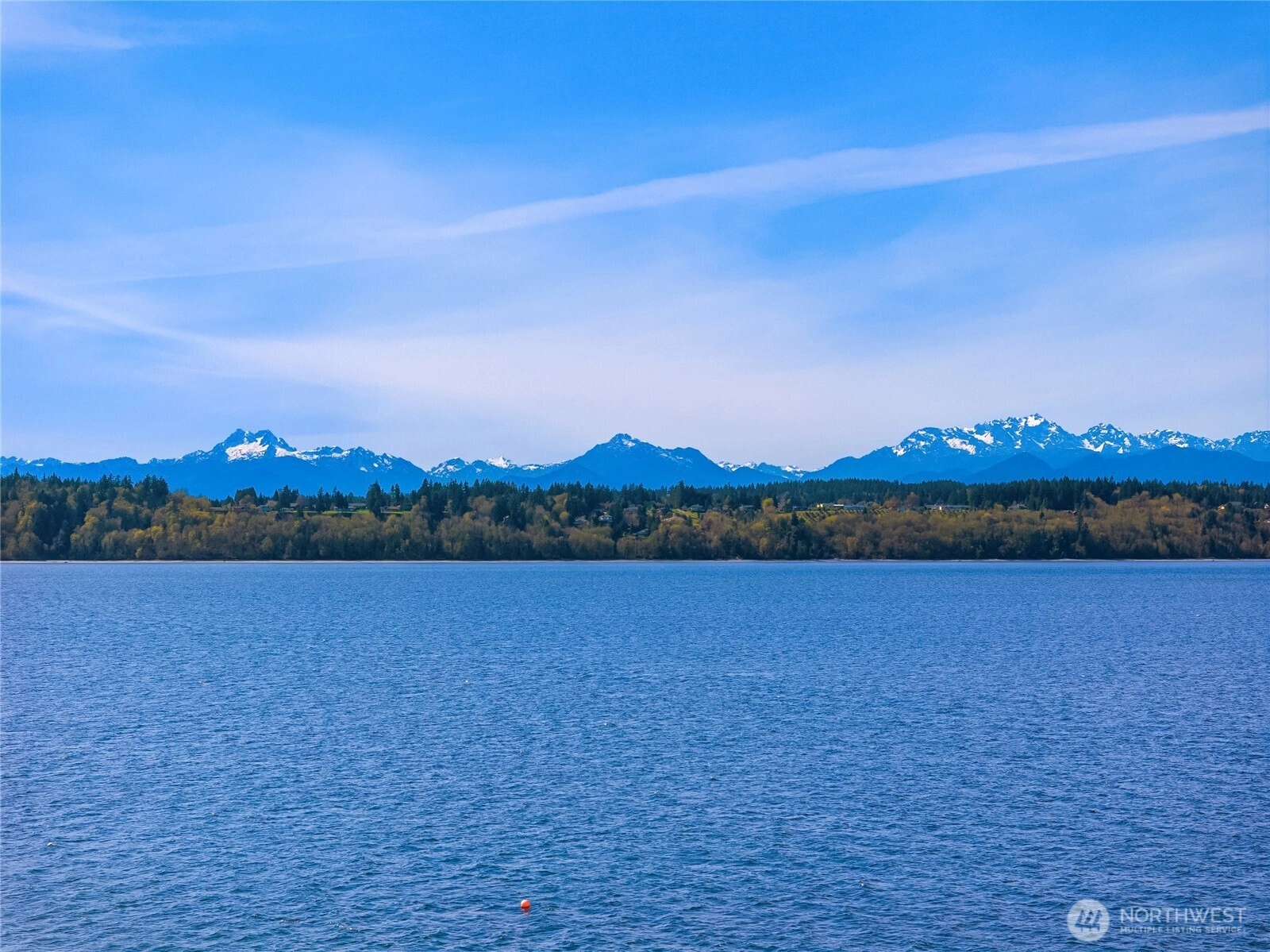 A refined expression of post-modernism by renowned Seattle architect John Brenneis, set in a stunning waterfront setting with sweeping Olympic Mountain and Puget Sound views from every room, abundant natural light, and unforgettable sunsets. Masterfully designed for both style and function, the airy open floor plan centers around a dramatic 2-story kitchen and dining space crowned by a pyramidal skylight. The layout offers 3 ensuite bedrooms plus an office, including a spacious primary suite with dual walk-in closets, a spa-like bathroom, and a private deck. The spacious main level invites indoor-outdoor living, with seamless access to the fully fenced waterside patio and landscaped yard, set against sweeping water and mountain views. Follow the solid beach stairs to your own ±90 feet of bulkheaded shoreline, dotted with oysters and anchored by a distinctive natural boulder, a rarity along Bainbridge’s shoreline, with your own deep-water mooring buoy for days on the water. Set on a quiet street with a tree-lined approach, the property includes partial ownership in the 4.7-acre forested lot across the road. In the highly sought-after Arrow Point neighborhood, an active island lifestyle is just a stroll away at Battle Point Park, offering 90 acres of open space, trails, ponds, summer concerts, and sports courts (pickleball, basketball, soccer, softball, tennis). A rare opportunity for those drawn to modern design, an active lifestyle, and waterfront living.